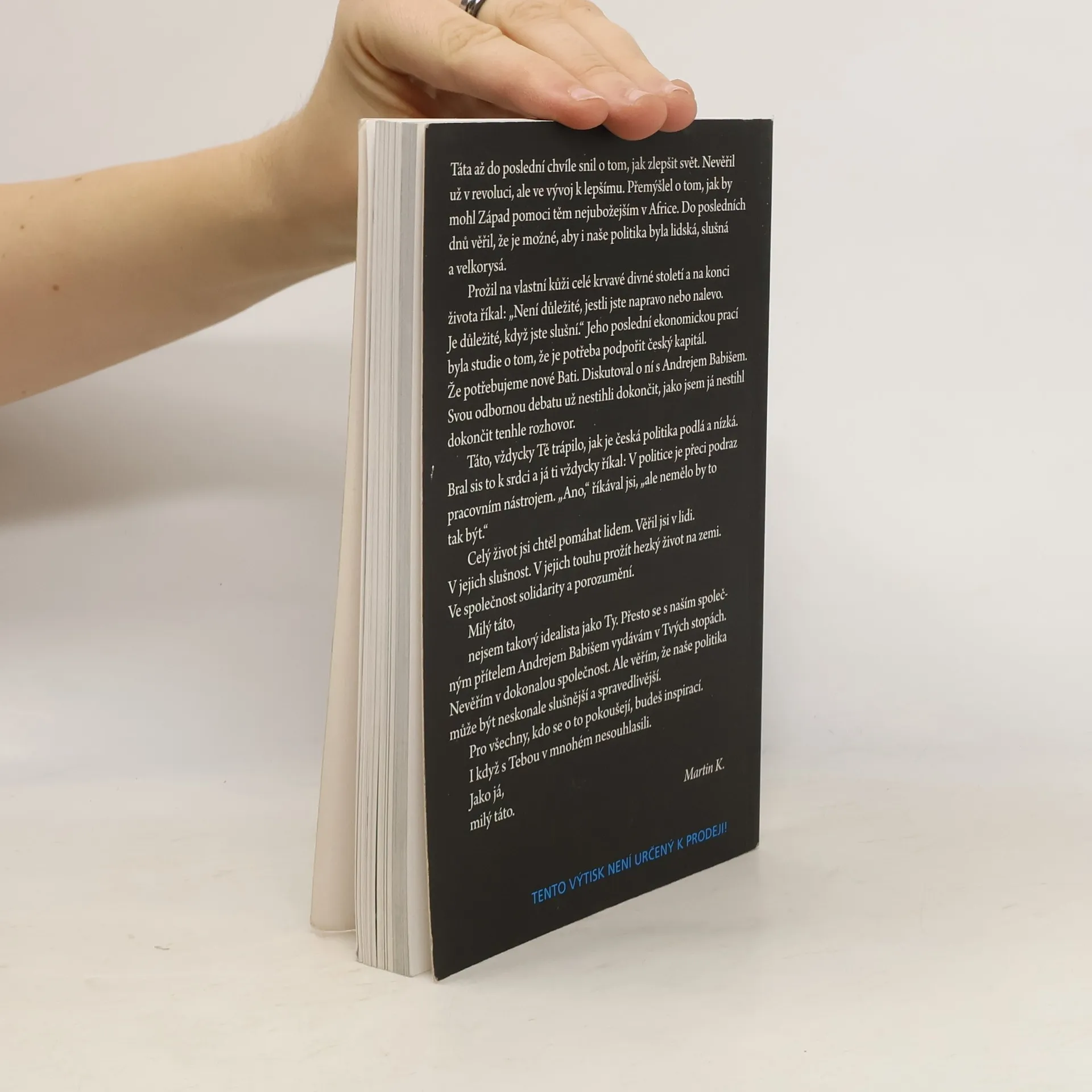 „Člověk nemá umírat. Je to největší nespravedlnost na světě. Přesto táta umřel,“ píše Komárek mladší ve své emotivní vzpomínce. Politický odkaz Valtra Komárka – jedné z nejvýraznějších postav Sametové revoluce, ekonoma, prognostika, ale v posledních letech především přesvědčeného humanisty. Připravovali jsme tuto knihu více než rok a bohužel se rozhovor již nepodařilo dokončit, přesto přináší mnoho zajímavého (viz. následující citáty): O Klausovi v době normalizace „On nikdy sebemenším způsobem neprotestoval… Nepochybuji, že někde po straně si pak postěžoval na nějakou nedostatečnou moderní vědeckost a nedostatečné znalosti, ale rozhodně do žádného konfliktu nešel.“ O zlodějích „Já bych řekl, že Klaus nekrade, jeho motivací je obrovská ješitnost. Takoví jednodušší lidé, praktičtí, jako Gross, bývalý strojvůdce, mají jako motivaci peníze. Rath je taková povaha – bonviván, frajer, dobrodruh, rádoby James Bond. On má rád sladký život a nutně potřebuje k životu velké peníze.“ O Havlovi „On se stal nakonec obětí pokřiveného vědomí svého historického poslání a soustředil se na to nejpříjemnější – vytvářet image v zahraničí, tomu věnovat svůj pobyt na Hradě, domácí starosti nechat jiným.“ Rozhovor je doplněn emotivními vzpomínkami Martina Komárka na tátu a dokresluje tak onu nesmírně lidskou dobrou povahu Valtra Komárka, kterou jsme z jeho vystupování mohli tušit. Nechybí fotografie z rodinného archivu i z ČTK.