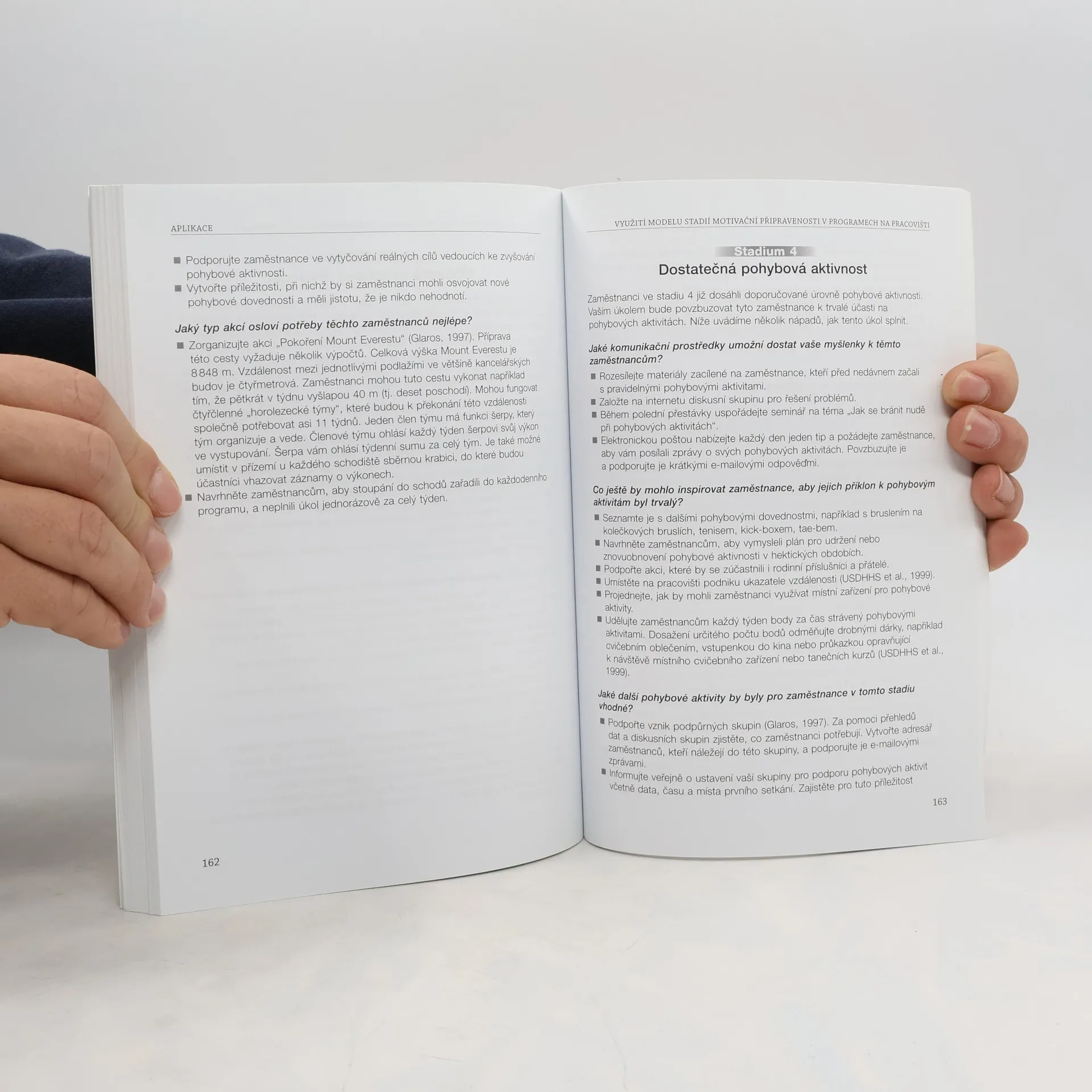 Motivace lidí k pohybovým aktivitám. Kniha popisuje experimentálně ověřené metody, které mají lidem pomoci překonat sedavý způsob života a zvyknout si na pravidelný, zdraví podporující pohyb. Pohybové aktivity v moderním pojetí nutně neznamenají intenzivní cvičení. Věnuje-li se člověk v dostatečné míře středně namáhavým, ale běžným aktivitám, jakými jsou například svižné procházky v přírodě, pohybová hra s dětmi nebo mnohé práce na zahradě, je pohybově aktivní. Publikace obsahuje mnoho praktických příkladů, přehledů a především dotazníků, které mohou čtenáři sami vyhodnotit. Je tedy určena jak pro zaměstnance ve sportovních centrech a fyzioterapeuty, kteří připravují individuální a skupinové plány zaměřené na zvyšování tělesné aktivnosti, tak pro lidi, kteří by se sami rádi stali pohybově aktivními. Bess H. Marcusová, Ph.D., a LeighAnn H. Forsythová, Ph.D., jsou klinickými psycholožkami a profesorkami v oblasti prevence zdraví a behaviorálních věd na amerických univerzitách.