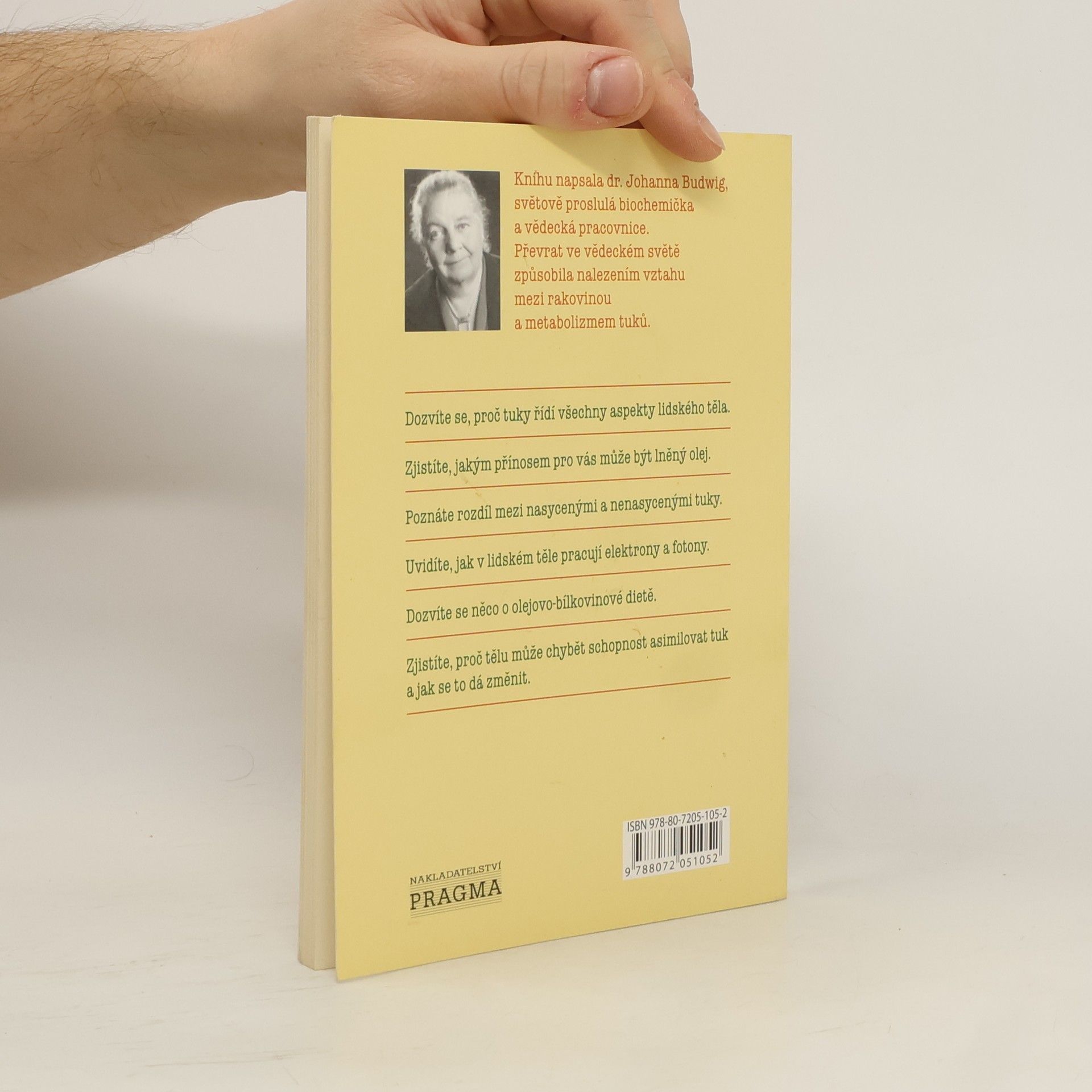Kihu napsala dr. Johanna Budwig, světově proslulá biochemička a vědecká pracovnice, sedmkrát nominovaná na Nobelovu cenu. Převrat ve vědeckém světě způsobila nalezením vztahu mezi rakovinou a metabolizmem tuků. -Dozvíte se, proč tuky řídí všechny aspekty lidského těla. -Zjistíte, jakým přínosem pro vás může být lněný olej. -Poznáte rozdíl mezi nasycenými a nenasycenými tuky. -Uvidíte, jak v lidském těle pracují elektrony a fotony. -Dozvíte se něco o olejnato-proteinové dietě. -Zjistíte, proč tělu může chybět schopnost asimilovat tuk a jak se to dá změnit.
