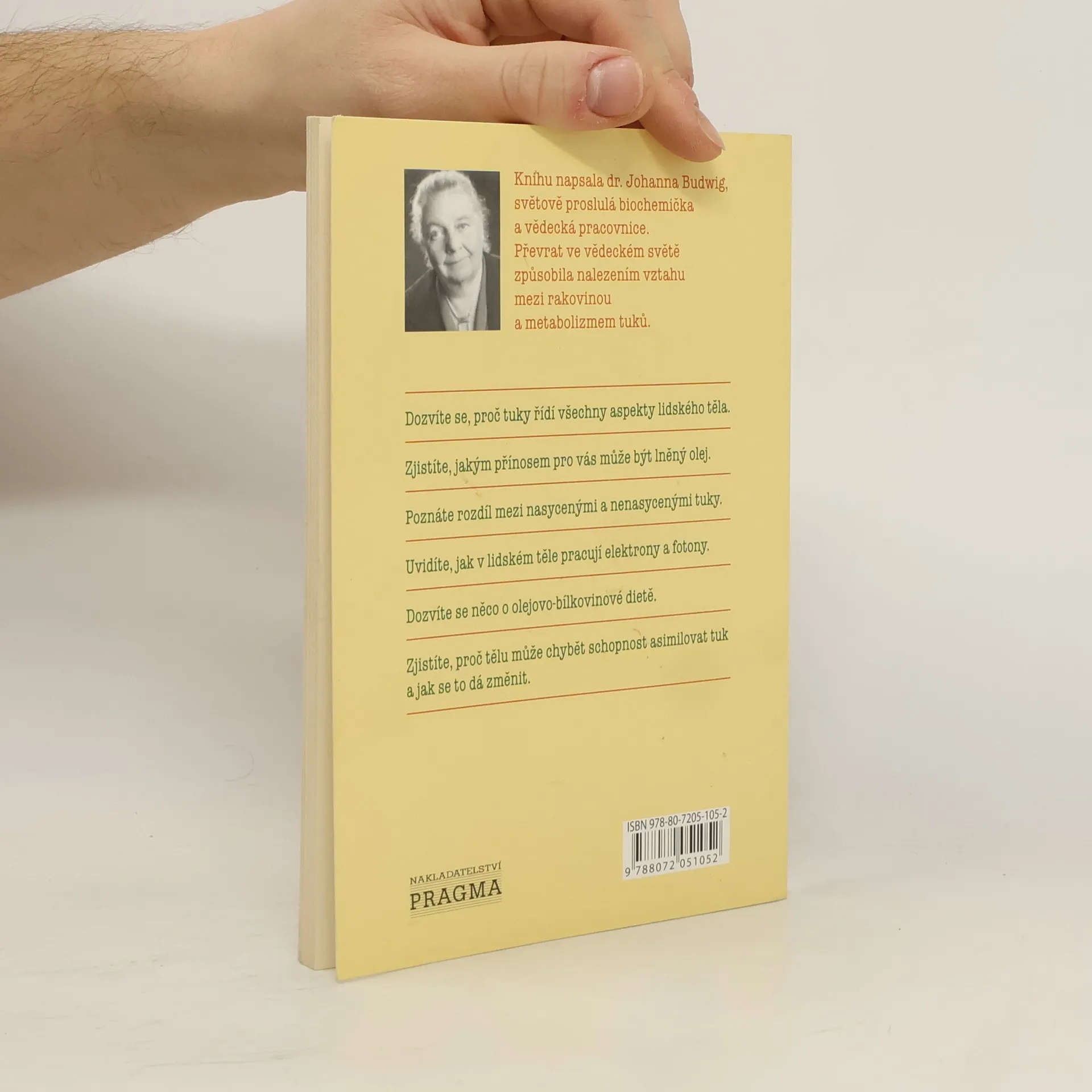 Kihu napsala dr. Johanna Budwig, světově proslulá biochemička a vědecká pracovnice, sedmkrát nominovaná na Nobelovu cenu. Převrat ve vědeckém světě způsobila nalezením vztahu mezi rakovinou a metabolizmem tuků. -Dozvíte se, proč tuky řídí všechny aspekty lidského těla. -Zjistíte, jakým přínosem pro vás může být lněný olej. -Poznáte rozdíl mezi nasycenými a nenasycenými tuky. -Uvidíte, jak v lidském těle pracují elektrony a fotony. -Dozvíte se něco o olejnato-proteinové dietě. -Zjistíte, proč tělu může chybět schopnost asimilovat tuk a jak se to dá změnit.