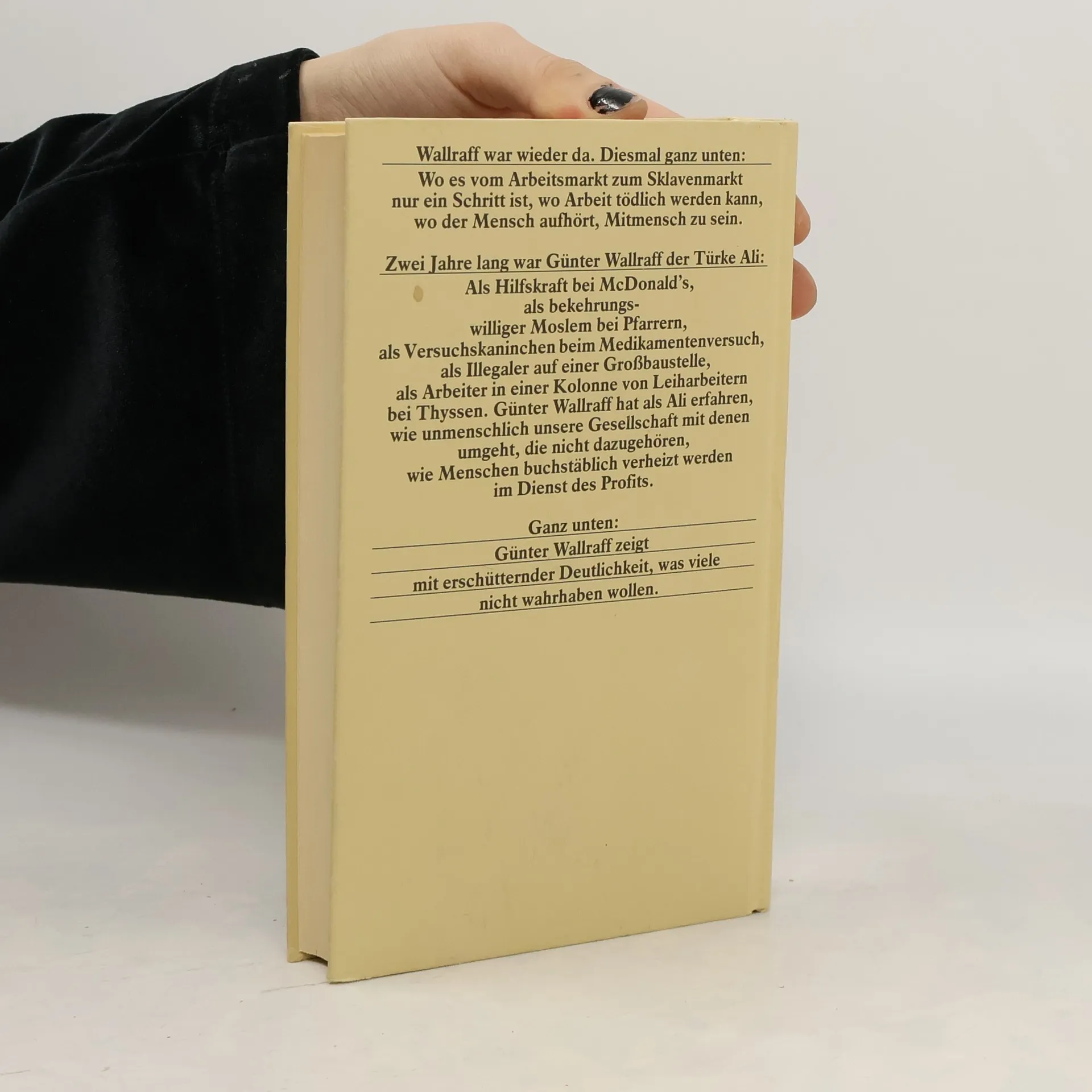 Günter Wallraffs Erfahrungsbericht als Türke Ali wurde mit einer deutschsprachigen Auflage von über 4 Millionen und Übersetzungen in mehr als 30 Ländern zu einem sensationellen Bucherfolg mit "durchschlagender politischer Wirkung" (Süddeutsche Zeitung). Elf Jahre nach seinem ersten Versuch erlebte Wallraff 1984 die bundesdeutsche Realität aus einer Perspektive, die für Deutsche sonst unzugänglich ist, und machte Erfahrungen, die eher an das südafrikanische Apartheidsregime erinnern als an den vielgerühmten demokratischen Rechtsstaat. In seiner Rolle als Türke Ali Levent arbeitete er unter anderem bei McDonald's, als Leiharbeiter auf einer Großbaustelle und als Versuchskaninchen bei einem Medikamentenversuch. Er erlebte, wie Türken als "der letzte Dreck" behandelt werden, gebraucht als "Lückenbüßer" der Wirtschaft und als Billigarbeitskräfte für gefährlichste Arbeiten. Trotz gesundheitlicher Schäden und Demütigungen fand Wallraff auch Positives: die Solidarität und Freundschaft seiner Kollegen. Anders als während seiner Zeit in der BILD-Redaktion konnte er ein Stück seiner Identität bewahren, auch wenn er diese nicht offenbaren durfte. Die Veröffentlichung seiner Erfahrungen in dem Buch Ganz unten (Oktober 1985) führte zu einem enormen Echo in Medien, die das Thema Leiharbeit aufgriffen und Druck auf Politiker und Unternehmer ausübten. In Nordrhein-Westfalen wurden zahlreiche illegale Leiharbeitsfirmen von der Staatsanwaltschaf
