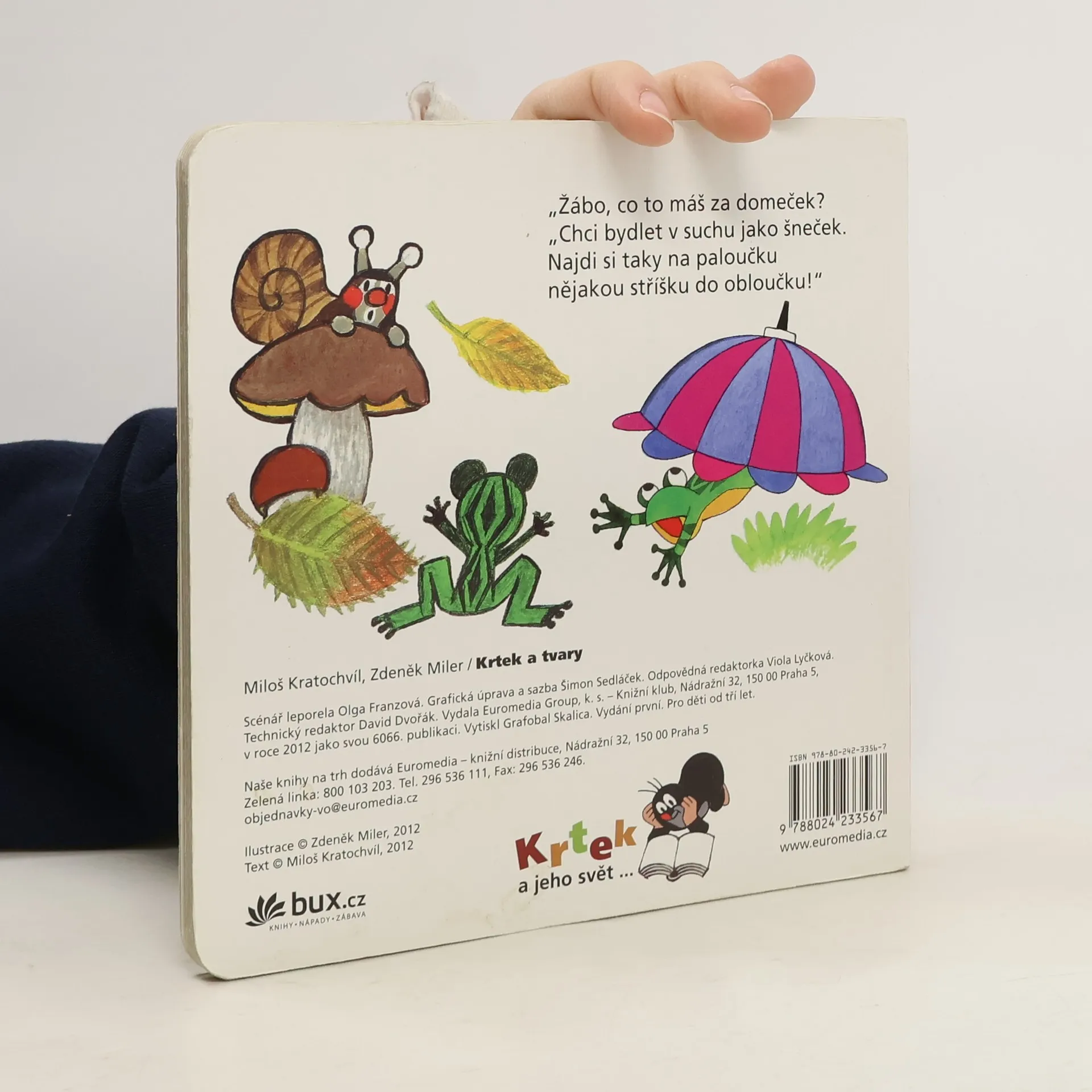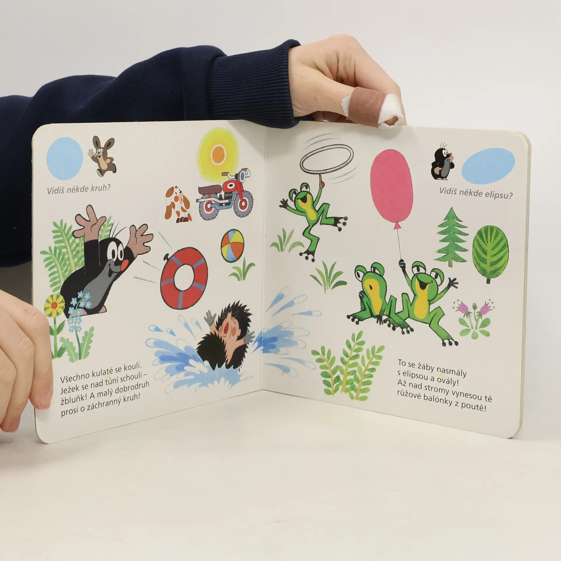 Devátý z řady příběhů pro nejmenší čtenáře o tom, co všechno umí neposedný krteček a jeho zvířecí kamarádi, se věnuje poznávání základních tvarů ve světě kolem nás. Krtek a jeho kamarádi děti tentokrát naučí, jak poznat čtverec, spirálu, kruh či kapku. Doplněno návodnými otázkami. Verše napsal Miloš Kratochvíl.