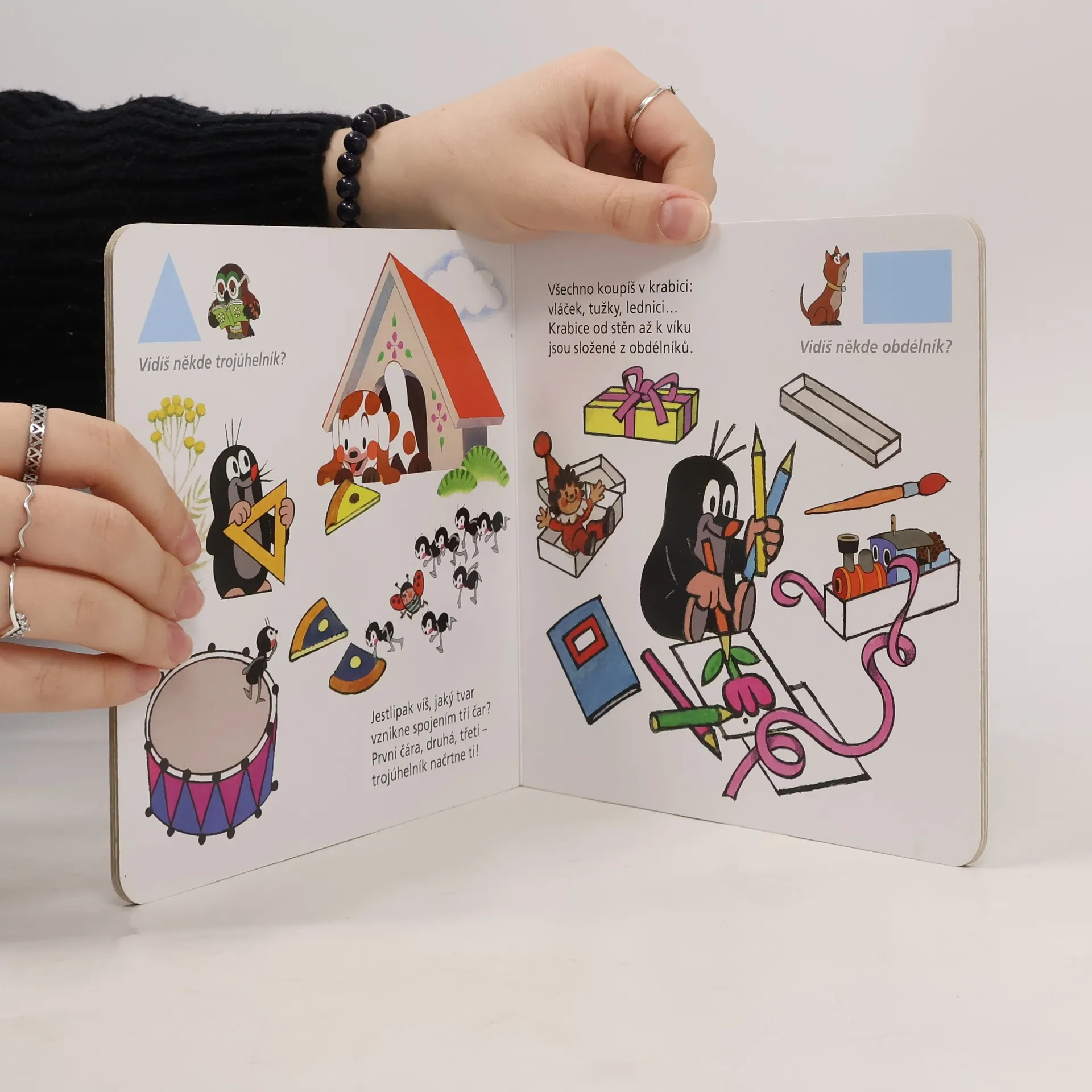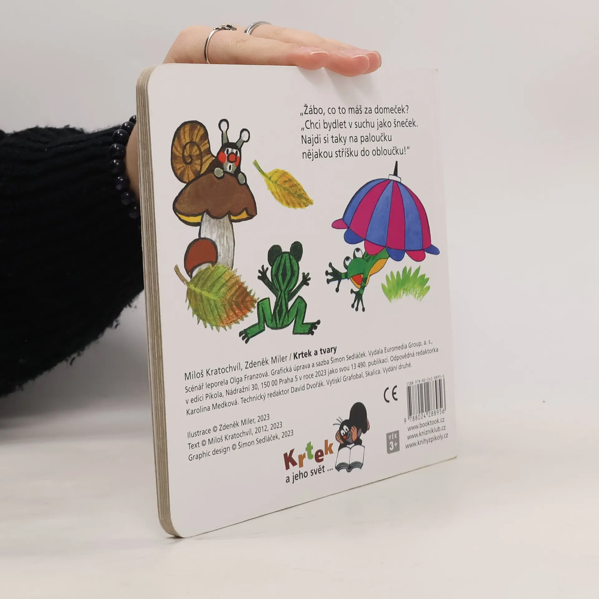 Devátý z řady příběhů pro nejmenší čtenáře o tom, co všechno umí neposedný krteček a jeho zvířecí kamarádi, se věnuje poznávání základních tvarů ve světě kolem nás. Krtek a jeho kamarádi děti tentokrát naučí, jak poznat čtverec, spirálu, kruh či kapku. Doplněno návodnými otázkami.