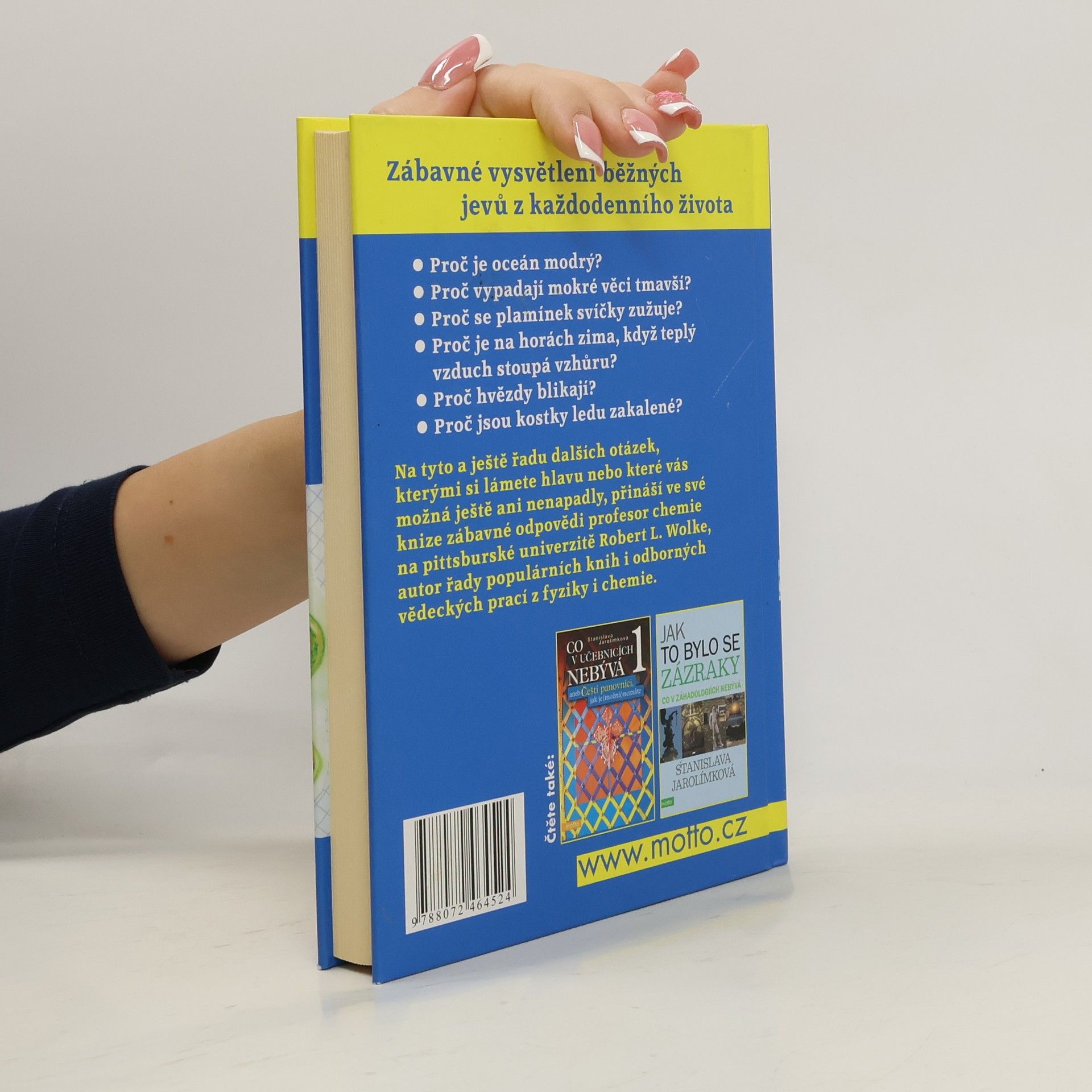 Zábavné vysvětlení běžných jevů z každodenního života. Profesor chemie na pittsburské univerzitě Robert. L. Wolke ve své úspěšné knize přináší zábavné odpovědi na řadu otázek, s kterými si dennodenně lámete hlavu, např. proč vypadají mokré věci tmavší, proč hvězdy blikají či proč se plamínek svíčky zužuje.