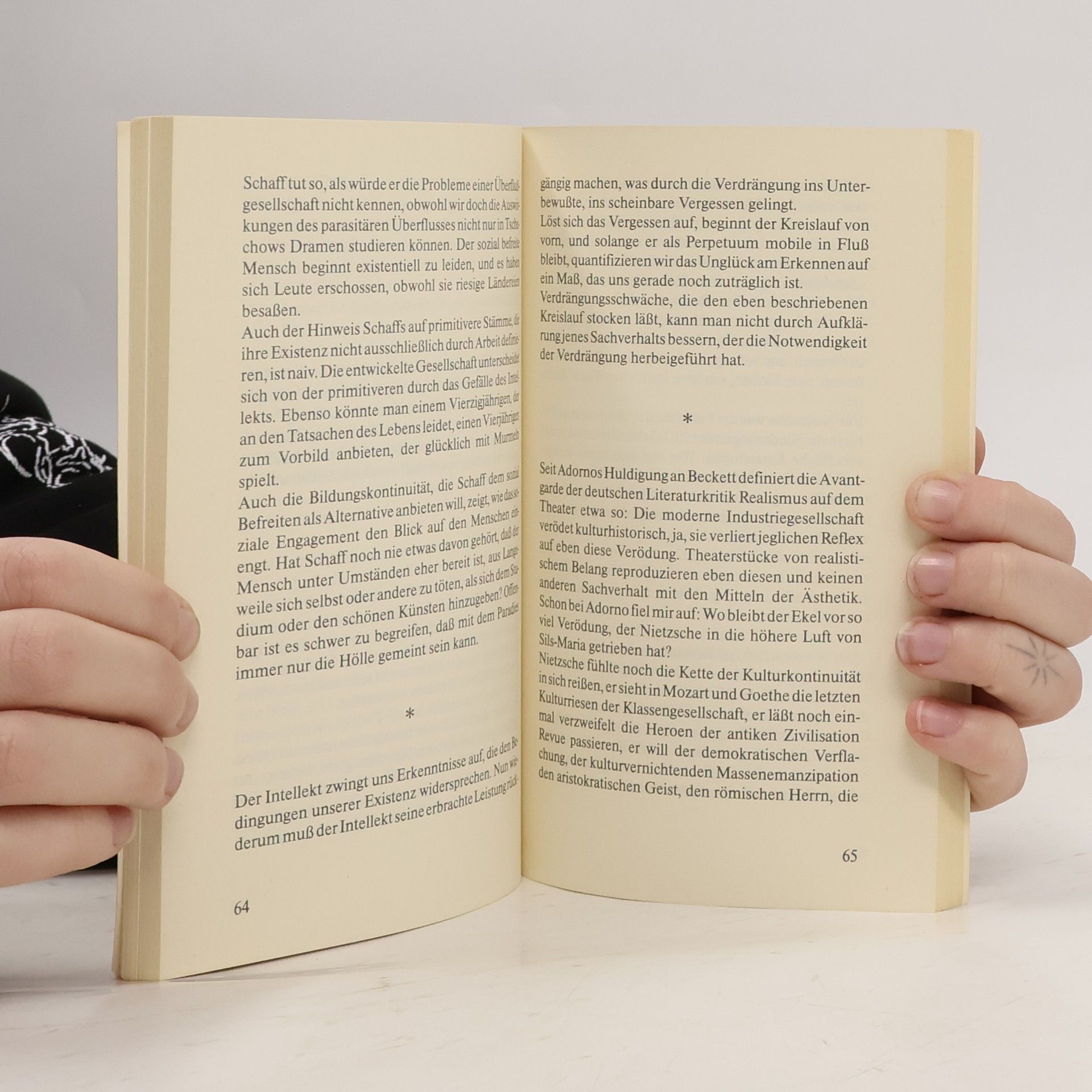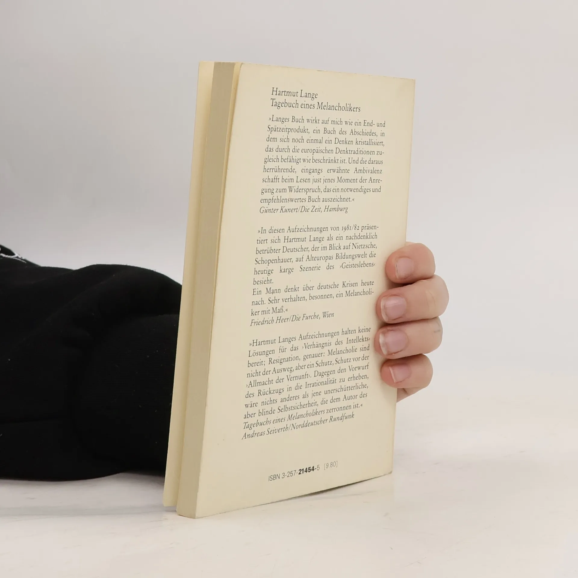 »In diesen Aufzeichnungen von 1981/82 präsentiert sich Hartmut Lange als ein nachdenklich betrübter Deutscher, der im Blick auf Nietzsche, Schopenhauer, auf Alteuropas Bildungswelt die heutige karge Szenerie des ›Geisteslebens‹ besieht. Ein Mann denkt über deutsche Krisen heute nach. Sehr verhalten besonnen, ein Melancholiker mit Maß.«