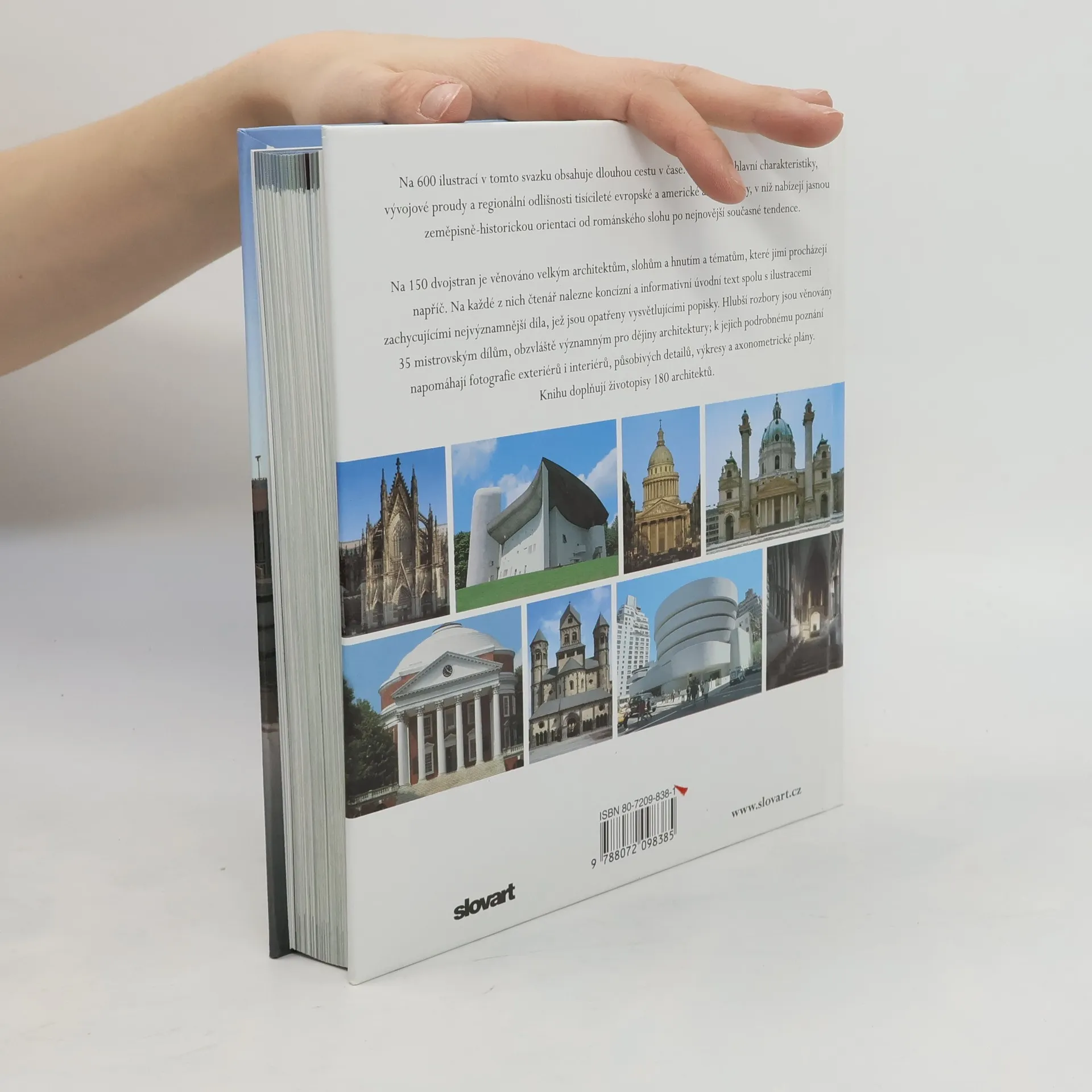 Nový typ přehledného zpracování vývoje a představitelů světové architektury. Velice rozsáhlá publikace představuje hlavní charakteristiky, vývojové proudy a regionální odlišnosti tisícileté evropské a americké architektury, v níž nabízejí jasnou zeměpisně-historickou orientaci od románského slohu po nejnovější současné tendence. Na 150 dvojstran je věnováno velkým architektům, slohům a hnutím a tématům, které jimi procházejí napříč. Hlubší rozbory jsou věnovány 35 mistrovským dílům, obzvláště významným pro dějiny architektury. K jejich podrobnému poznání napomáhají fotografie exteriérů i interiérů, působivých detailů, výkresy a axonometrické plány. Knihu doplňují životopisy 180 architektů. Rozsáhlá publikace se skládá ze dvou hlavních částí: Atlasu a příloh. Atlas zahrnuje 148 témat, z nichž o každém se pojednává na dvoustraně, a k nim se připojují další detailní a hlubší informace o 36 mistrovských dílech architektury všech dob. Každá strana je charakterizovaná záhlavím, ve kterém je uveden název, místo a doba a barevný pruh, odlišující jednotlivé architektonické styly: románský sloh, gotika, renesance, baroko a rokoko a historicismus. Přílohy jsou pojaty jako informativní pomůcka k Atlasu.