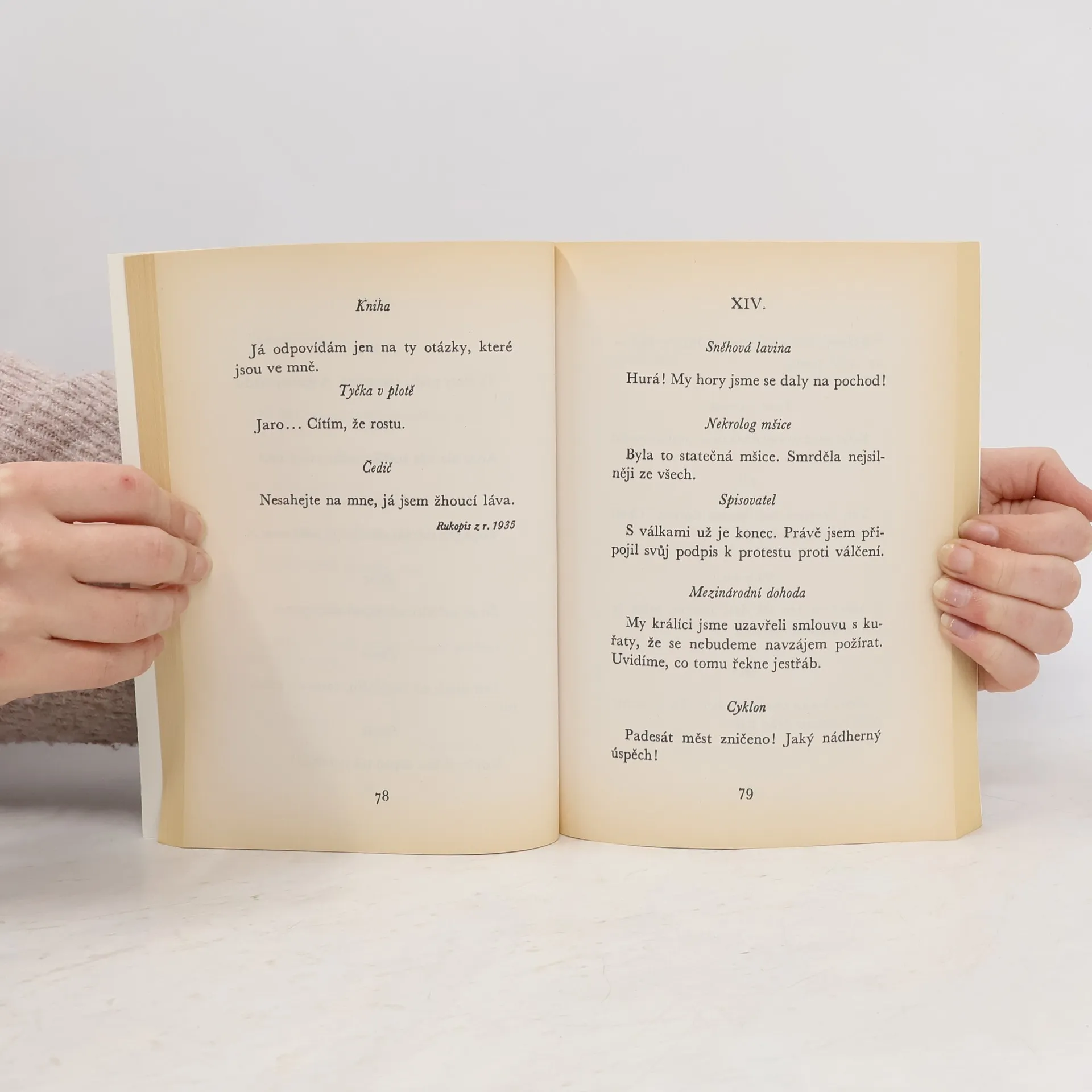 Reprint vyd. z r. 1946. Je to oslnivý kaleidoskop myšlenek, nápadů a postřehů, jež jsou stejně vtipné, bezprostředně působivé, útočné a výchovné ať se obírají člověkem, zvířetem, přírodou, věcmi, dějinami, literaturou, anebo reagují na politické dění a mobilizují lidi i svět proti válce.