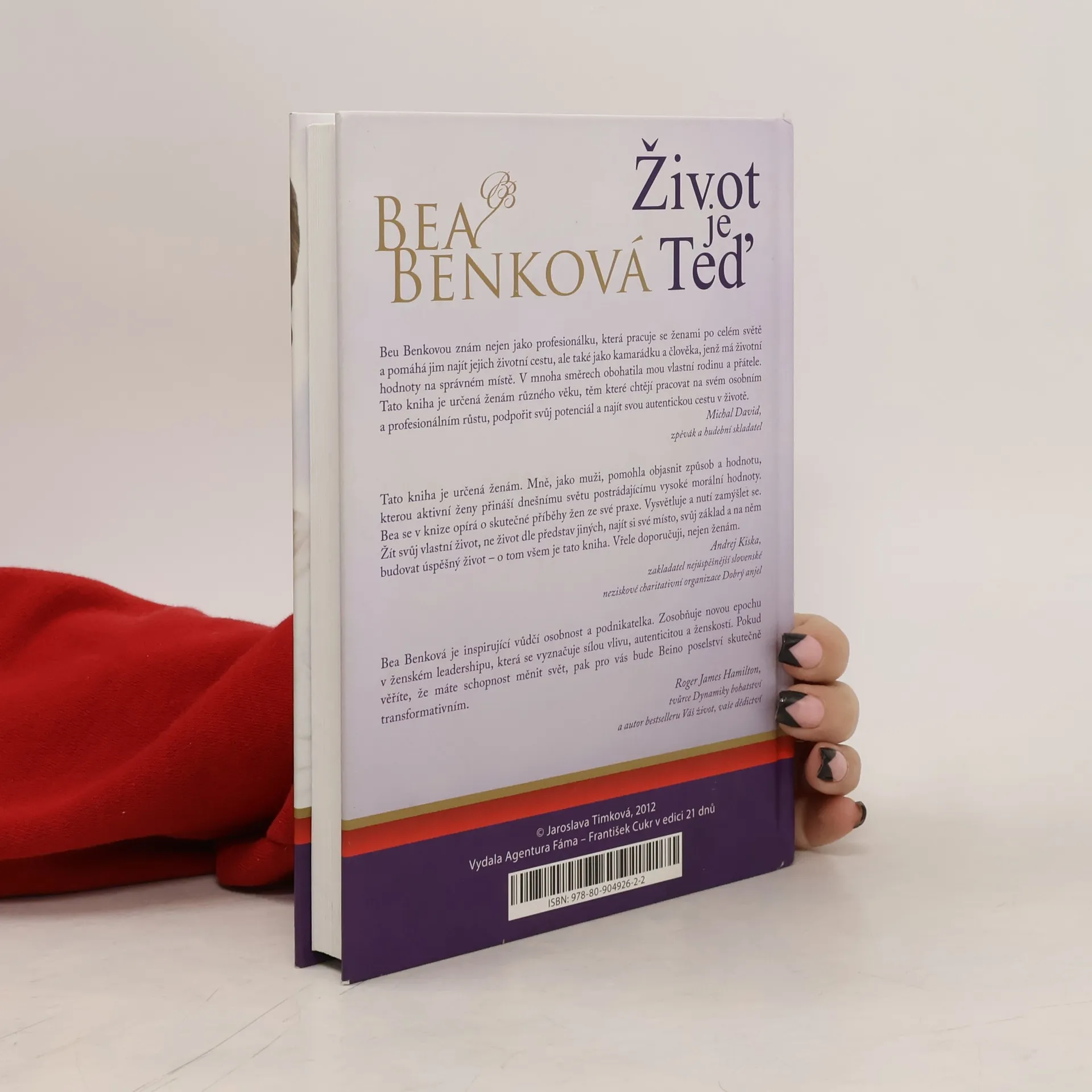 Novinka v edici 21 dnů! Interview s ambasadorkou výjimečných žen, Beou Benkovou, ve kterém novinářka Jaroslava Timková odkrývá nejen její soukromí, ale i hluboké nitro. Mapuje její vývoj od dětství, přes úspěšnou kariéru bankéřky v londýnské bance až k dnešnímu poslání mentorky a koučky, k němuž ji přivedly nemoc a předčasná smrt maminky. Prožitá bolest jí donutila naplno si uvědomit, že život je teď! Cokoliv podstatného odložíme na jindy, jako bychom odložili vlastní život… Z příběhů klientek, ale i toho svého, Bea Benková vytěžila řadu návodů, inspirací a technik pro osobní růst a budování vztahů. Kniha je psaná přívětivou lehkou formou a přináší čtenářům inspiraci i návod, jak prožít úspěšný, šťastný a naplněný život.