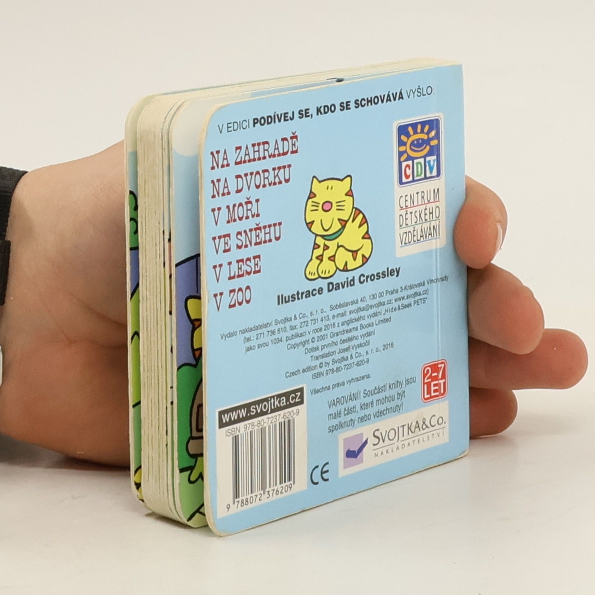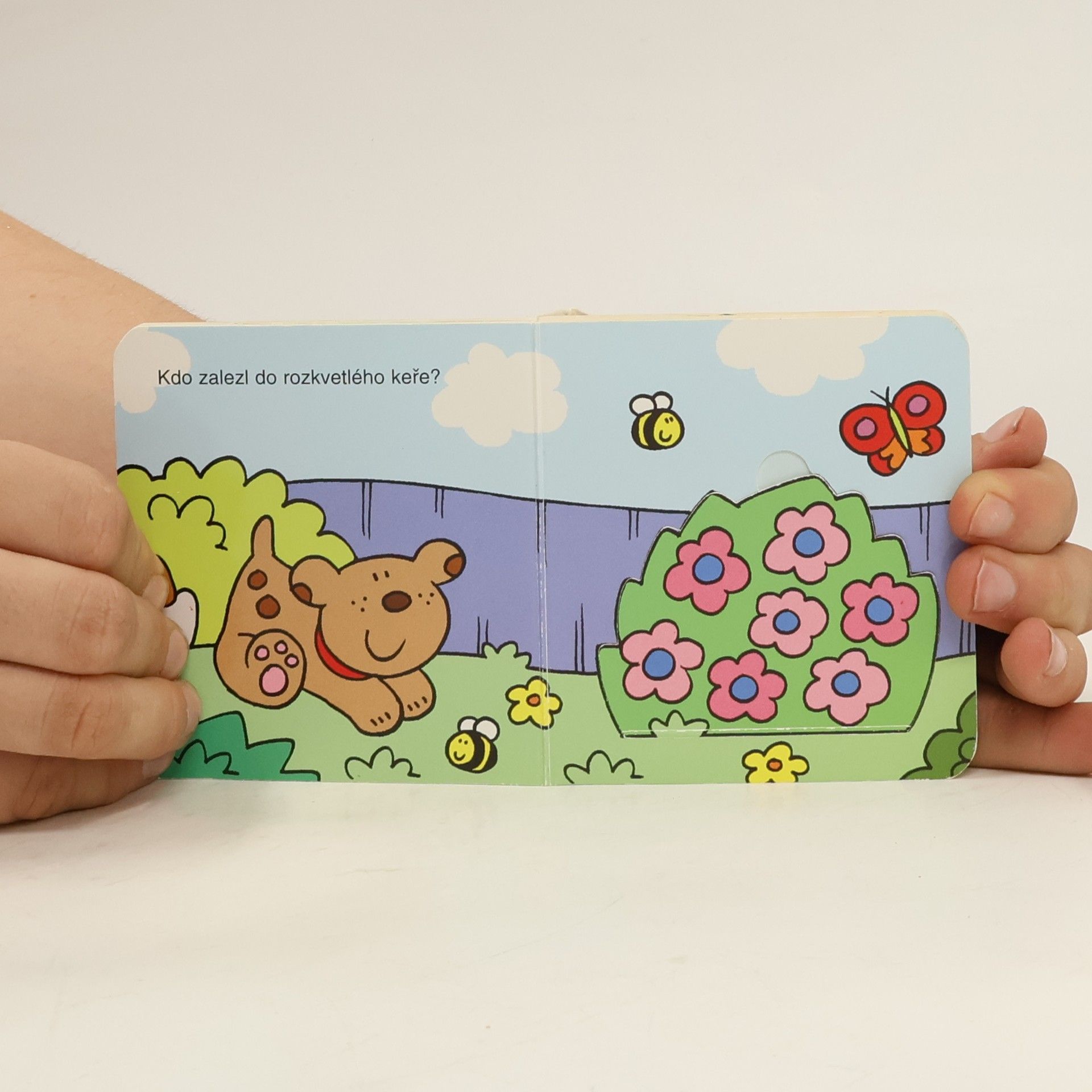 Por děti od jednoho do šesti let. Malá knížečka plná obrázků. Na každé dvojstraně je na první stránce pejsek s otázkou kdo se schovává např. pod lekníny v jezírku - na druhé straně je jezírko a když "odklopíte" jezírko, zjistíte, že je tam rybička ...