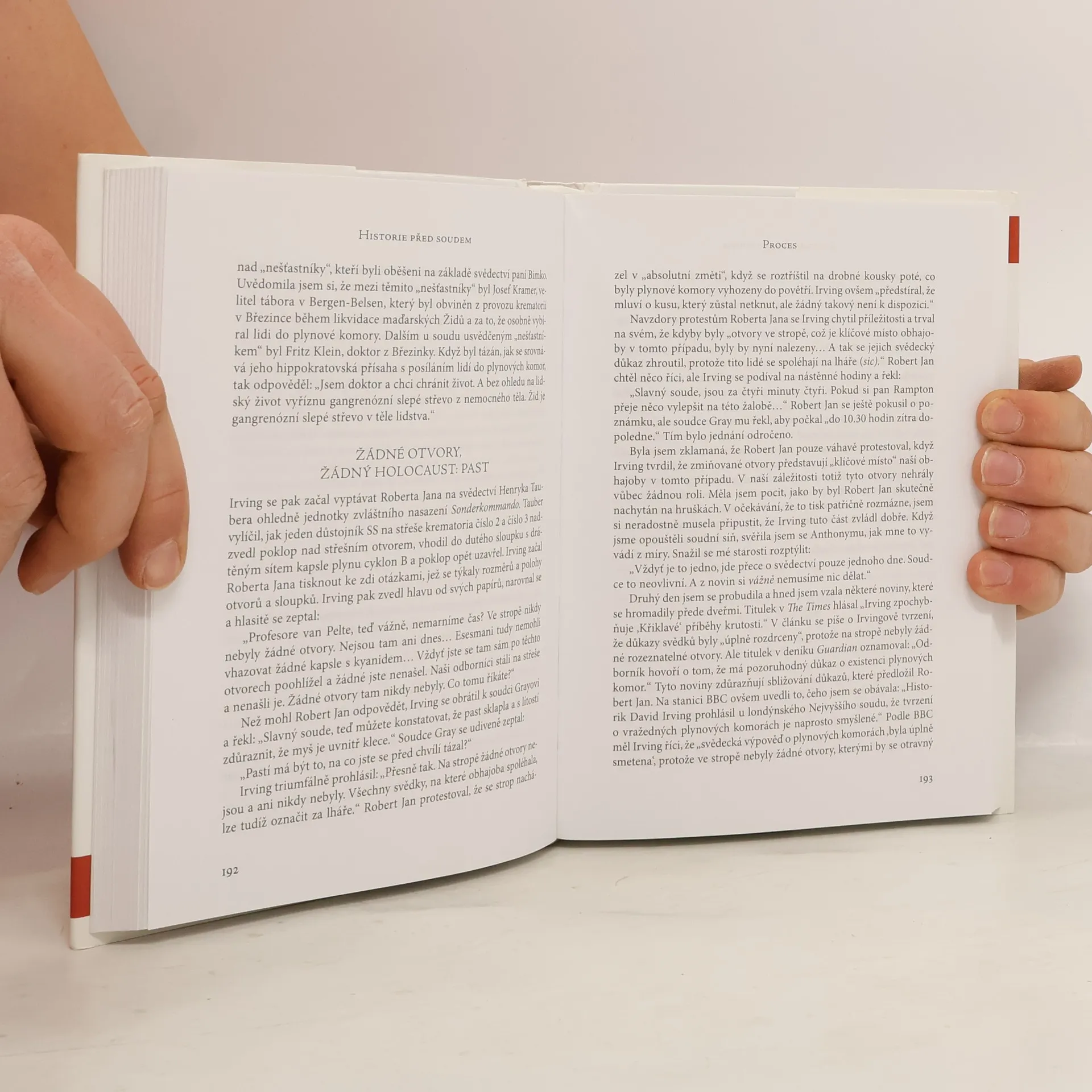 Kniha zaznamenává přípravy a průběh autorčina soudního procesu s Davidem Irvingem, kterého ve své předchozí knize Popírání holocaustu označila za propagátora popíračského hnutí. Irving požadoval omluvu, finančí náhradu a stažení knihy z prodeje, protože jej dehonestuje. Z přebalu: Kniha Historie před soudem, dílem ananlýza historie, dílem výsledek pozorování dramatu v soudní síni, přesahuje historiografii druhé světové války a holocaustu a nastavuje zrcadlo špinavému způsobu, s jakým extremismus a záměrné zkreslování historie získávají široké uznání a pomáhají šířit nenávist. Inspirující osobní příběh úporné vytrvalosti a nakonec i nečekaného obrovského úspěchu je vlastně příběhem procesu testujícího normy historické a právní pravdy. Procesu, o kterém londýnský list Daily Telegraph prohlásil, že "znamená pro nové století to, co pro dřívější generace znamenal norimberský tribunál a proces s Eichmannem".