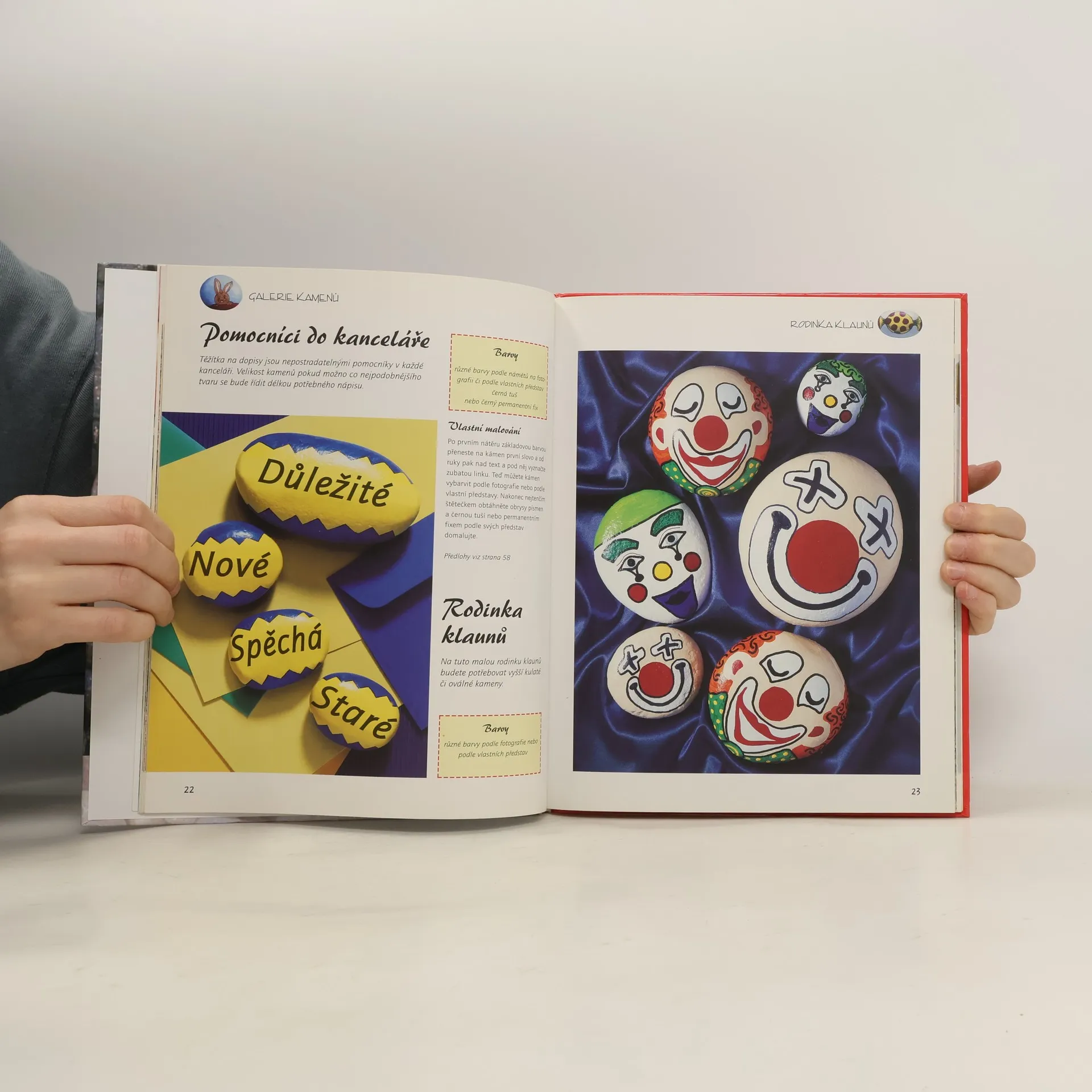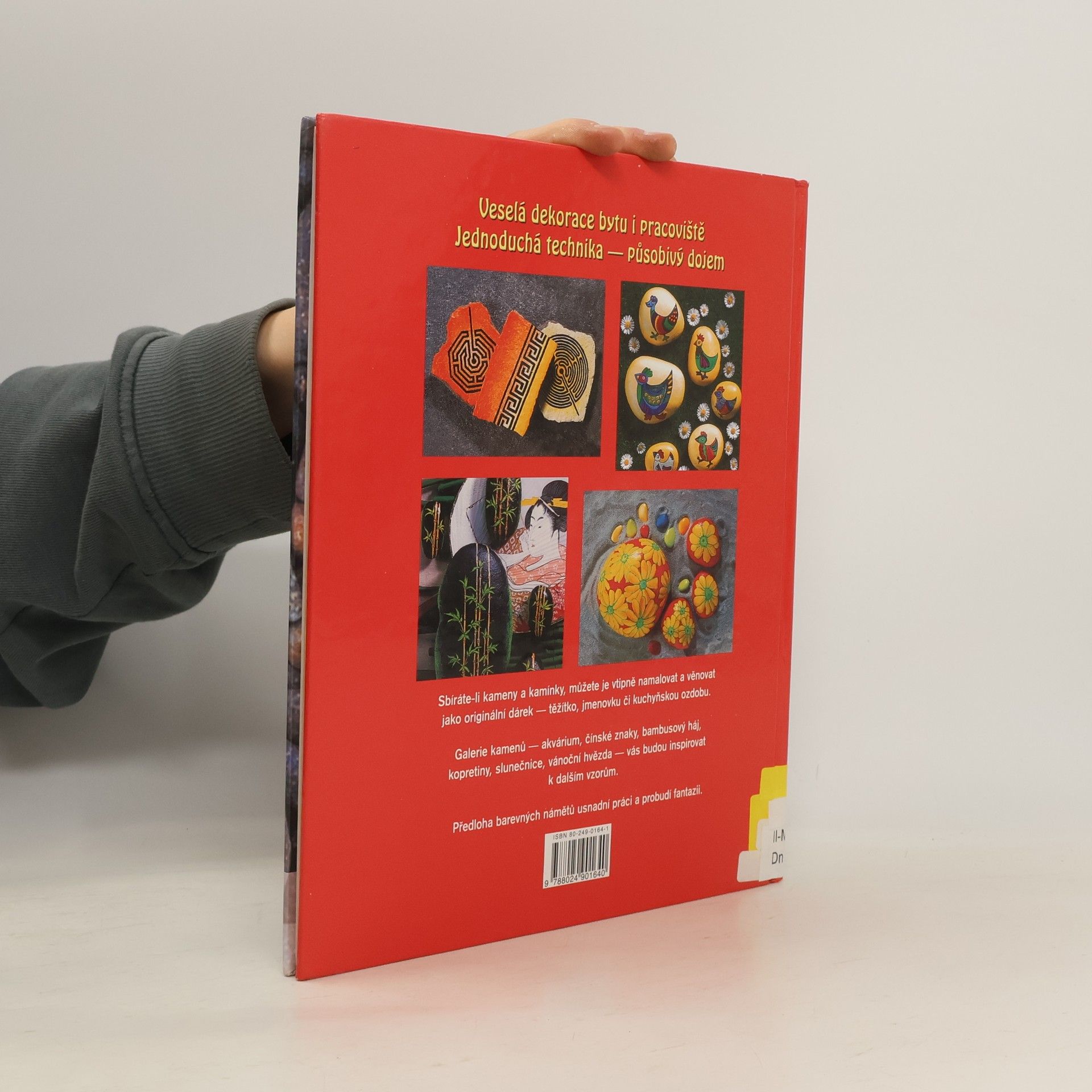 Veselá dekorace bytu i pracoviště. Jednoduchá technika - působivý dojem. Sbíráte-li kameny a kamínky, můžete je vtipně namalovat a věnovat jako originální dárek - těžítko, jmenovku či kuchyňskou ozdobu. Galerie kamenů - akvárium, čínské znaky, bambusový háj, kopretiny, slunečnice, vánoční hvězda - vás budou inspirovat k dalším vzorům. Předloha barevných námětů usnadní práci a probudí fantazii.