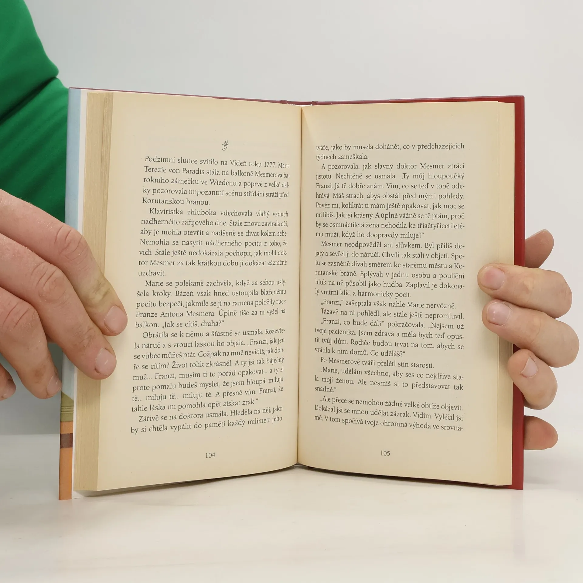 Když Wolfgang Amadeus Mozart navštívil svého přítele, léčitele Franze Antona Mesmera, měl jenom jedno přání: aby Mesmer uzdravil slepou klavíristku Marii Terezii von Paradis. Mladá umělkyně, která již slaví úspěchy, je kmotřenkou císařovny Marie Terezie. Mesmer nejprve Mozartovo přání odmítá. Když ale jednoho dne pozná krásnou Marii Paradisovou na koncertě v Schönbrunnu, okouzlí ho její půvab a na první pohled se do ní zamiluje. Navzdory silnému odporu z řad kolegů lékařů, stoupenců školské medicíny, se Mesmer rozhodne klavíristce pomoci. Na pozadí nemilosrdného boje mezi školskou medicínou a přírodním léčitelstvím, který tou dobou zuří v celé Evropě, autor vypráví tklivý příběh klavíristky Marie Terezie von Paradis, podle níž je dodnes pojmenována ulička v 19. vídeňském okresu, a přírodního léčitele Franze Antona Mesmera, jehož působení představuje počátky vítězného tažení alternativní medicíny.