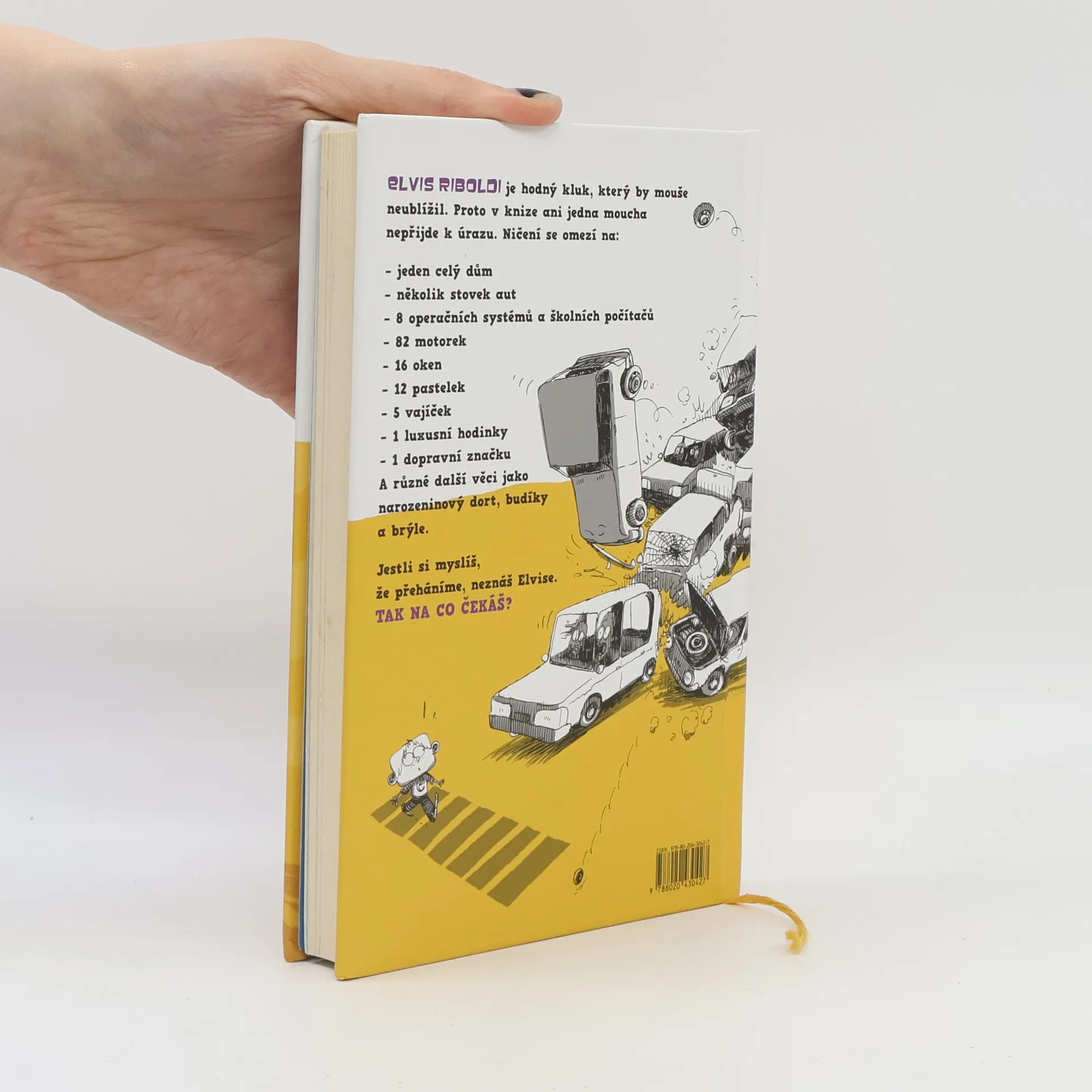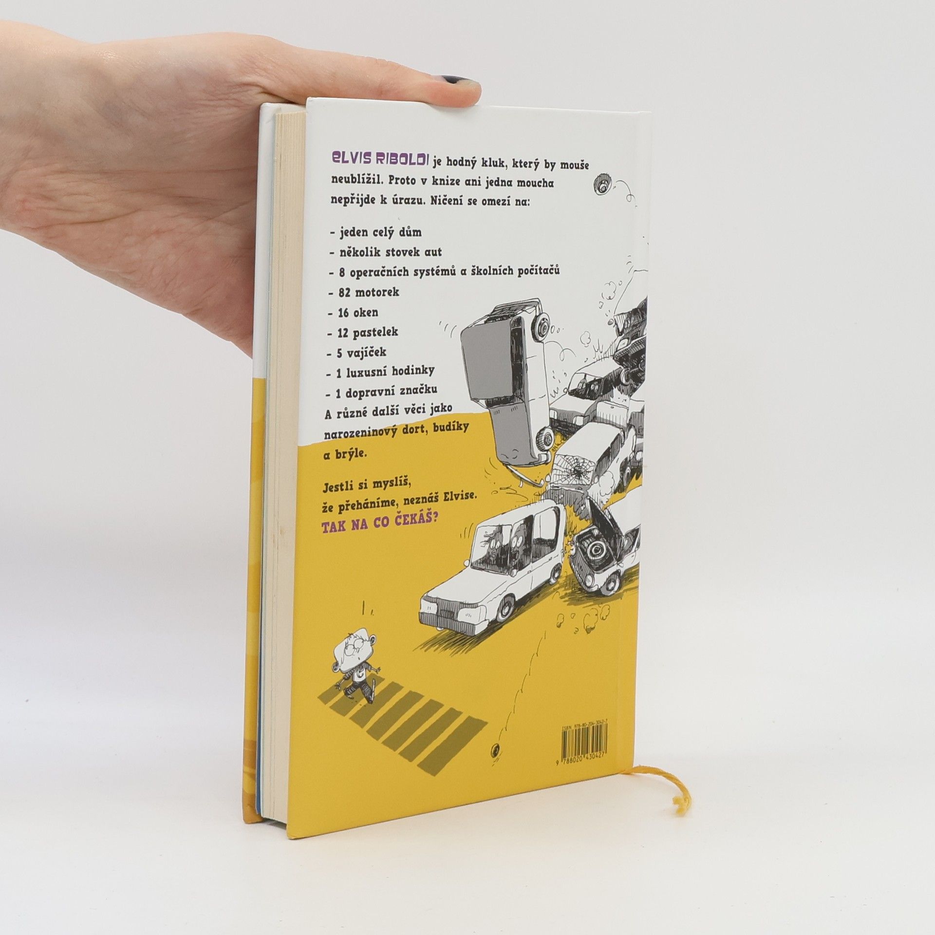Elvis Riboldi je kluk, který by ani mouše neublížil. Proto také v této knize žádná moucha k úrazu nepřijde, bohužel ostatní takové štěstí nemají. Kam Elvis přijde, tam způsobí rozruch, nic před ním není v bezpečí. Je schopný zapálit dům, zničit najednou přes sto aut a motorek, rozbíjet okna, jíst tužky, vymazat školní operační systém, rozbíjet jak vajíčka, tak luxusní hodinky a spoustu dalších maličkostí, speciálně brýle svého přítele Borise nebo třeba svůj narozeninový dort. Zní jako malé převtělení ďábla, že? Ne všechno je, jak se zdá, a i Elvis má ke svému chování rozumné vysvětlení. Objevte ho ve vtipné knize pro děti i pro dospělé.
