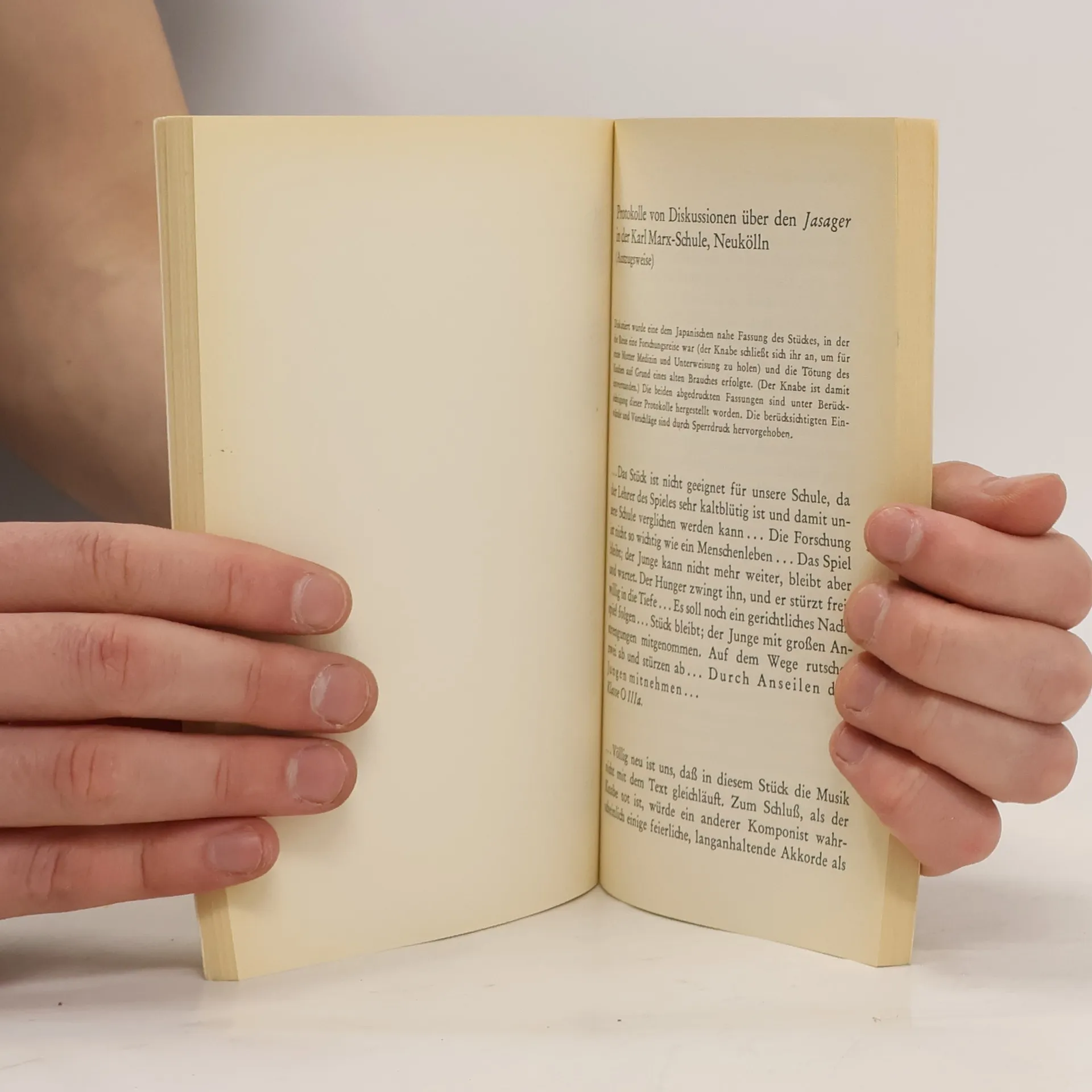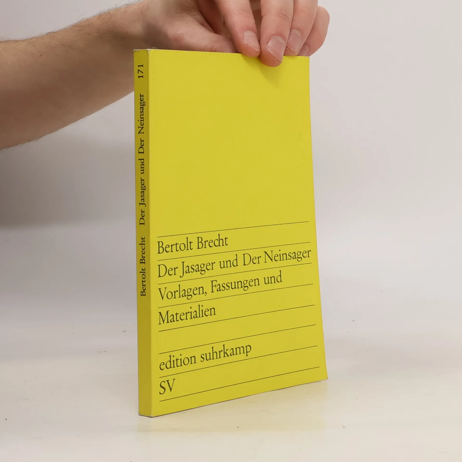 Brechts Stücke Der Jasager und Der Neinsager erscheinen hier zum ersten Male vereinigt mit der später verworfenen ersten Fassung des Jasagers, mit Brechts Vorlage: Arthur Waleys Version des japanischen Nô-Stücks Taniko in der Übersetzung Elisabeth Hauptmanns, Waleys englischem Text sowie einer für diese Edition hergestellten Erstübersetzung des japanischen Originals ins Deutsche.