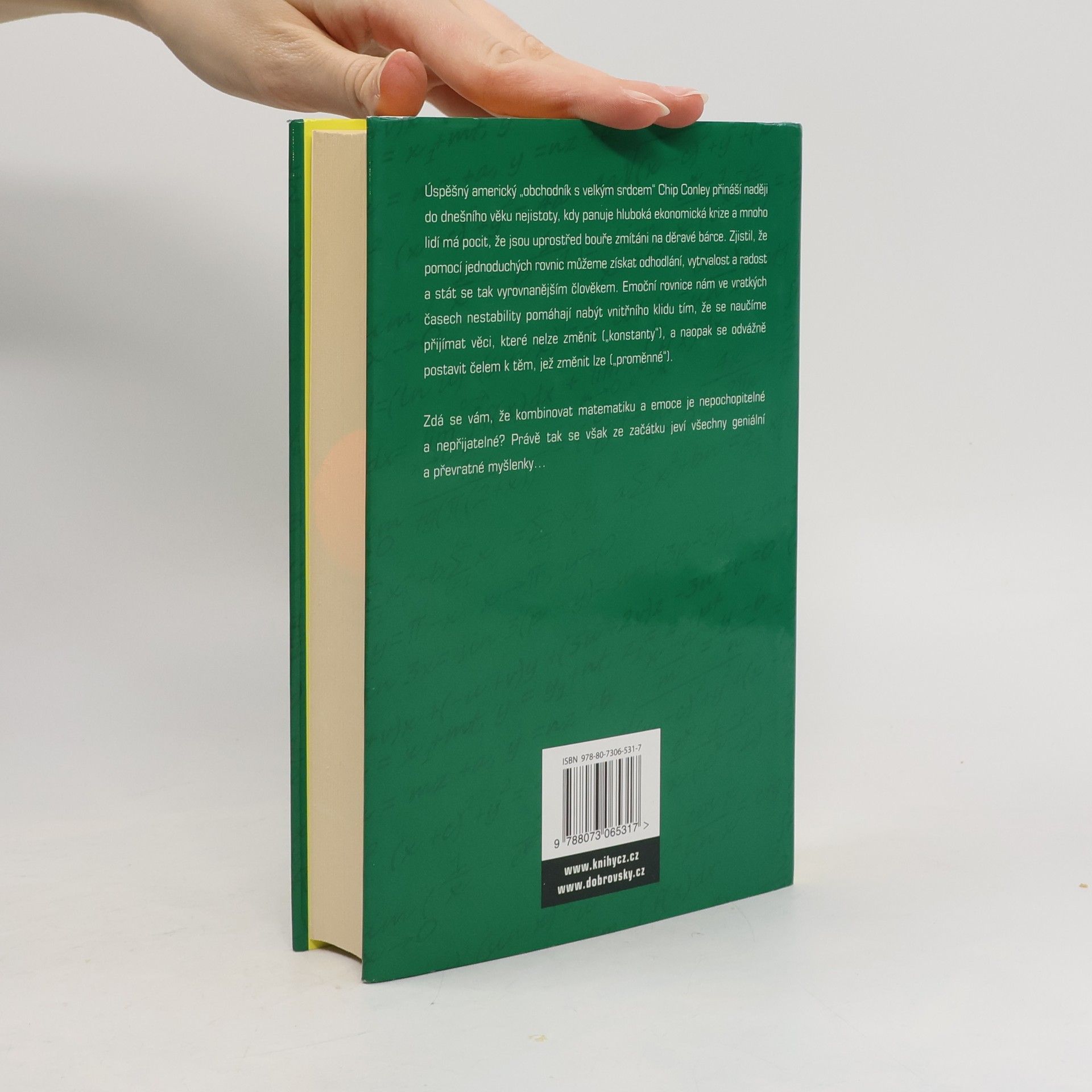 Dnes by nikdo o současném světě neřekl, že "žijeme v klidných vodách". A nedá se to říci ani o době, která přijde. V dnešním věku nejistoty, v období nejhlubší ekonomické krize za posledních 75 let, má mnoho lidí pocit, že jsou uprostřed silné bouře zmítáni na malé loďce. Úspěšný obchodník Chip Conley však zjistil, že pomocí jednoduchých slovních rovnic můžeme získat odhodlání, vytrvalost a radost a stát se tak lepším a vysoce výkonným člověkem. Emocionální rovnice vám přinášejí jednoduchý, ale velmi účinný způsob, jak nejlépe využít svých emocí. Radost=Láska-Strach Inovace= Kreativita - Konformita Mohlo by se zdát, že kombinovat matematiku a emoce je proti našemu intuitivnímu chování, to však ty nejlepší myšlenky často bývají. Conleyho Emocionální rovnice fungují jako mantry, které nám v časech nejistoty pomáhají získat stabilitu, které nám pomáhají zaměřit se na věci, které můžeme změnit ("proměnné") a vše ostatní ("konstanty") ponechat stranou.
