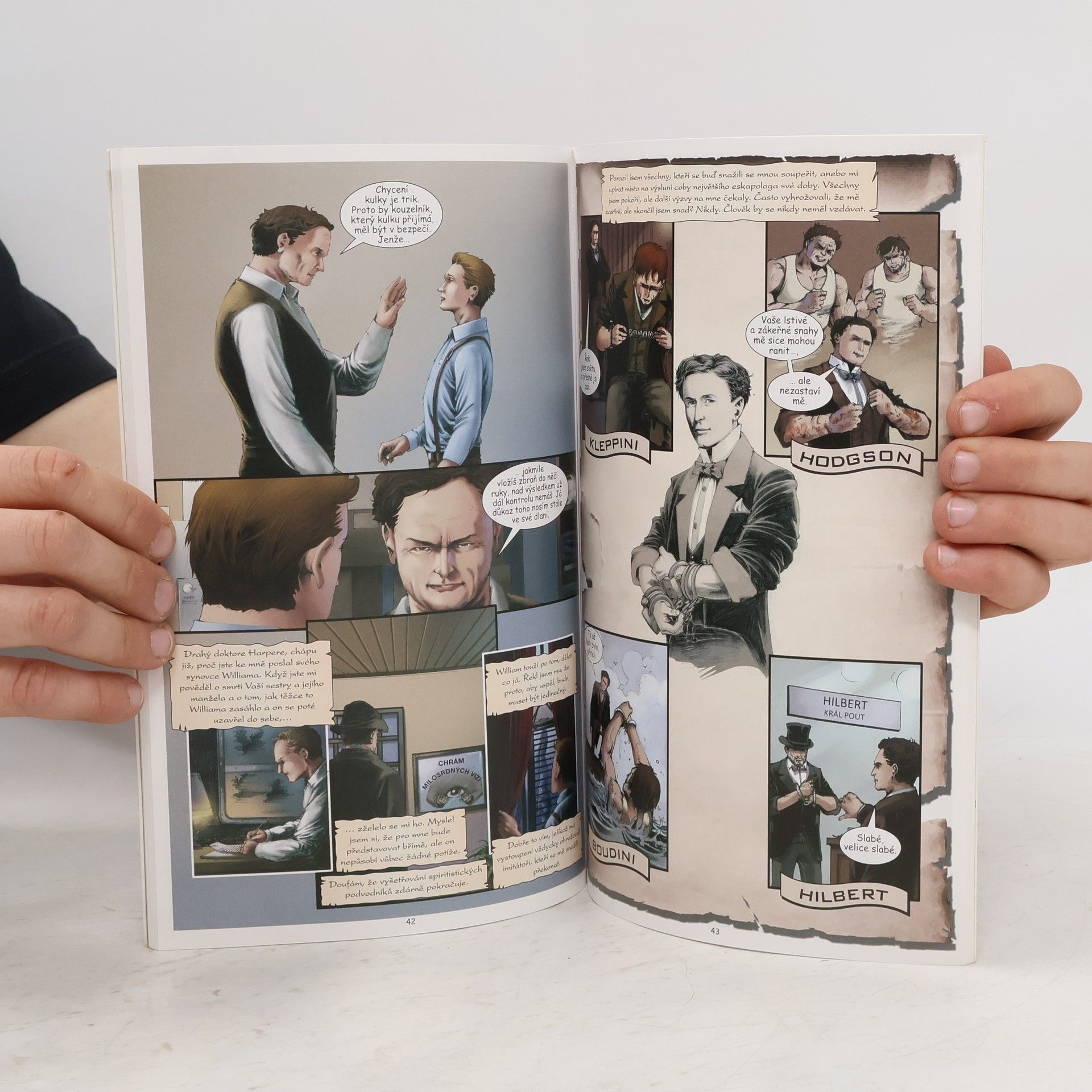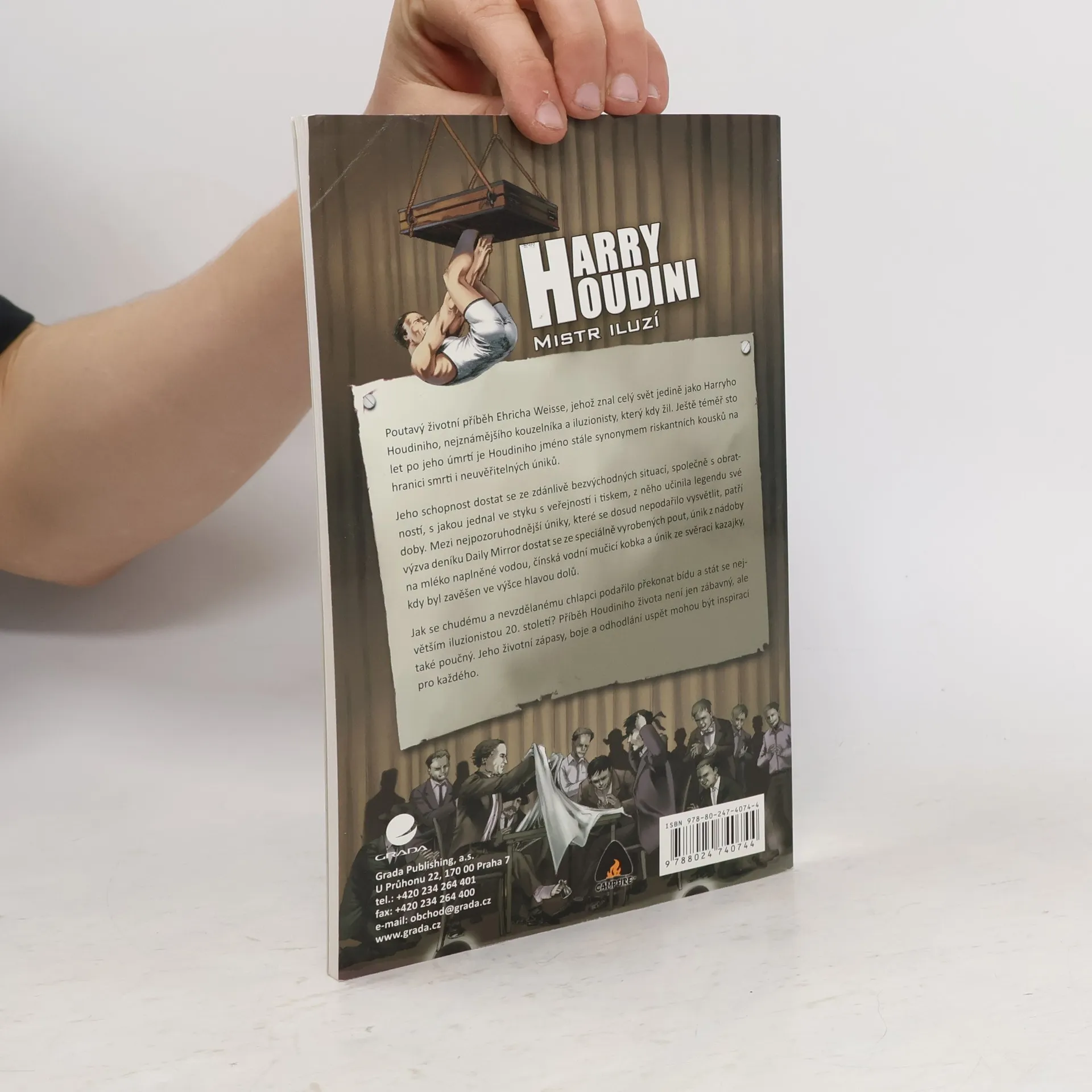 Životopisný komiks slavného kouzelníka a iluzionisty Harryho Houdiniho. Pro starší děti. Poutavý životní příběh Harryho Houdiniho, nejznámějšího kouzelníka a iluzionisty 20. století. Ještě téměř sto let po jeho úmrtí je Houdiniho jméno stále synonymem riskantních kousků na hranici smrti i neuvěřitelných úniků. Jeho schopnost dostat se ze zdánlivě bezvýchodných situací, společně s obratností, s jakou jednal ve styku s veřejností i tiskem, z něho učinila legendu své doby. Mezi nejpozoruhodnější úniky, které se dosud nepodařilo vysvětlit, patří výzva deníku Daily Mirror dostat se ze speciálně vyrobených pout, únik z nádoby na mléko, čínská vodní mučicí kobka a únik ze svěrací kazajky, kdy byl zavěšen ve výšce hlavou dolů. Jak se chudému a nevzdělanému chlapci podařilo překonat bídu a stát se největším iluzionistou 20. století? Nakladatelská anotace.