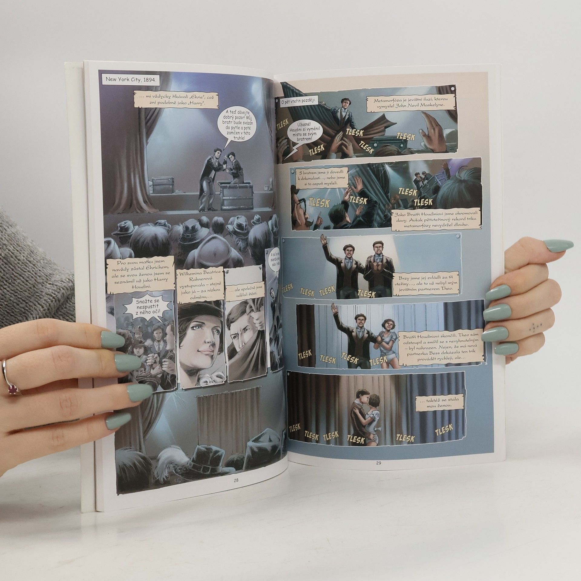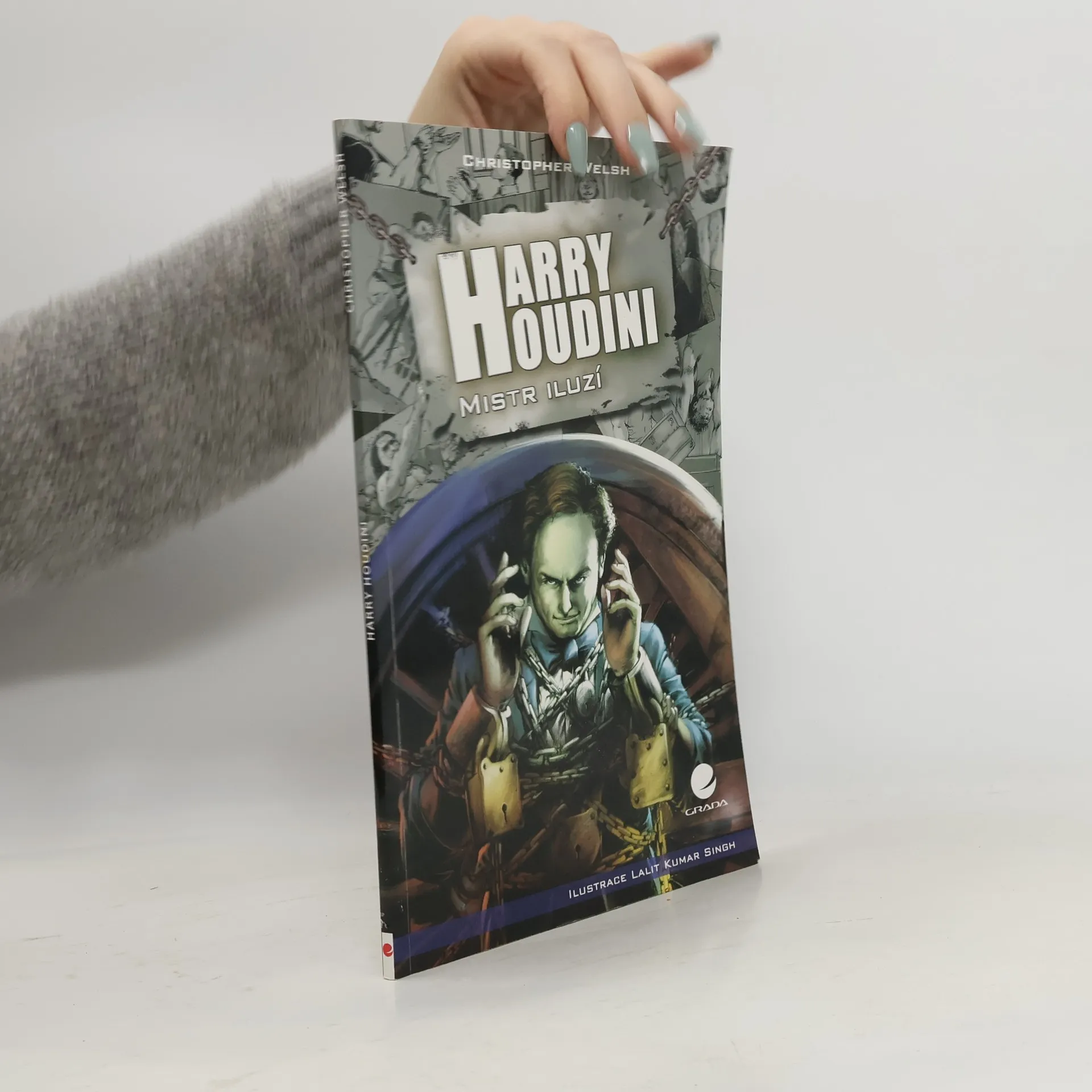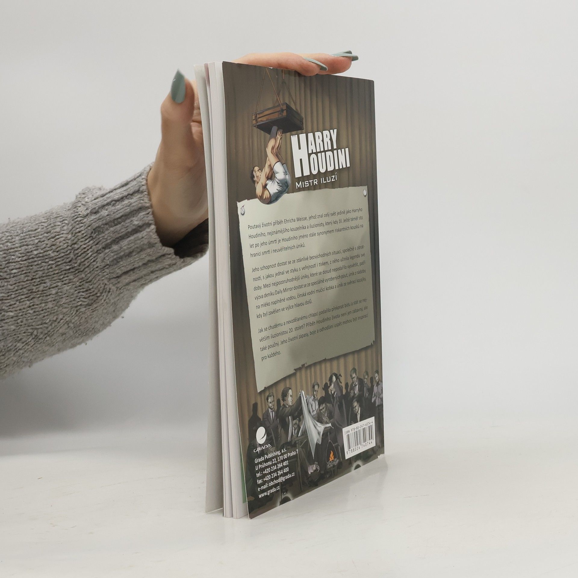 Životopisný komiks slavného kouzelníka a iluzionisty Harryho Houdiniho. Pro starší děti. Poutavý životní příběh Harryho Houdiniho, nejznámějšího kouzelníka a iluzionisty 20. století. Ještě téměř sto let po jeho úmrtí je Houdiniho jméno stále synonymem riskantních kousků na hranici smrti i neuvěřitelných úniků. Jeho schopnost dostat se ze zdánlivě bezvýchodných situací, společně s obratností, s jakou jednal ve styku s veřejností i tiskem, z něho učinila legendu své doby. Mezi nejpozoruhodnější úniky, které se dosud nepodařilo vysvětlit, patří výzva deníku Daily Mirror dostat se ze speciálně vyrobených pout, únik z nádoby na mléko, čínská vodní mučicí kobka a únik ze svěrací kazajky, kdy byl zavěšen ve výšce hlavou dolů. Jak se chudému a nevzdělanému chlapci podařilo překonat bídu a stát se největším iluzionistou 20. století? Nakladatelská anotace.