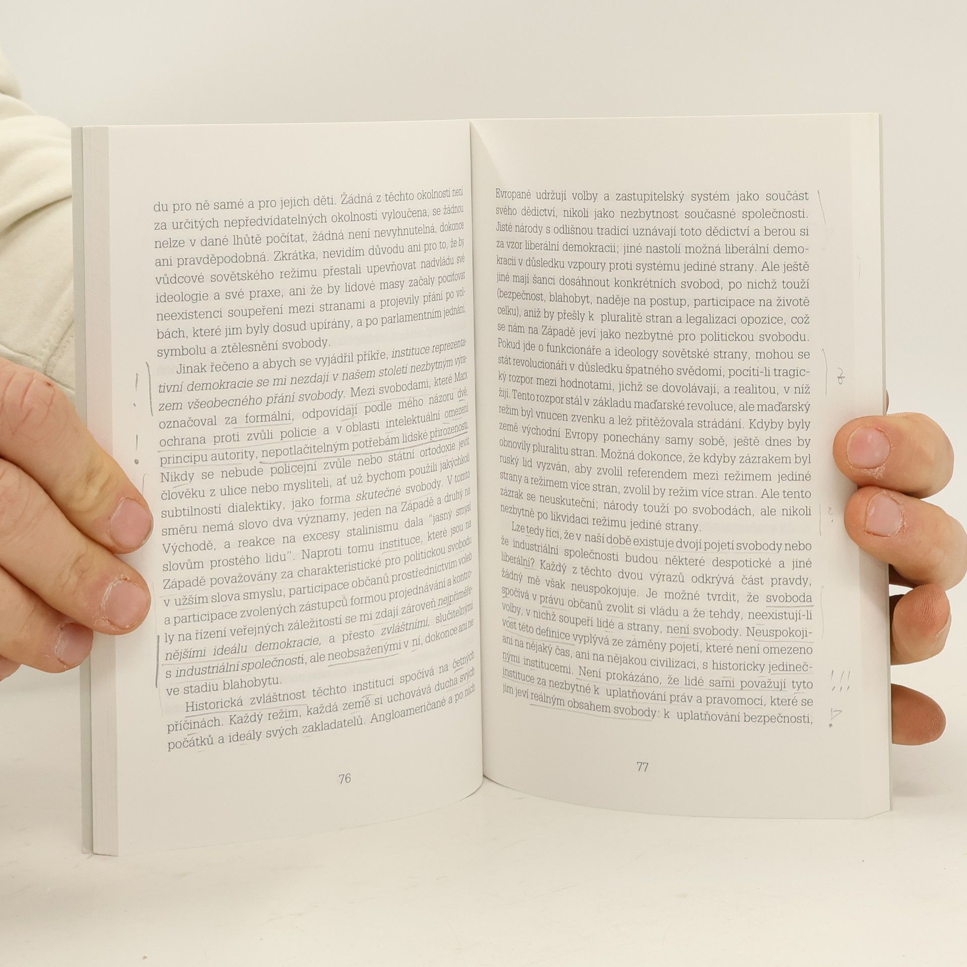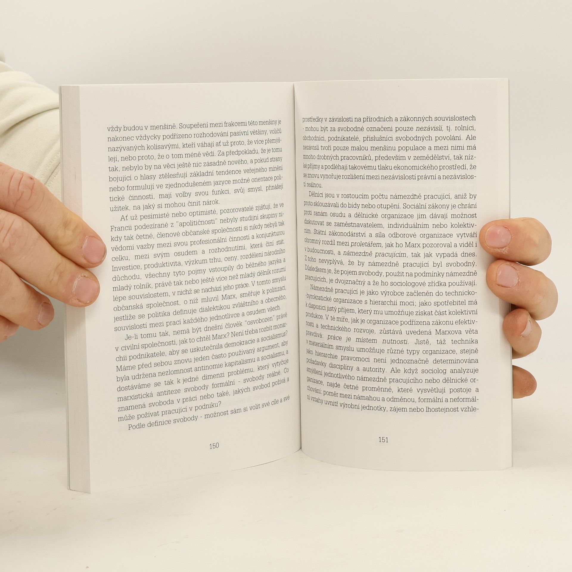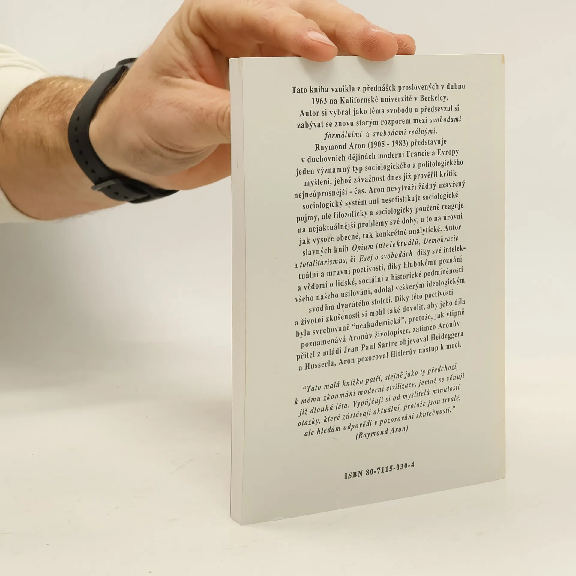 Tato kniha vznikla z přednášek proslovených v dubnu 1963 na Kalifornské univerzitě v Berkeley. Autor si vybral jako téma svobodu a předsevzal si zabývat se znovu starým rozporem mezi svobodami formálními a svobodami reálnými. Raymond Aron (1905–1983) představuje v duchovních dějinách moderní Francie a Evropy jeden významný typ sociologického a politologického myšlení, jehož závažnost dnes již prověřil kritik nejneúprosnější – čas. Aron nevytváří žádný uzavřený sociologický systém ani nesofistikuje sociologické pojmy, ale filozoficky a sociologicky poučeně reaguje na nejaktuálnější problémy své doby, a to na úrovni jak vysoce obecné, tak konkrétně analytické. Autor slavných knih Opium intelektuálů, Demokracie a totalitarismus, či Esej o svobodách díky své intlektuální a mravní poctivosti, díky hlubokému poznání a vědomí o lidské, sociální a historické podmíněnosti všeho našeho usilování, odolal veškerým ideologickým svodům dvacátého století. Díky této poctivosti a životní zkušenosti si mohl také dovolit, aby jeho díla byla svrchovaně „neakademická“, protože, jak vtipně poznamenává Aronův životopisec, zatímco Aronův přítel z mládí Jean-Paul Sartre objevoval Heideggera a Husserla, Aron pozoroval Hitlerův nástup k moci.