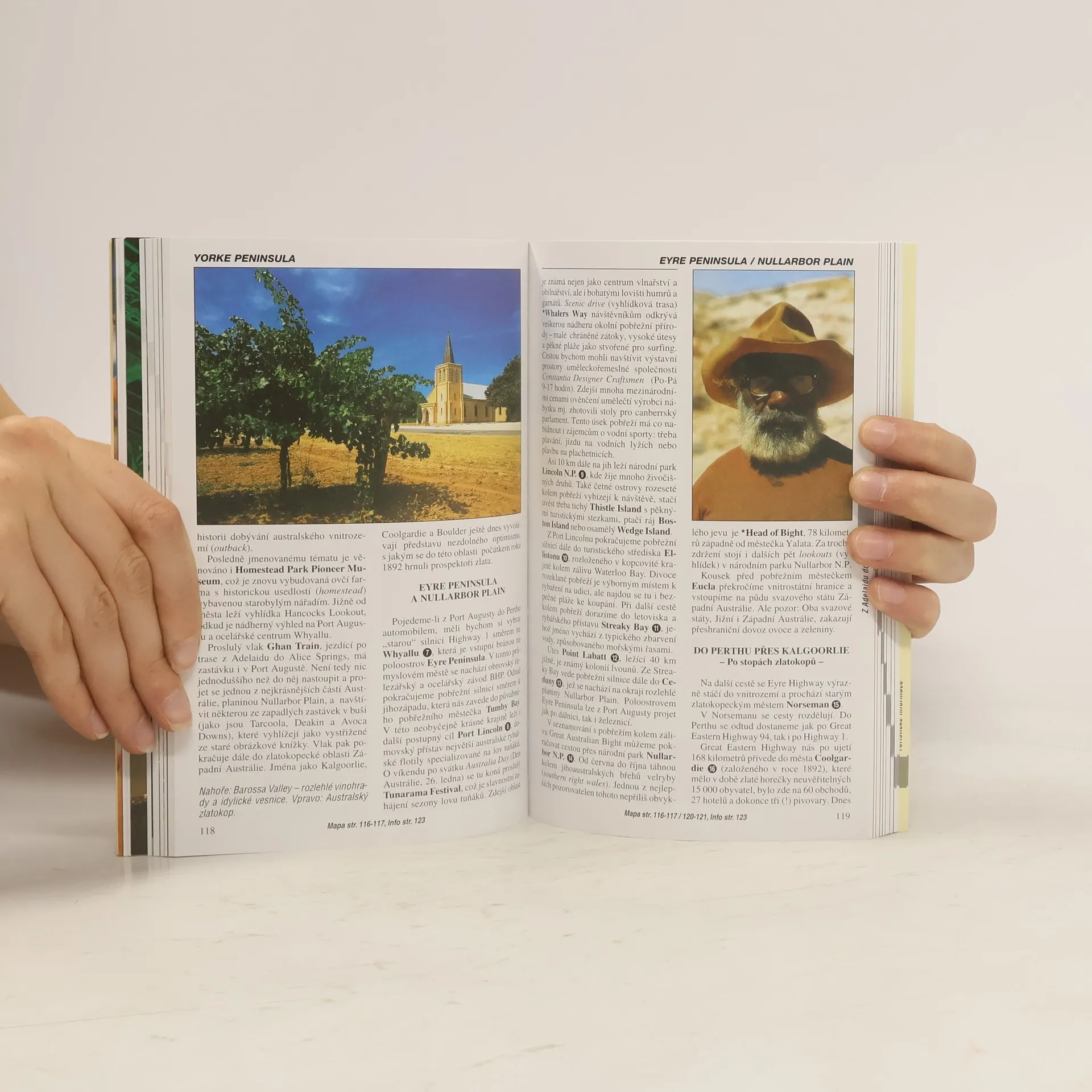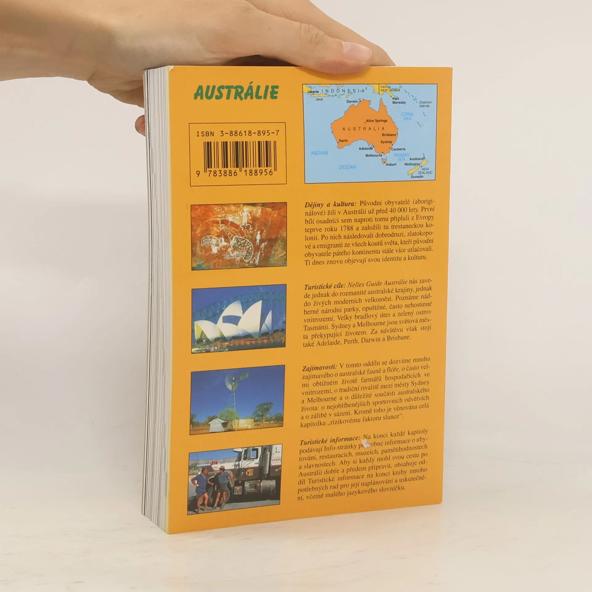 Průvodce s mnoha barevnými fotografiemi popisuje kulturní, architektonické, umělecké a přírodní pozoruhodnosti "země protinožců".