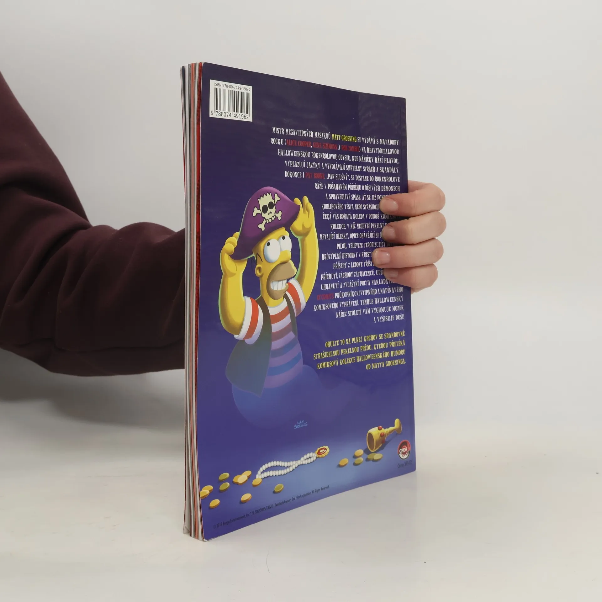 Mistr megavtipných masakrů Matt Groening se vydává s matadory rocku (Alice Cooper, Gene Simmons a Rob Zombie) na heavymetalovou halloweenskou rokenrolovou odyseu, kde máničky hází hlavou, vyplazují jazyky a vyvolávají smrtelný strach a skandály. Dokonce i Pat Boone, „pan slušný“, se dostane do rokenrolové ráže v pošahaném příběhu o děsivých démonech a spravedlivé spáse. Ať se již ponoříte do koblihového těsta nebo strašidelného města, čeká vás bohatá koleda v podobě komiksové kolekce, v níž nechybí pekelní potomci metající blesky, opice ohánějící se motorovou pilou, televize terorizující diváky, hrůzyplné historky z křesťanského tábora, příšery z ledové tříště s limetkovou příchutí, záchody zatracenců, upíří hrobky, uhranutí a zvláštní pocta nakladatelství EC Comics, průkopníkům vtipného a napínavého komiksového vyprávění. Tenhle halloweenský nářez století vám vygumuje mozek a vyšisuje duši! Ohulte to na plnej krchov se srandovně strašidelnou pekelnou prčou, kterou přetéká komiksová kolekce halloweenského humoru od Matta Groeninga.
