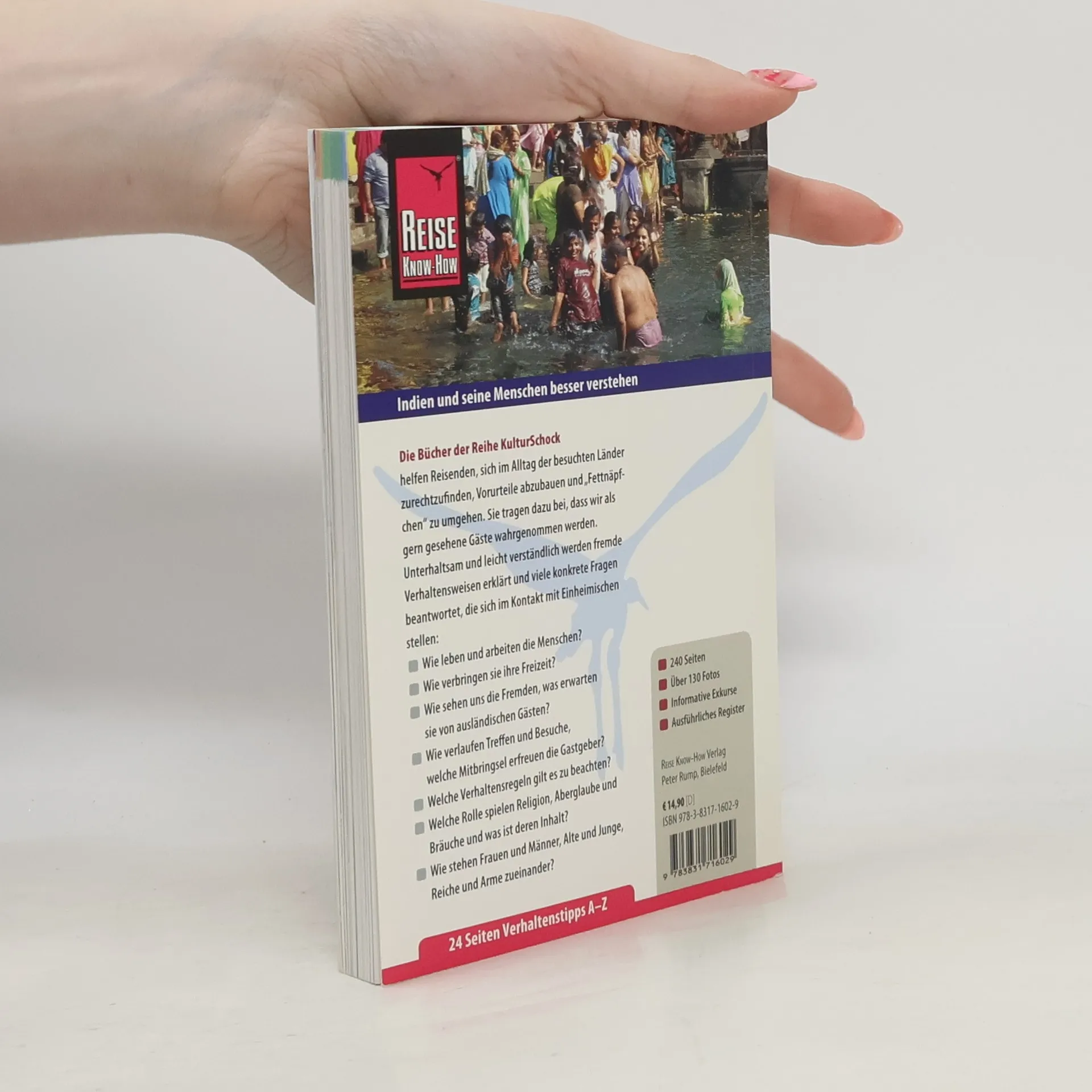 KulturSchock Indien will helfen, Indien und die Inder zu verstehen. Dieses Buch ist ein Kulturführer durch den Dschungel des indischen Alltags, ein Knigge für bewusstes Reisen und Erleben. Es beschreibt die Denk- und Verhaltensweisen der Einwohner, erklärt geschichtliche, religiöse und soziale Hintergründe, die zu diesen Lebensweisen führen und bietet somit eine Orientierung im Dschungel des fremden Alltags. Familienleben, Moralvorstellungen und Anstandsregeln werden genauso erläutert wie Umgangsformen, religiöse Gebote oder Tischsitten. Davon abgeleitet werden Empfehlungen für den Reisealltag, z.B. im Hotel, unterwegs, beim Einkaufen und beim alltäglichen Umgang mit den Einwohnern des Gastlandes. Die Reihe KulturSchock - ausgezeichnet von der Internationalen Tourismusbörse 2010 mit dem Preis "Besondere Reiseführer-Reihe"! Die Bücher der Reihe KulturSchock skizzieren Hintergründe und Entwicklungen, Geschichte und Politik, Alltag und Religion, um heutige Denk- und Lebensweisen zu erklären, um eine Orientierungshilfe im fremden Alltag zu sein. Sie möchten dazu beitragen, dass wir die Gesetzmäßigkeiten des Kulturschocks begreifen, ihn ein wenig vorwegnehmen können und Vorurteile abbauen. Denn je mehr wir voneinander wissen, desto besser werden wir einander verstehen.