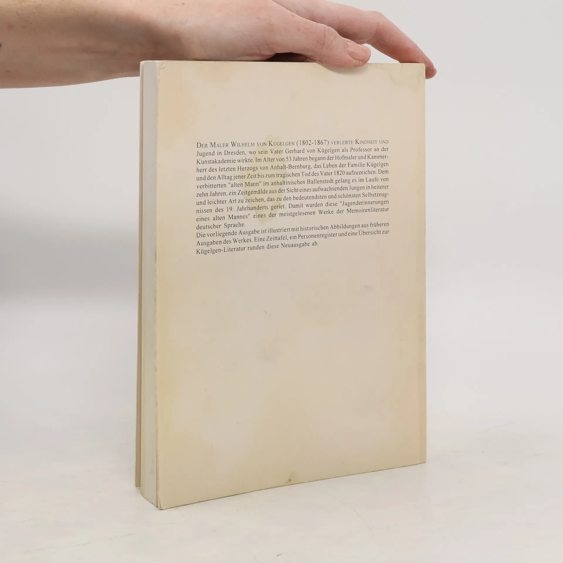 Wilhelm von Kügelgen: Jugenderinnerungen eines alten Mannes Entstanden 1855–1865. Erstdruck, Hrsg. von Philipp von Nathusius: Berlin (Hertz) 1870. Neuausgabe. Herausgegeben von Karl-Maria Guth. Berlin 2018. Textgrundlage ist die Ausgabe: Kügelgen, Wilhem von: Jugenderinnerungen eines alten Mannes. Mit einer Einführung von Gerhard Deszyk und einem Nachwort von Walter Bredendiek, 6. Auflage der Neuausgabe, Leipzig: Koehler & Amelang, 1959. Die Paginierung obiger Ausgabe wird in dieser Neuausgabe als Marginalie zeilengenau mitgeführt. Umschlaggestaltung von Thomas Schultz-Overhage. Gesetzt aus der Minion Pro, 11 pt.