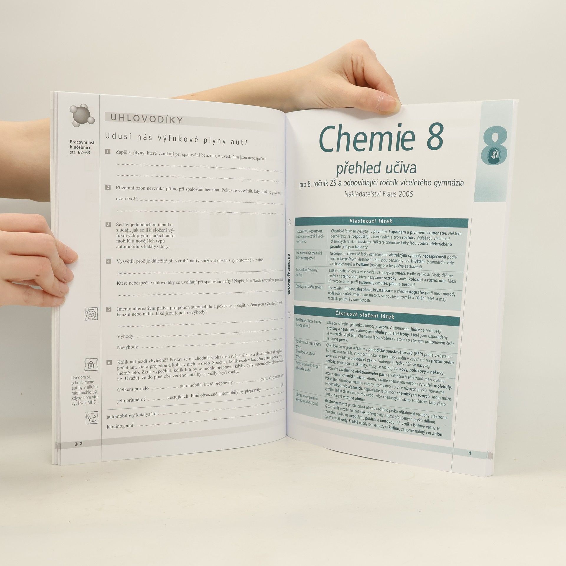 Jednotlivé stránky slouží jako zápisky z vyučovací hodiny. Žáci si zapisují svá pozorování, průběhy a výsledky pokusů, doplňují údaje z chemických tabulek či zápisy chemických rovnic. V součinnosti s učebnicí se tak pracovní sešit stává vynikajícím pomocníkem žáka, kterému významně usnadňuje orientaci v učivu a také napomáhá k efektivnějšímu osvojení učiva. Dalším doplňkem pracovního sešitu je Souhrnný přehled učiva z učebnice, pro kterou je určen.