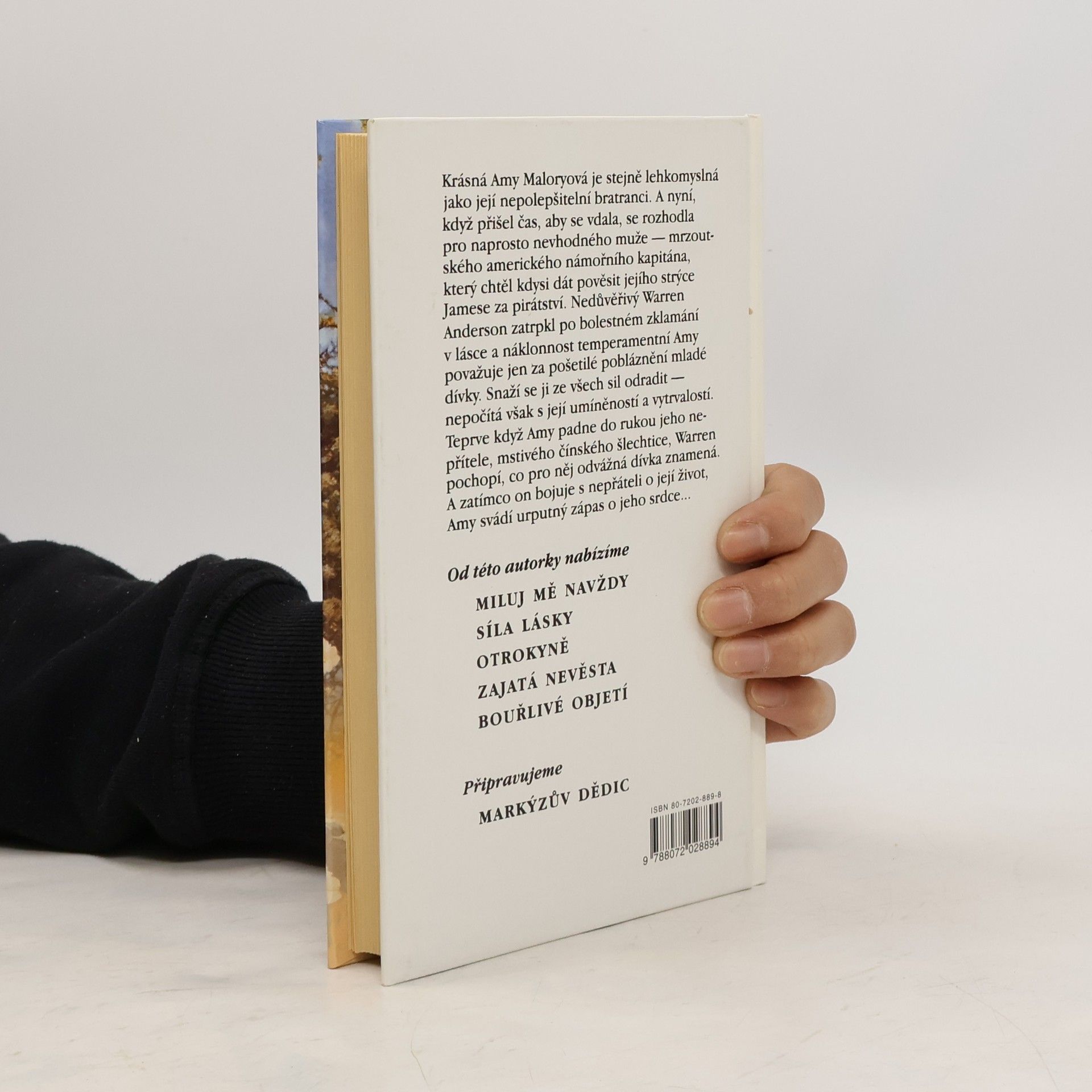Krásná Amy Maloryová je stejně lehkomyslná jako její nepolepšitelní bratranci. A nyní, když přišel čas, aby se vdala, se rozhodla pro naprosto nevhodného muže – mrzoutského amerického námořního kapitána, který chtěl kdysi dát pověsit jejího strýce Jamese za pirátství. Nedůvěřivý Warren Anderson zatrpkl po bolestném zklamání v lásce a náklonnost temperamentní Amy považuje jen za pošetilé pobláznění mladé dívky. Snaží se ji ze všech sil odradit – nepočítá však s její umíněností a vytrvalostí. Teprve když Amy padne do rukou jeho nepřítele, mstivého čínského šlechtice, Warren pochopí, co pro něj odvážná dívka znamená. A zatímco on bojuje s nepřáteli o její život, Amy svádí urputný zápas o jeho srdce …