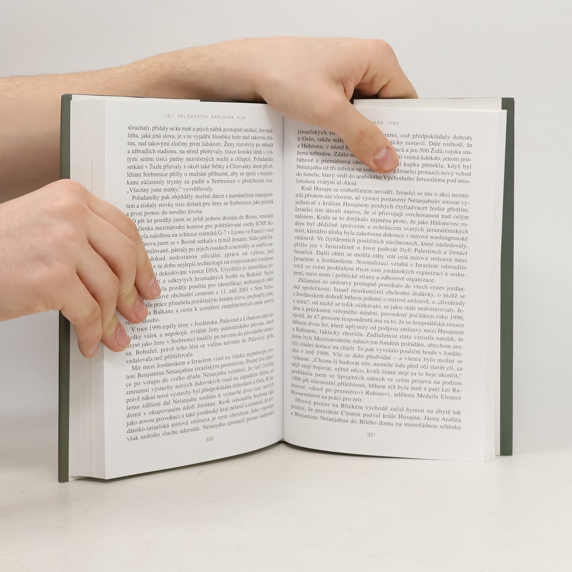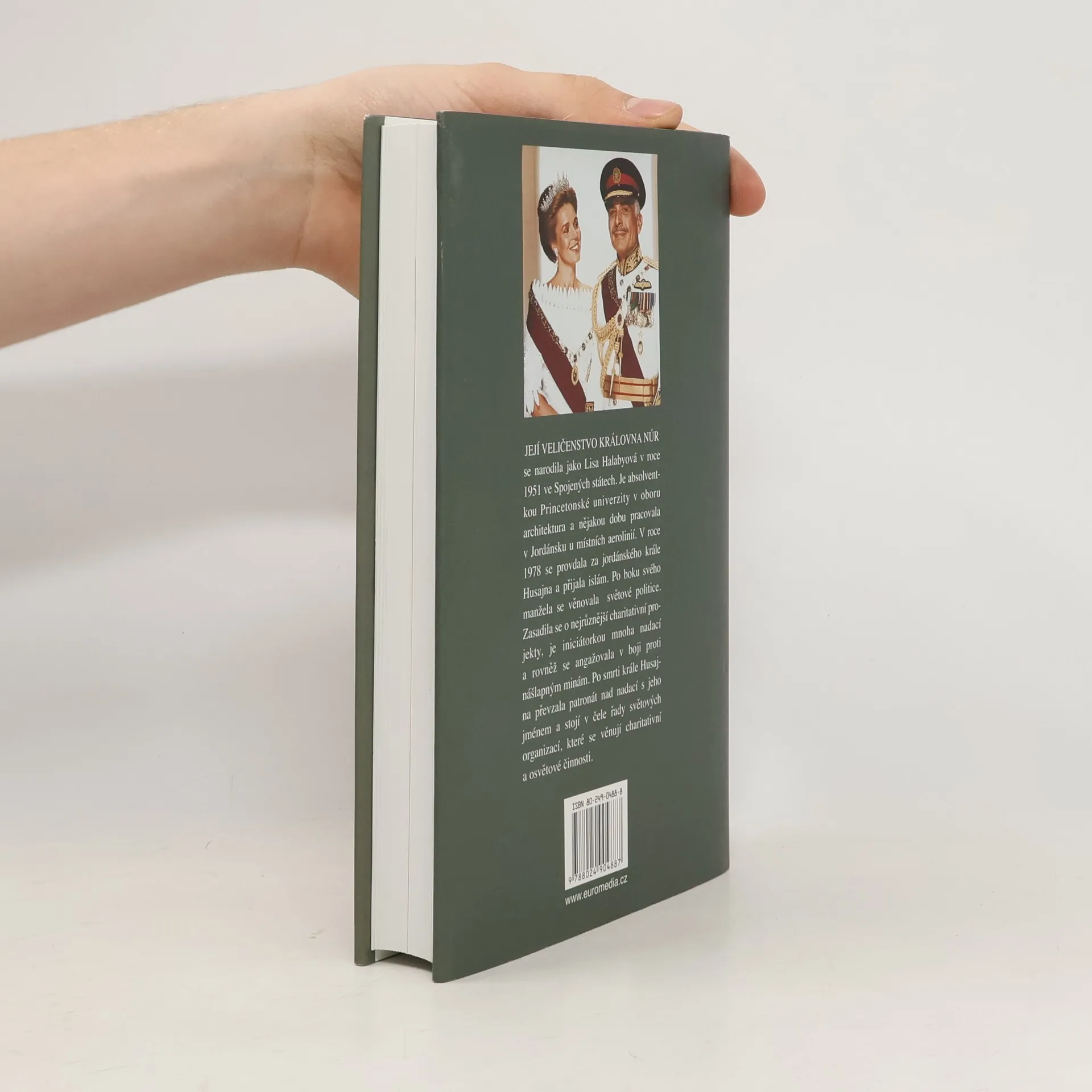 Její Veličenstvo královna Núr se narodila v r. 1951 v USA jako Lisa Halabyová. Je absolventkou Princetonské univerzity, nějakou dobu pracovala v Jordánsku u místních aerolinií.Tam se seznámila s jordánským králem Husajnem; setkání vedlo k téměř románovému vyústění: neznámá emancipovaná Američanka se v r. 1978 stala jordánskou královnou Núr al-Husajní a postupně matkou jeho čtyř dětí. Po boku manžela se věnovala světové politice, zasadila se za charitativní projekty, angažovala se v boji proti nášlapným minám. Po smrti krále převzala patronát nad nadací s jeho jménem a stojí v čele řady světových charitativních organizací. Ve svých pamětech se smyslem pro humor popisuje, jak musela překážky, které před ni kladlo nové společenské postavení. Její memoáry dávají nahlédnout do střeženého soukromí královské rodiny a přinášejí jedinečný portrét tohoto monarchy. Zároveň ukazují mentalitu arabského světa a dokumentují, jak stále víc narůstá neporozumění mezi USA a arabským světem.