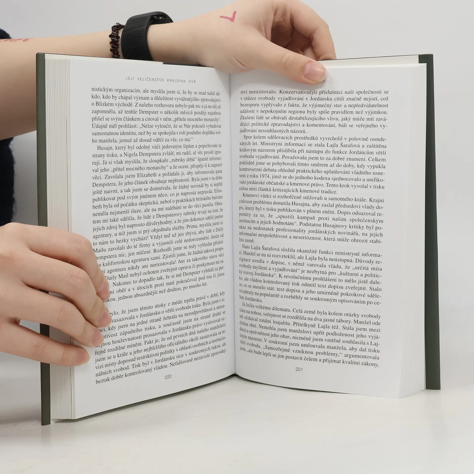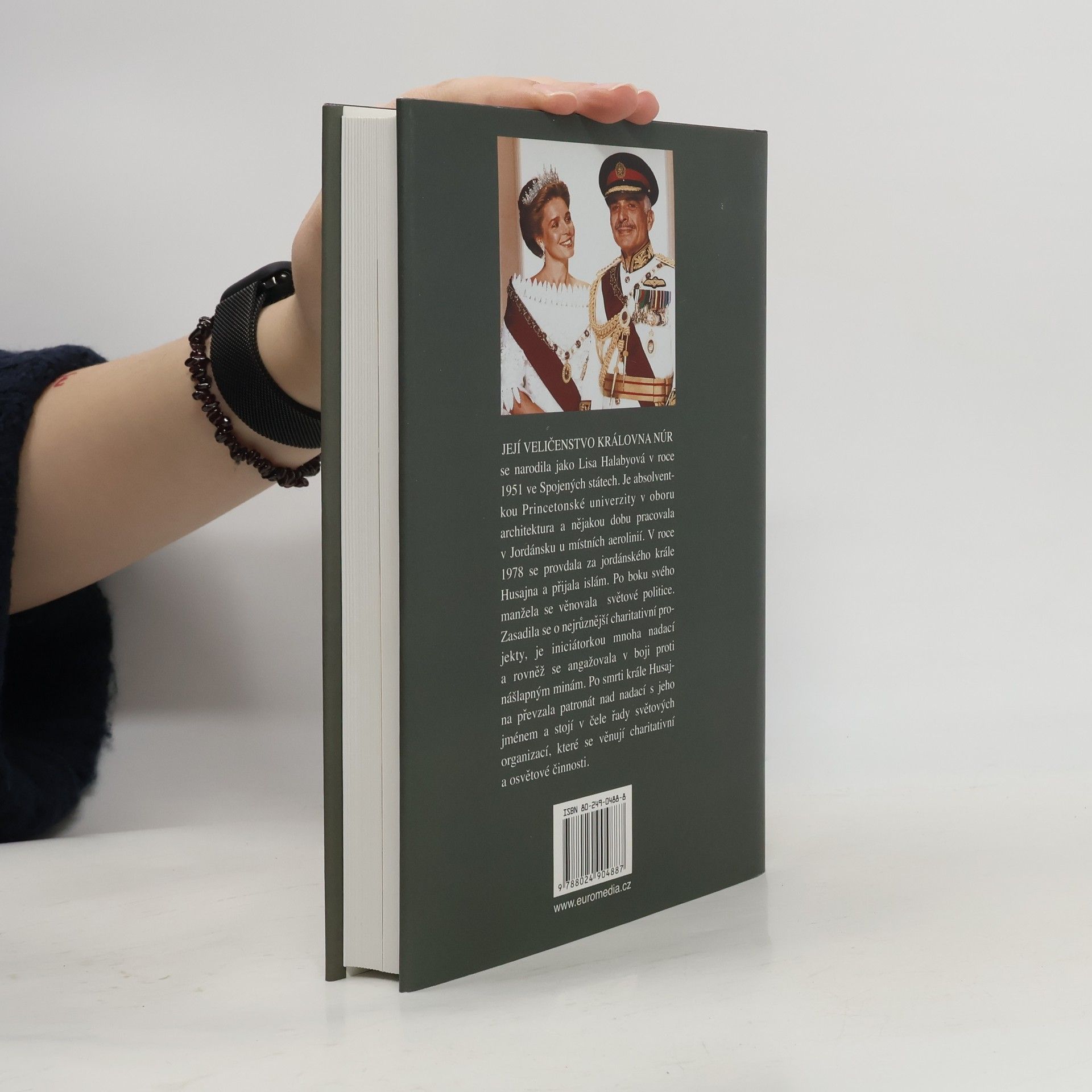 Její Veličenstvo královna Núr se narodila v r. 1951 v USA jako Lisa Halabyová. Je absolventkou Princetonské univerzity, nějakou dobu pracovala v Jordánsku u místních aerolinií.Tam se seznámila s jordánským králem Husajnem; setkání vedlo k téměř románovému vyústění: neznámá emancipovaná Američanka se v r. 1978 stala jordánskou královnou Núr al-Husajní a postupně matkou jeho čtyř dětí. Po boku manžela se věnovala světové politice, zasadila se za charitativní projekty, angažovala se v boji proti nášlapným minám. Po smrti krále převzala patronát nad nadací s jeho jménem a stojí v čele řady světových charitativních organizací. Ve svých pamětech se smyslem pro humor popisuje, jak musela překážky, které před ni kladlo nové společenské postavení. Její memoáry dávají nahlédnout do střeženého soukromí královské rodiny a přinášejí jedinečný portrét tohoto monarchy. Zároveň ukazují mentalitu arabského světa a dokumentují, jak stále víc narůstá neporozumění mezi USA a arabským světem.