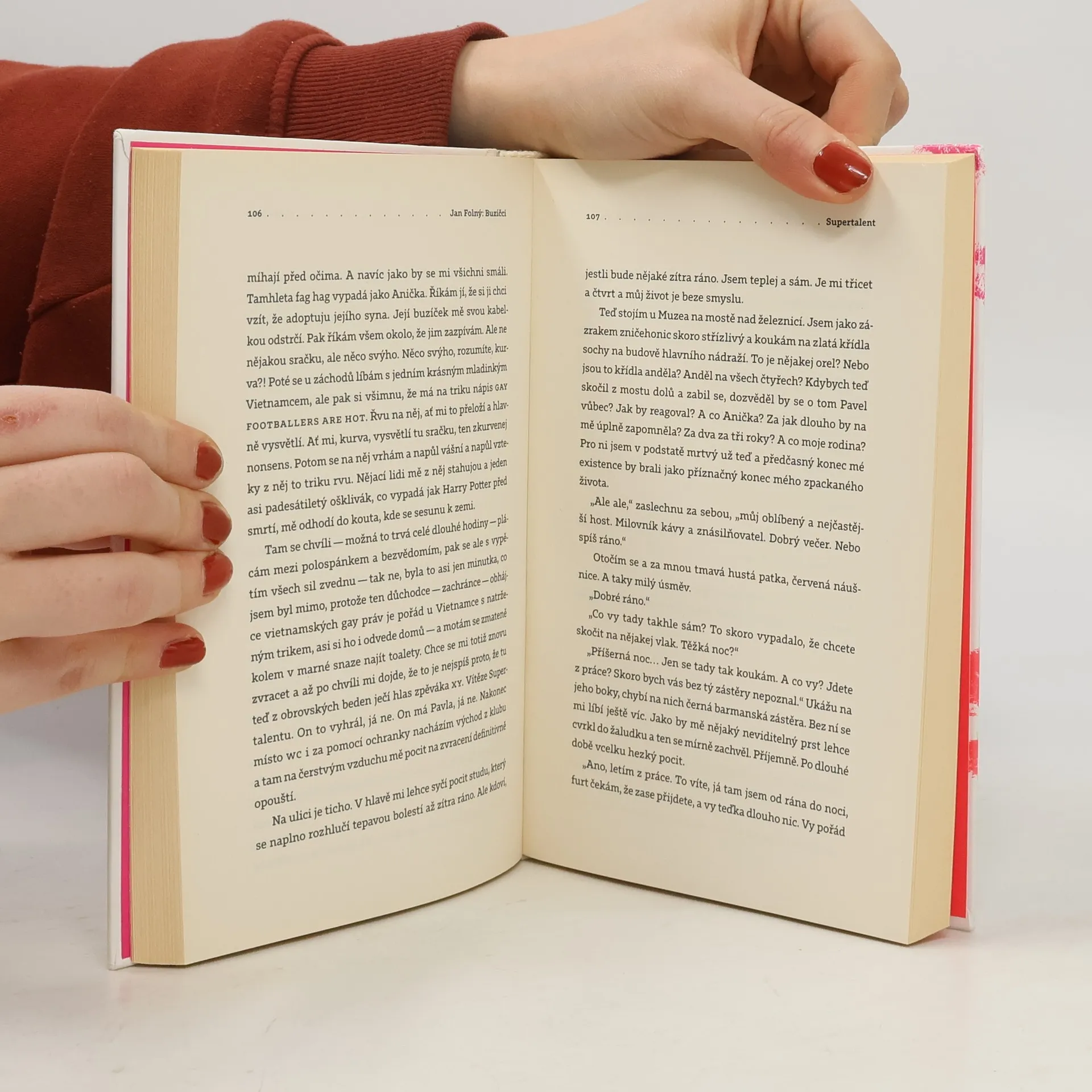 Líbající se muži nebo dívky vedoucí se za ruce jsou dnes výjevy asi stejně pohoršlivé, jako když někdo nosí do sandálů ponožky. A to je dobře. Spisovatelé pak totiž nemusejí aktivisticky dokazovat, že gayové a lesby jsou „stejní lidé jako ostatní“, nebo naopak ostentativně vystavovat své nejrůznější úchylky. Důvodem k příběhu už zkrátka nemusí být fakt, že homosexuálové „jsou“. A právě to si velmi dobře uvědomuje Jan Folný ve sbírce povídek Buzíčci. Už sám název jako by naznačoval autorův postoj k jejich „hrdinům“, balancující mezi ironií a soucitem. Frustrovaný otec od rodiny setkávající se v gay baru s vietnamským mladíkem, slavný zpěvák, který nepřijede na třídní sraz, zamilovaný ligový fotbalista, starý muž chystající se do domova důchodců a řada dalších postav zde defi luje ve vzájemně provázaných příbězích. Folný přitom dokáže přesvědčivě střídat žánry a styly vyprávění, a jasně tak dokazuje, že toto téma konečně i u nás vykročilo z ghetta, aby se stalo literaturou. Seznam povídek: Buzíčci Box of Roses Supertalent Dán jen se dvěma rukama Neviditelný Dort pro Honzíka Změna času Poste restante, Bao Loc Post Office, Lam Dong, Vietnam Třídní sraz Slohové práce žáka páté třídy Jana F. Praha plná buzíčků