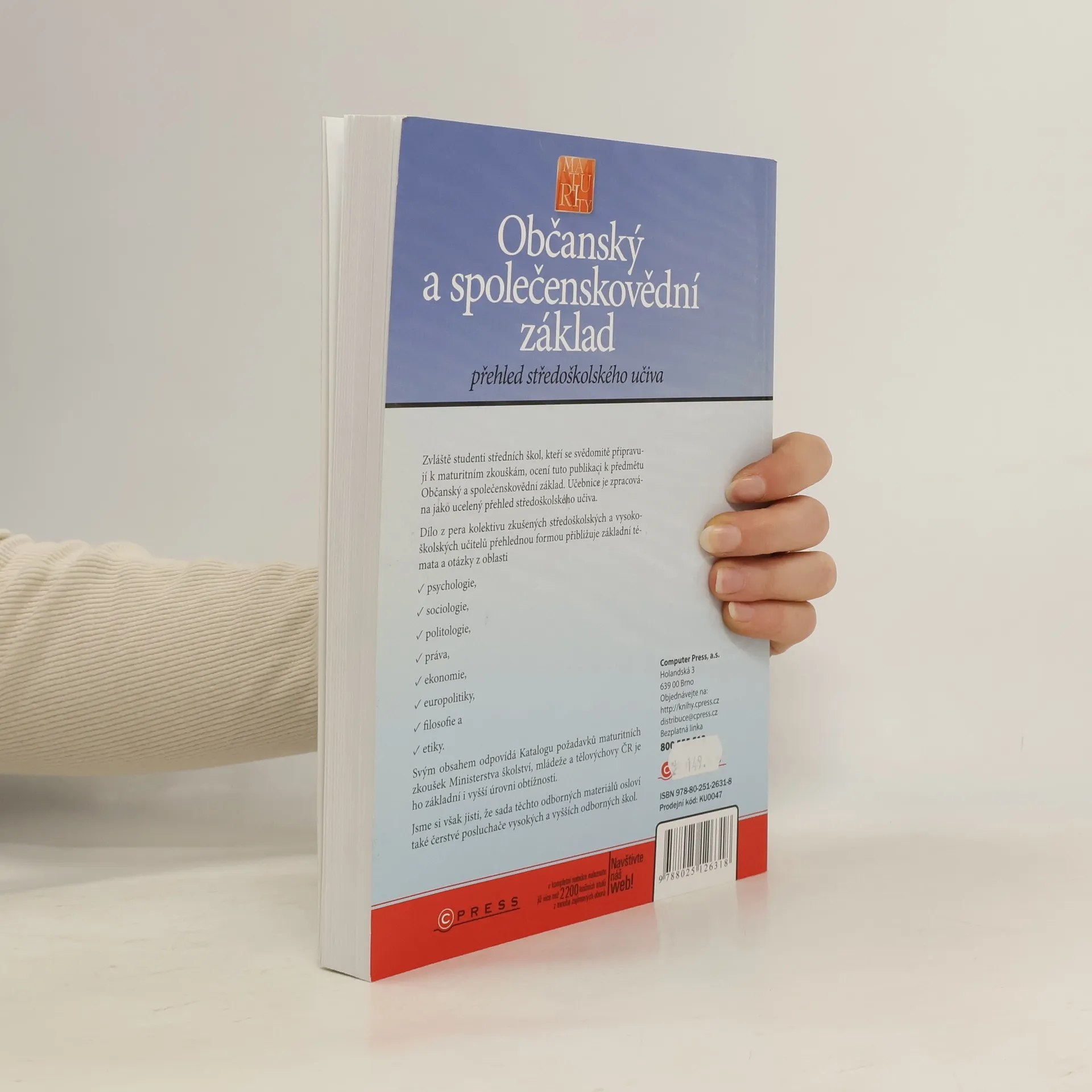 Zvláště studenti středních škol, kteří se svědomitě připravují k maturitním zkouškám, ocení tuto publikaci k předmětu Občanský a společenskovědní základ. Učebnice je zpracována jako ucelený přehled středoškolského učiva. Dílo z pera kolektivu zkušených středoškolských a vysokoškolských učitelů přehlednou formou přibližuje základní témata a otázky z oblasti: - psychologie - sociologie - politologie - práva - ekonomie - europolitiky - filosofie a - etiky. Svým obsahem odpovídá Katalogu požadavků maturitních zkoušek Ministerstva školství, mládeže a tělovýchovy ČR je ho základní i vyšší úrovni obtížnosti. Jsme si však jisti, že sada těchto odborných materiálů osloví také čerstvé posluchače vysokých a vyšších odborných škol.
