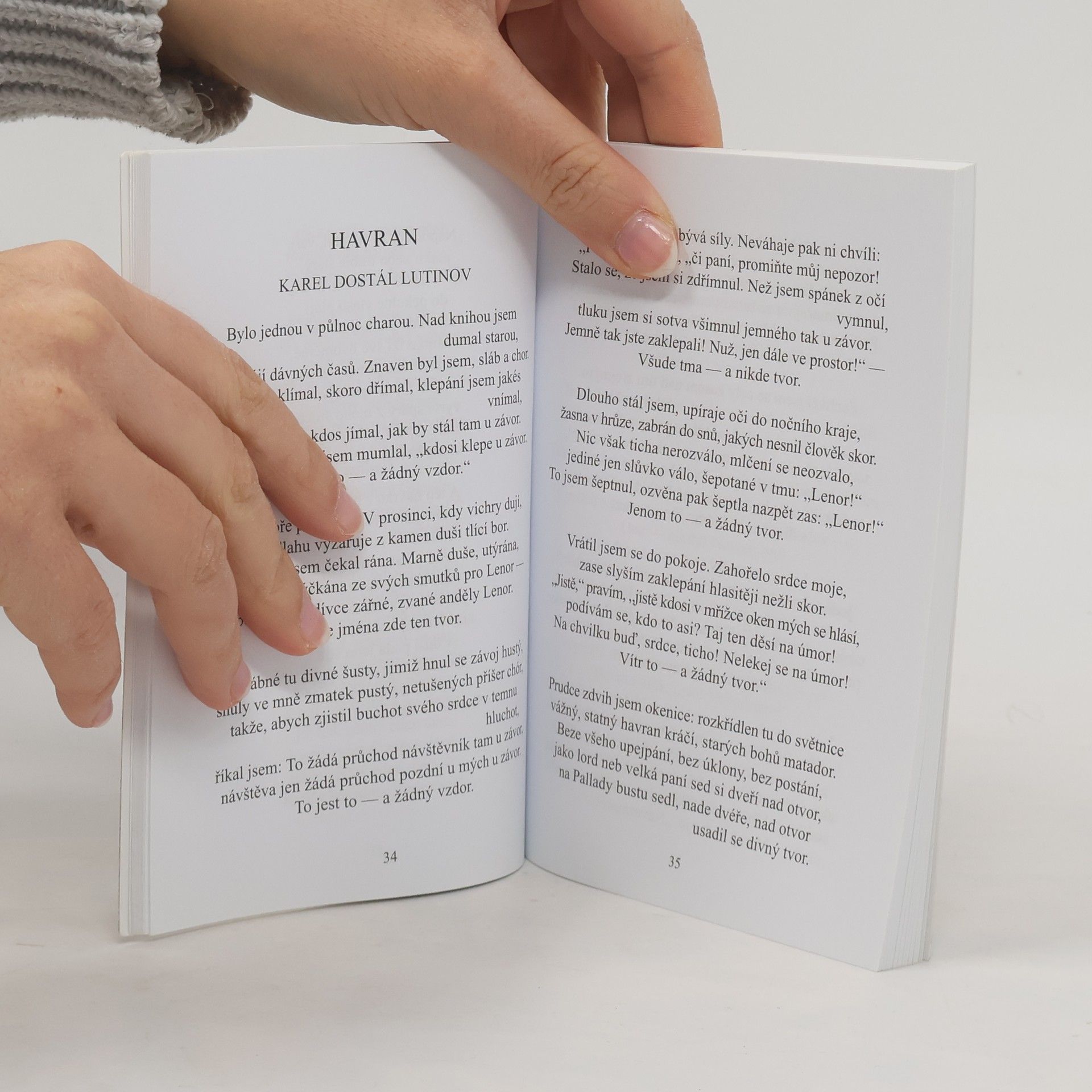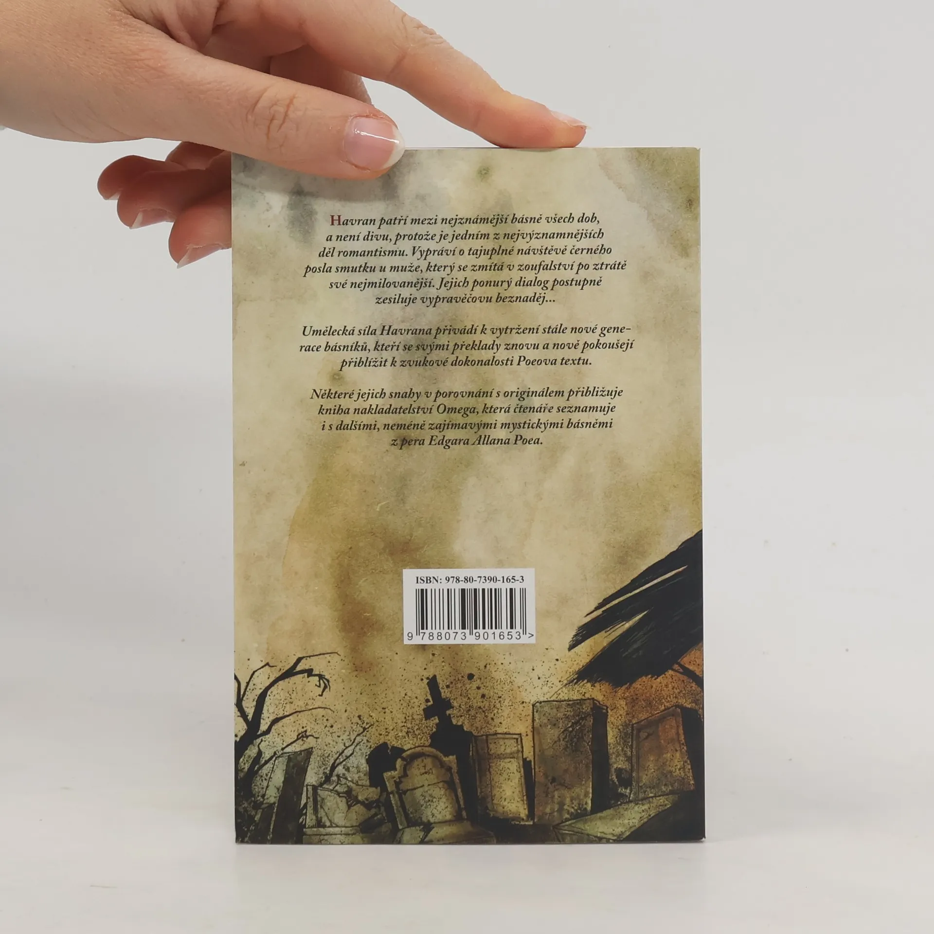 Reedice výboru z poezie významného amerického básníka a spisovatele, který u nás poprvé vyšel v roce 1891 v překladu Jaroslava Vrchlického v nakladatelství Bursík a Kohout. Svazek je doplněn i o další soudobé překlady titulní básně, která je zde navíc otištěna i v originální podobě. O přetlumočení "Havrana" se kromě Vrchlického dále pokusili Vratislav Kazimír Šembera, Augustin Eugen Mužík a Karel Dostál Lutinov. Všech ostatních dvaatřicet Poeových textů, obsažených v tomto souboru, pak převedl do češtiny Jaroslav Vrchlický. Obsahuje básně: Havran -- Heleně -- Lenora -- Hymnus -- Kolosseum -- Sloky Heleně -- Své matce -- Zvony -- Annabel-Lee -- Eulalie -- Ulalum -- F.–S. S. O–D. -- Spící -- Očarovaný palác -- Ostrovu Zante -- Zem snů -- Někomu v ráji -- Eldorado -- Údolí neklidu -- Sen ve snu -- Město v moři -- Ticho -- Červ dobyvatel -- Pro Annie -- F... -- Svatební ballada -- Israfel -- Já nedbám... -- M. L. S. (1) -- Duchové mrtvých -- M. L. S. (2) -- Jezero -- Země vil Částečně v anglickém originále se souběžným českým překladem.
