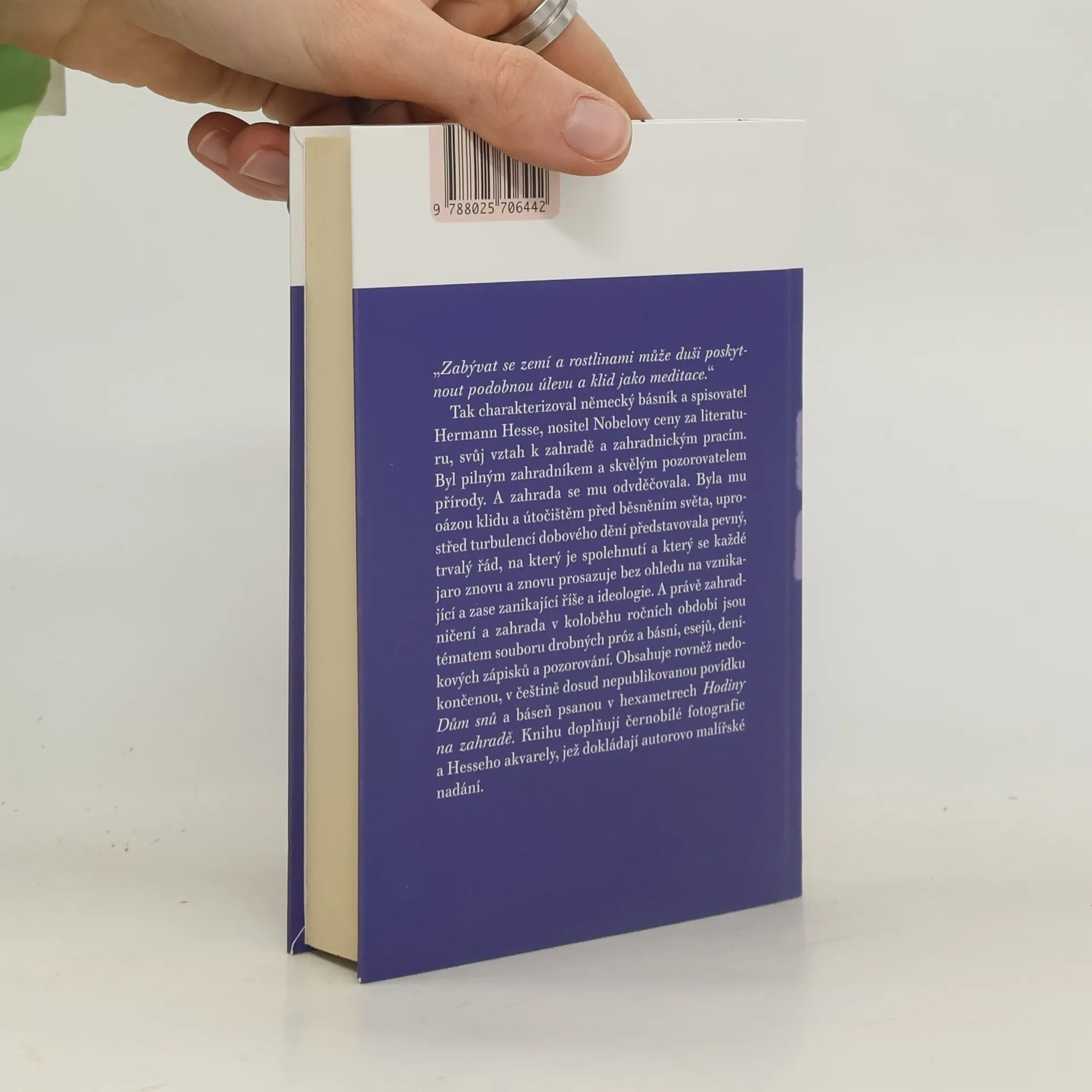 Spisovatel a básník Hermann Hesse byl náruživým pozorovatelem přírody a pilným zahradníkem. Zahradničení mu poskytovalo útěchu a odpočinek, zahrada mu byla útočištěm a oázou klidu. „Zaměstnávat se zeminou a rostlinami dává duši stejnou úlevu a klid jako meditace.“ Knihu doplňují černobílé fotografie a Hesseho akvarely, jež dokládají autorovo malířské nadání.