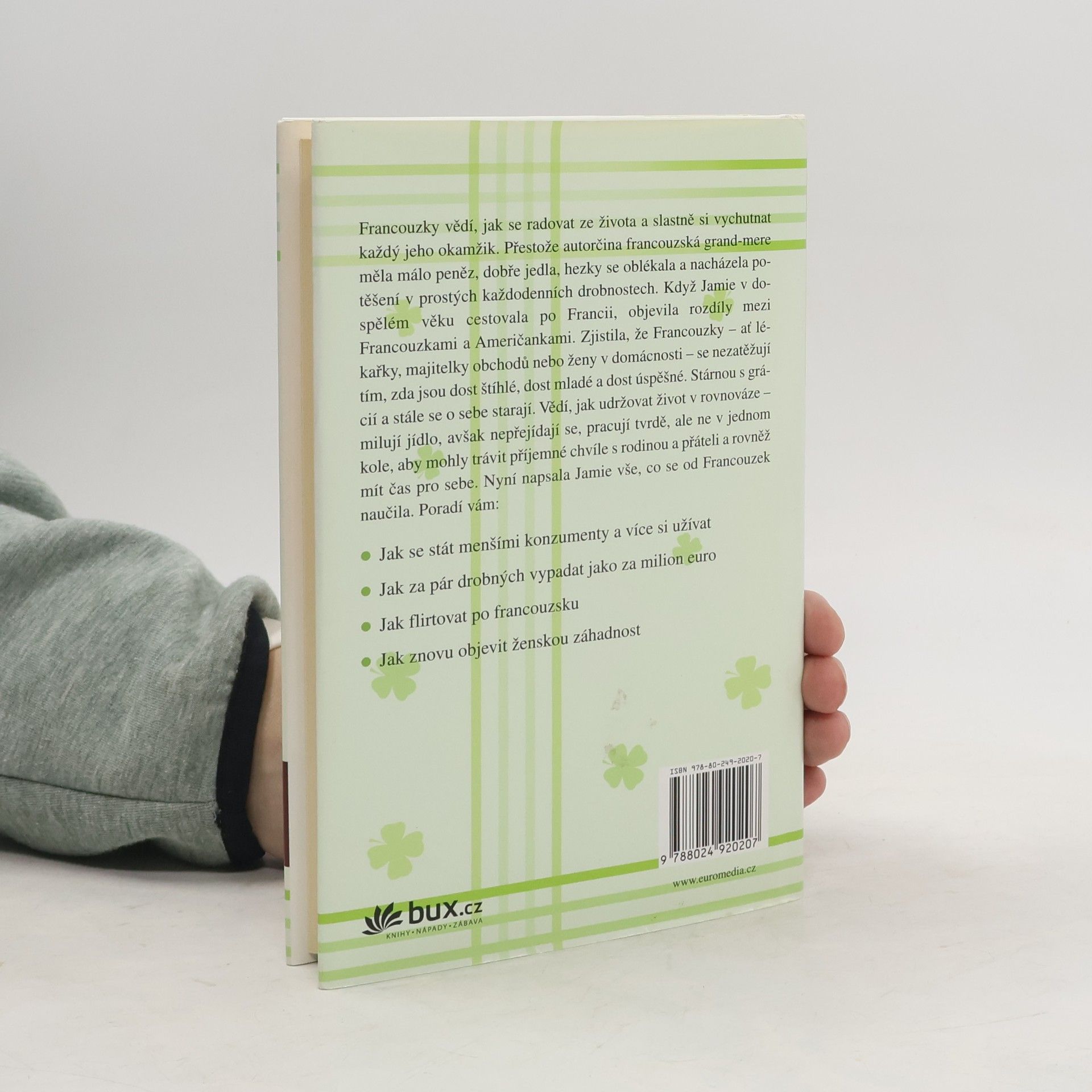 Francouzky vědí, jak se radovat ze života a slastně si vychutnat každý jeho okamžik. Když Jamie cestovala po Francii, zjistila, že Francouzky – ať lékařky, majitelky obchodů nebo ženy v domácnosti – se nezatěžují tím, zda jsou dost štíhlé, dost mladé a dost úspěšné. Stárnou s grácií a stále se o sebe starají. Vědí, jak udržovat život v rovnováze. Autorka vám s moudrostí i humorem poradí, jak se stát menšími konzumenty a více si užívat, jak za pár drobných vypadat jako za milion euro, jak flirtovat po francouzsku a znovu objevit ženskou záhadnost.