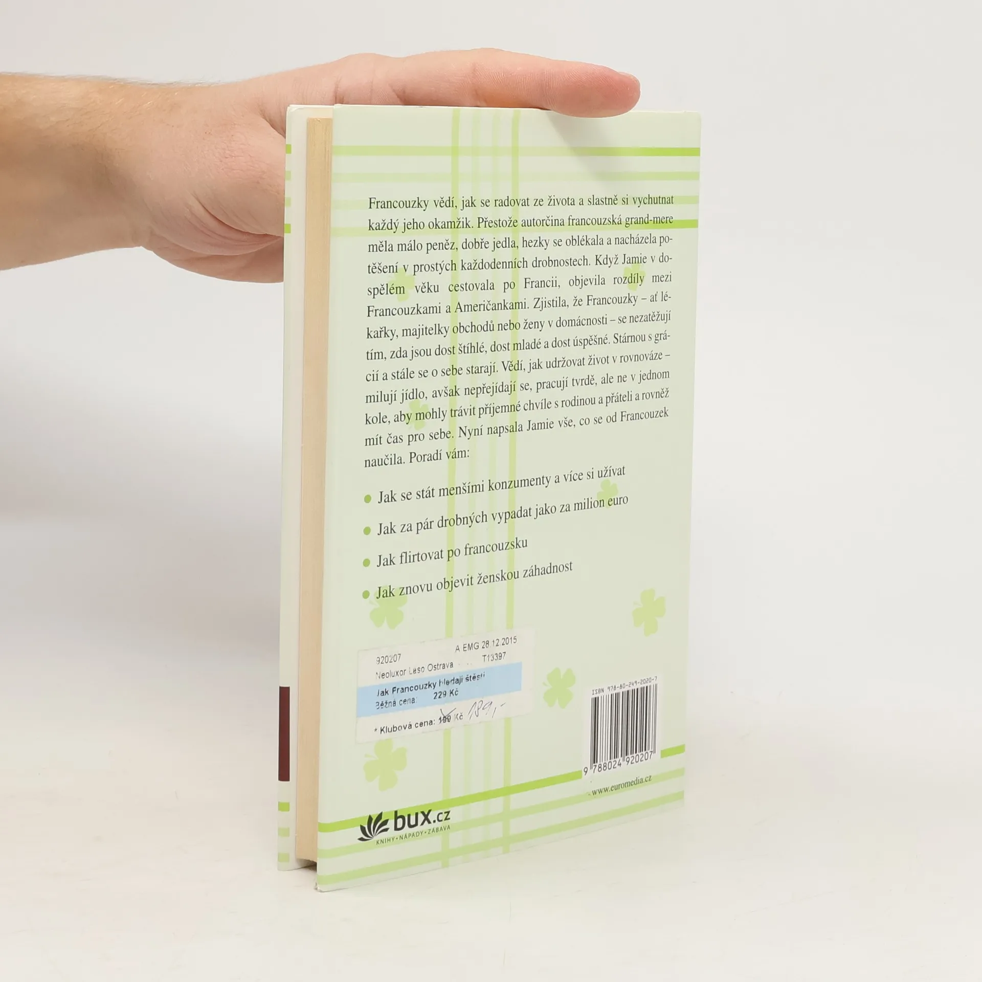 Francouzky vědí, jak se radovat ze života a slastně si vychutnat každý jeho okamžik. Když Jamie cestovala po Francii, zjistila, že Francouzky – ať lékařky, majitelky obchodů nebo ženy v domácnosti – se nezatěžují tím, zda jsou dost štíhlé, dost mladé a dost úspěšné. Stárnou s grácií a stále se o sebe starají. Vědí, jak udržovat život v rovnováze. Autorka vám s moudrostí i humorem poradí, jak se stát menšími konzumenty a více si užívat, jak za pár drobných vypadat jako za milion euro, jak flirtovat po francouzsku a znovu objevit ženskou záhadnost.