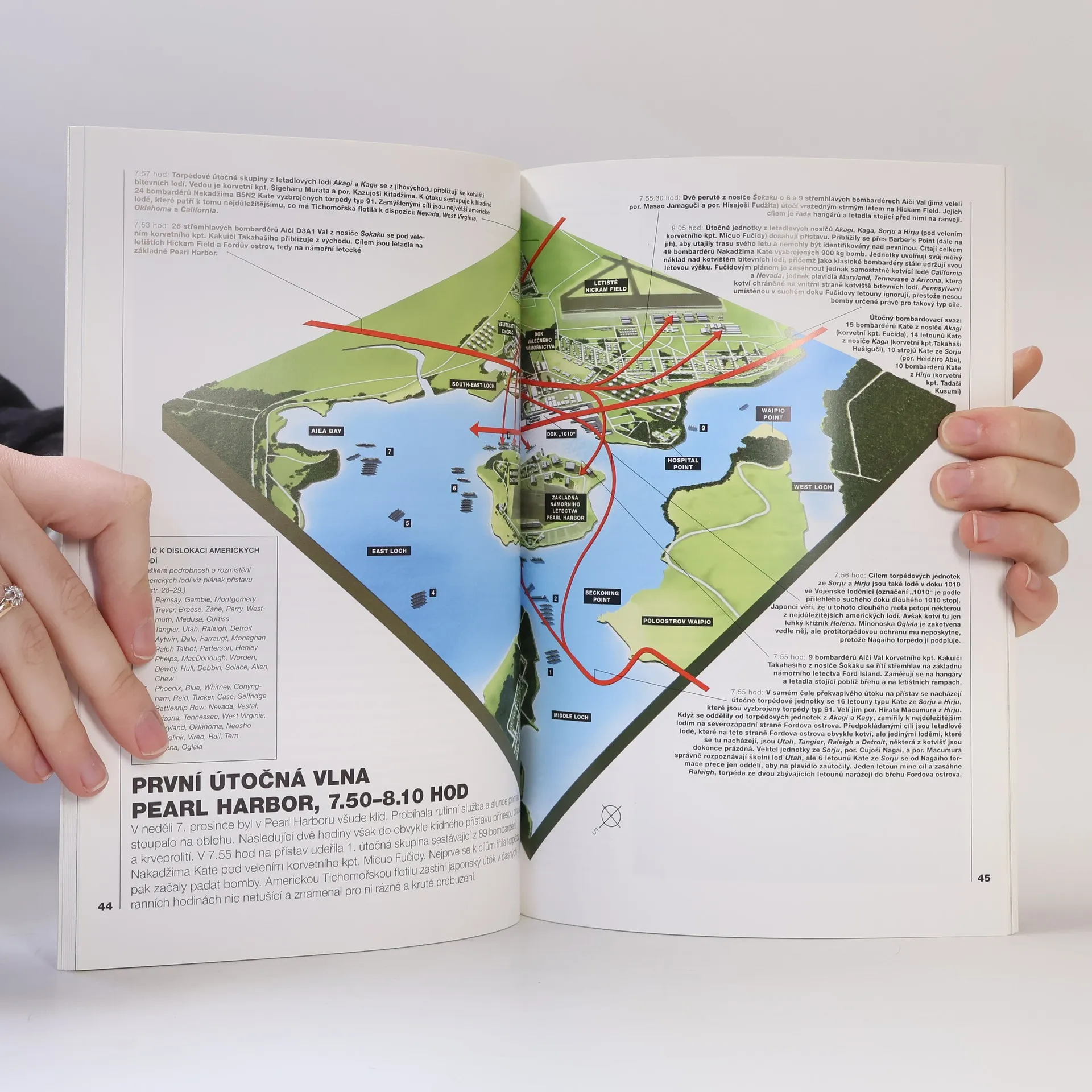 Nálet na americkou tichomořskou flotilu kotvící v havajském přístavu Pearl Harbor, který provedlo japonské letectvo zcela nečekaně dne 7. prosince 1941, znamenal výrazný mezník v průběhu 2. světové války. Jeho důsledkem byl totiž vstup dosud neutrálních USA do války. Pomocí dobových textových a obrazových dokumentů se autorovi podařilo velice sugestivně vystihnout atmosféru bezstarostnosti, která v přístavu Pearl Harbor vládla těsně před náletem, a atmosféru plnou úděsu a bezmocného vzteku během náletu. S až udivující důkladností je v knize zaznamenán sled událostí pár hodin, jeho hlavní i méně důležití aktéři, jak američtí, tak japonští. Velká pozornost je pak věnována japonskému plánu, jednotlivým typům bojových letadel, výstroji a výzbroji pilotů. Zájemci jistě ocení i takové detaily, jakou byly sestavy japonských útočných vln a struktura velení.