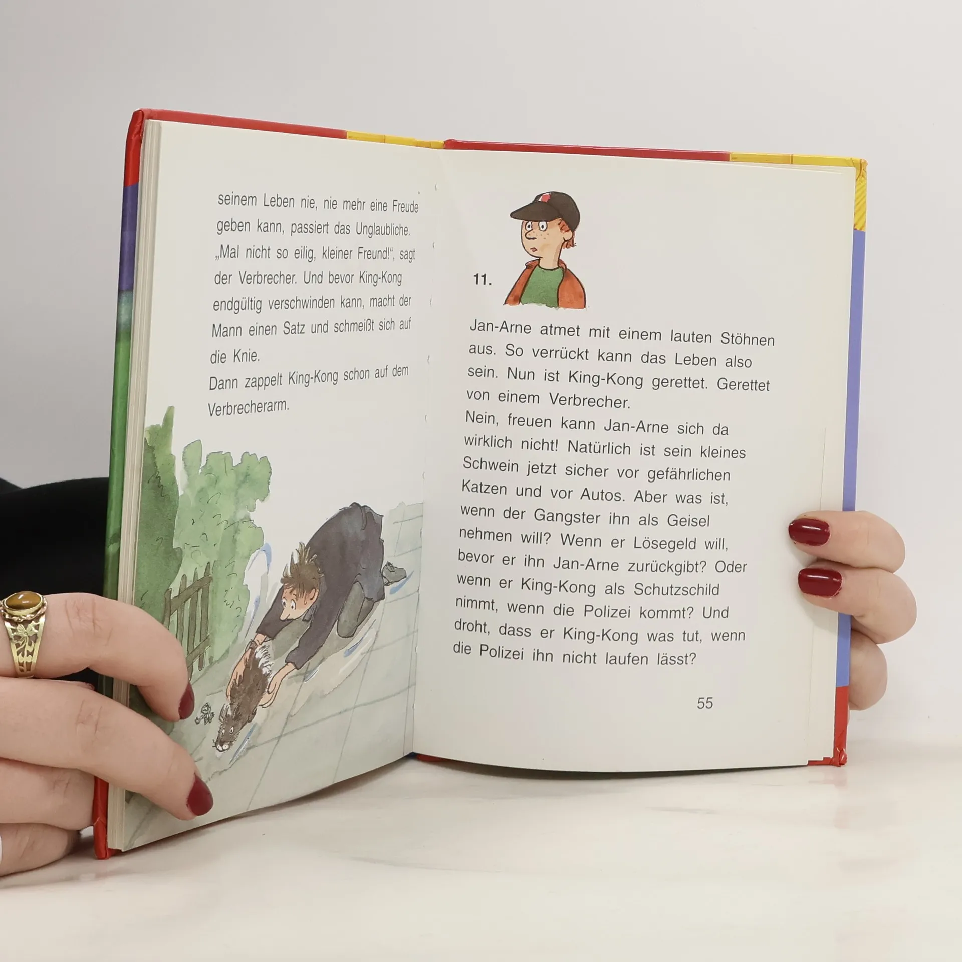 Dass das Leben so aufregend sein kann, das hätten Jan-Arne und Michi ja nie gedacht. Eigentlich wollten sie ja nur mit King-Kong zum Zoogeschäft. Und jetzt stehen sie hier in der Dunkelheit und im Nebel und beschatten einen Einbrecher. Oder wie nennt man wohl sonst einen Mann, der versucht ohne Schlüssel in ein Haus zu kommen? Zum Glück hat Jan-Arne King-Kong dabei, der fühlt sich so weich und warm an und hat überhaupt keine Angst vor Einbrechern.