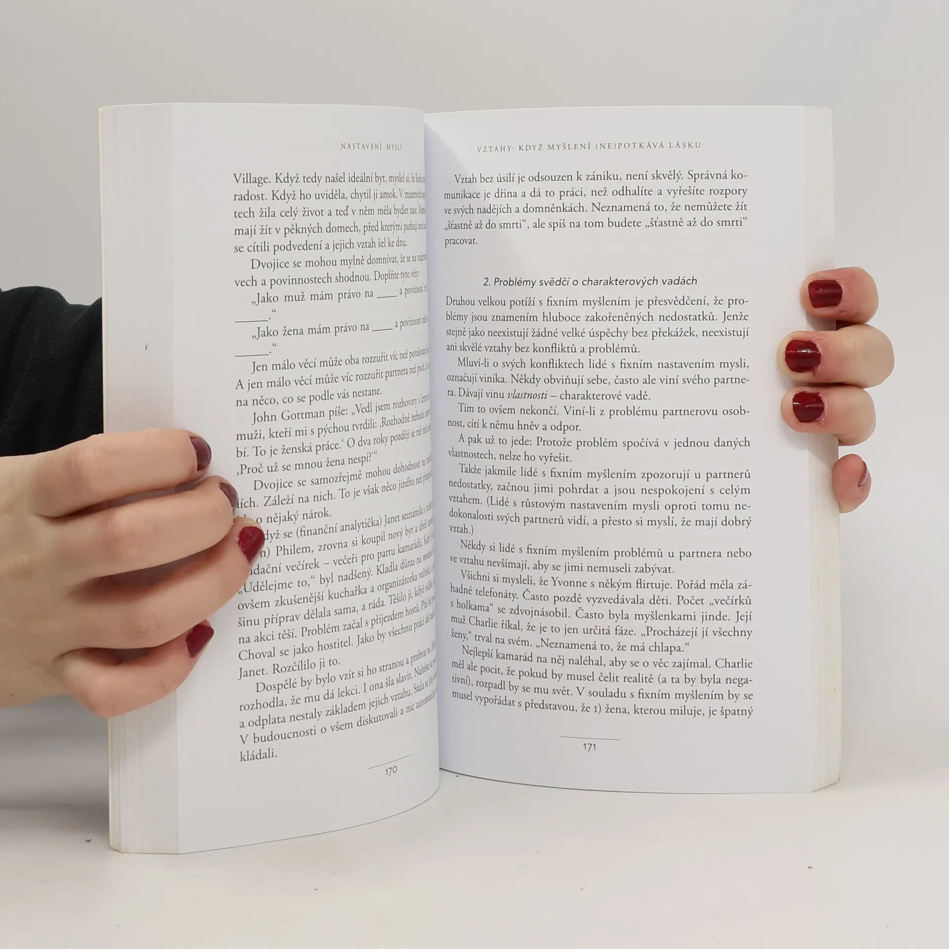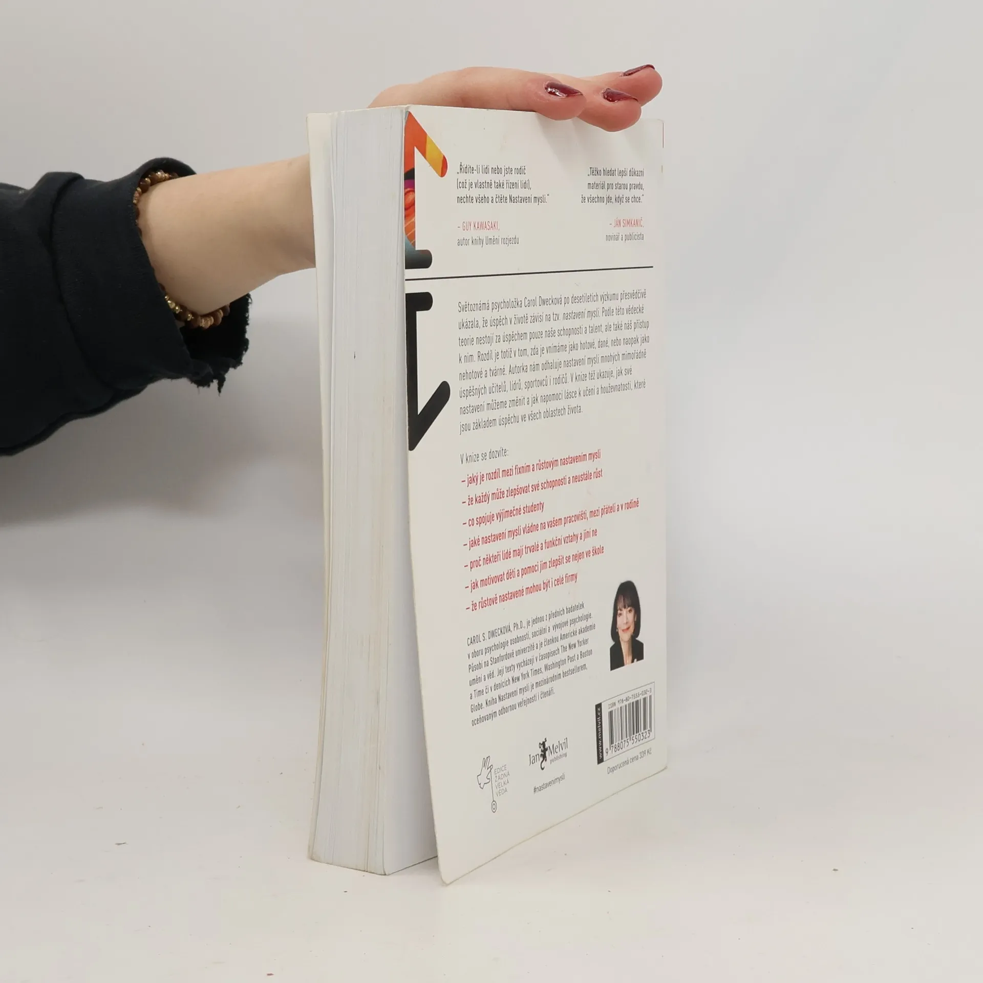 Jednoduchá myšlenka, kolem níž se tato kniha točí, a za níž stojí desítky let vědeckého výzkumu, se dá vyjádřit zhruba takto: úspěch máme ve svých hlavách. Profesorka Dwecková se svým týmem na Standfordské univerzitě zjistila, že svou přirozeností tíhneme ke dvěma relativně vyhraněným způsobům myšlení o sobě a své úspěšnosti: k myšlení růstovému a myšlení fixnímu (angl. „growth mindset“ a „fixed mindset“). To, které myšlení u nás převládá, pak významně ovlivňuje naši reálnou úspěšnost. Ke zjištěním Dweckové popsaným v knize patří nadějný závěr, že se navzdory své dispozici dokážeme během života změnit, a autorka ukazuje, jak na to: jak využít svůj plný potenciál. Chcete vědět, jak přesně se dva zmíněné typy myšlení projevují? Typickým rysem fixního myšlení je vzdávání se před překážkou, neschopnost přijímat zpětnou vazbu, špatný pocit při vnímání úspěchu ostatních, vyhýbání se výzvám a negativní postoj k úsilí jako takovému. Naopak růstové myšlení se projevuje vřelým vztahem k výzvám, vytrvalostí při čelení překážkám, pozitivním vztahem ke kritice. Růstově myslící člověk vnímá úsilí jako cestu k mistrovství a v úspěchu druhých vidí inspiraci.