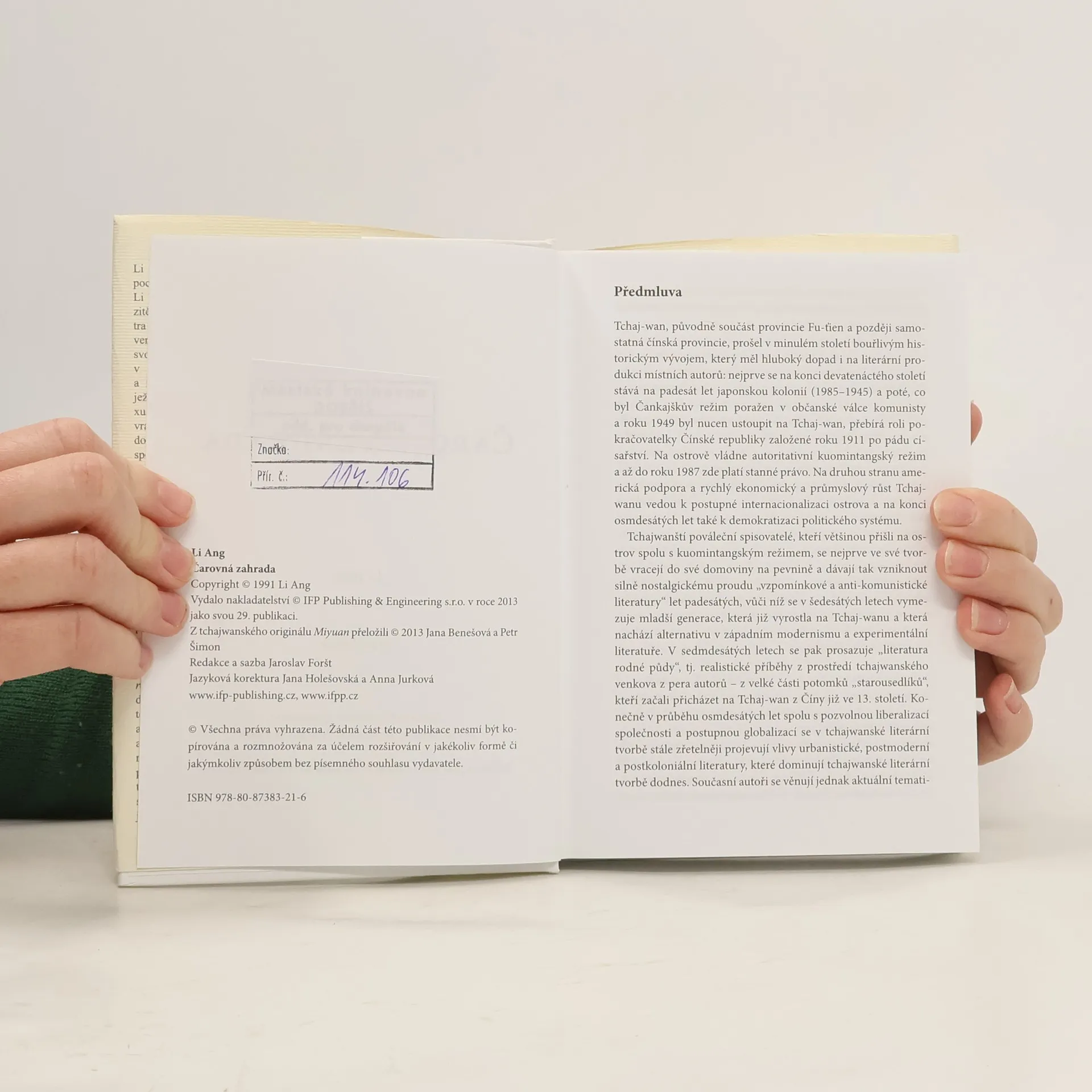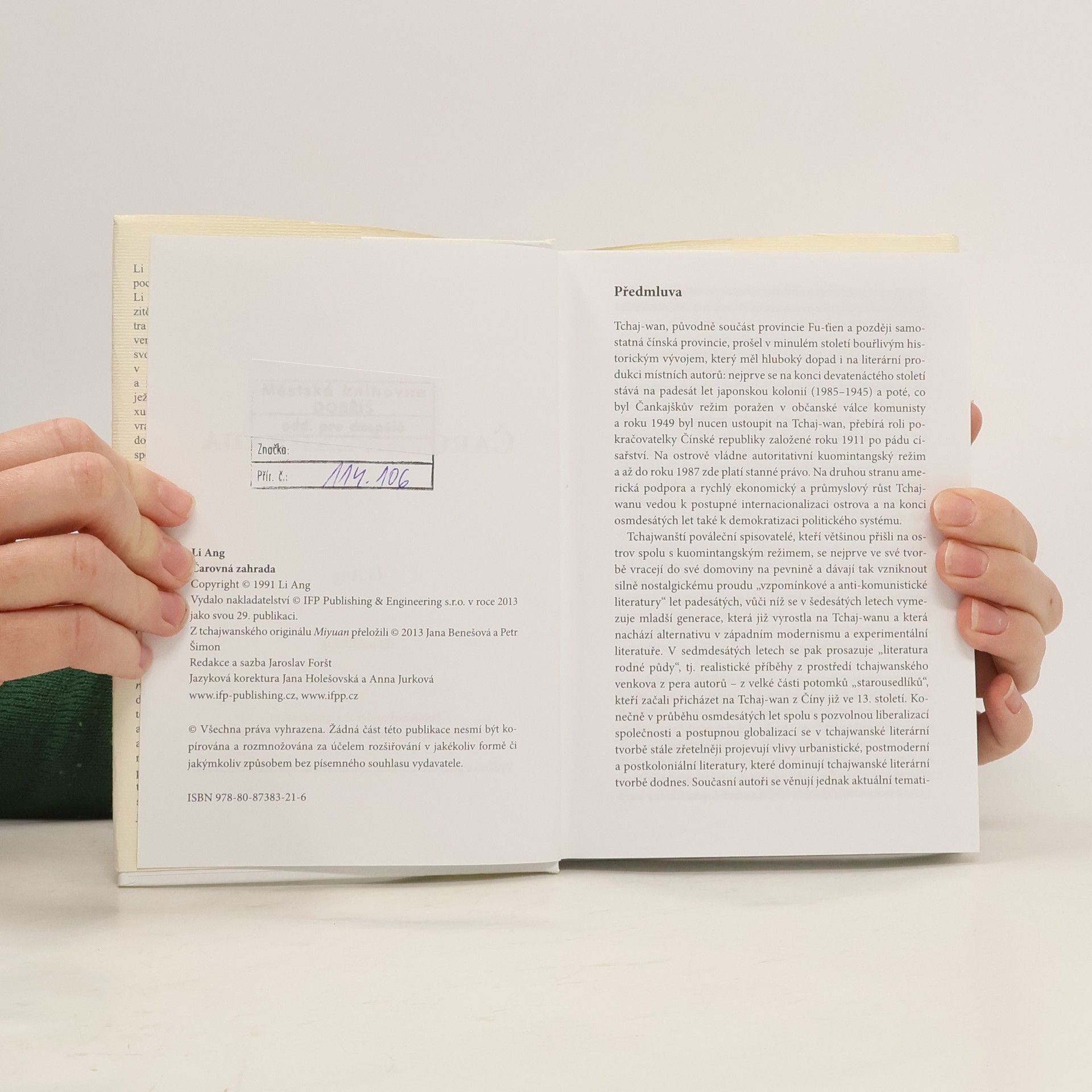 Kniha Čarovná zahrada, spolupráce s Národním muzeem Tchajwanské literatury, představuje autorku Li Ang, jednu z nejuznávanějších tchajwanských spisovatelek. Její dílo se vyznačuje kritickým tónem a kontroverzními tématy, jako jsou ženská sexualita, genderové otázky a jejich spojení se společenským životem Tchaj-wanu. Příběh sleduje postavu Ču Jing-chung z fiktivního rodu Ču a dotýká se historických událostí, od První čínsko-japonské války po modernizaci osmdesátých let. Milostný příběh hlavní hrdinky se prolíná s rodinnou historií, čímž autorka rozšiřuje historické povědomí o Tchaj-wanu a pokouší se o národní alegorii. Hlavní hrdinka se snaží o sebepoznání a její otec, symbolizující upadající elitu, nahrazuje čínské rostliny tchajwanskými, čímž vyjadřuje svou identitu a lásku k Tchaj-wanu. Na konci románu Ču Jing-chung zrekonstruuje rodinnou zahradu a daruje ji veřejné nadaci, aby patřila lidem Tchaj-wanu. Dílo tak nejen nabízí zajímavý příběh, ale i možnost seznámit se s kulturou a historií Tchaj-wanu, jehož novodobé dějiny se v mnoha aspektech podobají těm našim.