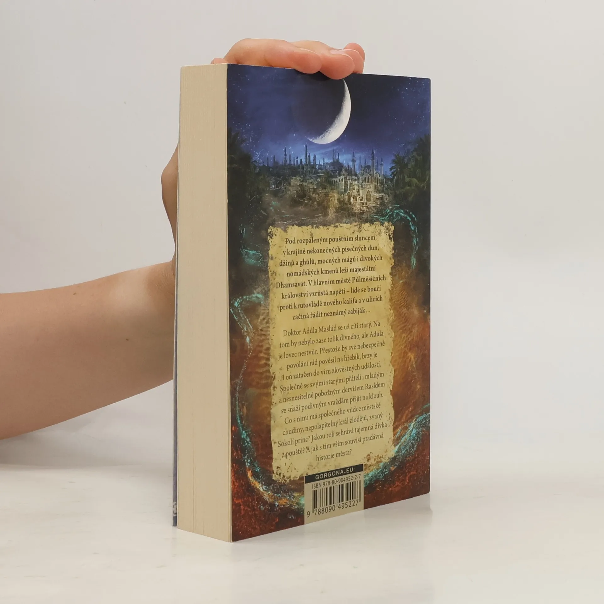 Pod rozpáleným pouštním sluncem, v krajině nekonečných písečných dun, džinů a ghúlů, mocných mágů i divokých nomádských kmenů leží majestátní Dhamsavát. V hlavním městě Půlměsíčních království vzrůstá napětí – lidé se bouří proti krutovládě nového kalifa a v ulicích začíná řádit neznámý zabiják… Doktor Adúla Maslúd se už cítí starý. Na tom by nebylo zase tolik divného, ale Adúla je lovec nestvůr. Přestože by své nebezpečné povolání rád pověsil na hřebík, brzy je i on zatažen do víru zlověstných událostí. Společně se svými starými přáteli i mladým a nesnesitelně pobožným dervišem Rasídem se snaží podivným vraždám přijít na kloub. Co s nimi má společného vůdce městské chudiny, nepolapitelný král zlodějů, zvaný Sokolí princ? Jakou roli sehrává tajemná dívka z pouště? A jak s tím vším souvisí pradávná historie města?