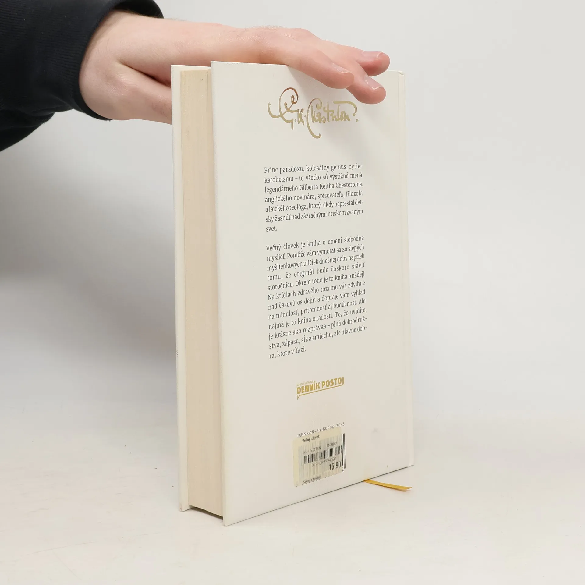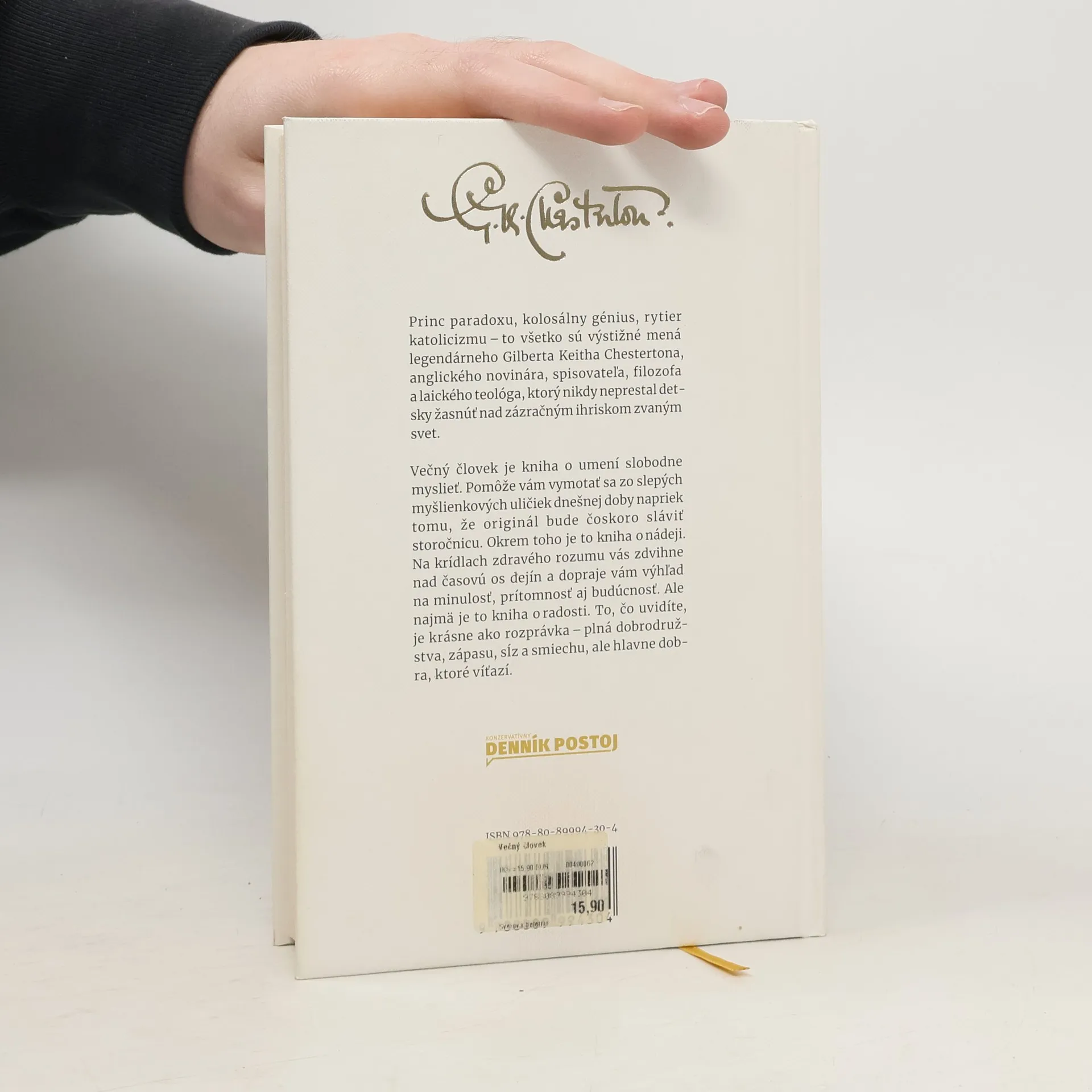 Princ paradoxu, kolosálny génius, rytier katolicizmu to všetko sú výstižné mená legendárneho Gilberta Keitha Chestertona, anglického novinára, spisovateľa, filozofa a laického teológa, ktorý nikdy neprestal detsky žasnúť nad zázračným ihriskom zvaným svet. Večný človek je kniha o umení slobodne myslieť. Pomôže vám vymotať sa zo slepých myšlienkových uličiek dnešnej doby napriek tomu, že originál bude čoskoro sláviť storočnicu. Okrem toho je to kniha o nádeji. Na krídlach zdravého rozumu vás zdvihne nad časovú os dejín a dopraje vám výhľad na minulosť, prítomnosť aj budúcnosť. Ale najmä je to kniha o radosti. To, čo uvidíte, je krásne ako rozprávka plná dobrodružstva, zápasu, sĺz a smiechu, ale hlavne dobra, ktoré víťazí.