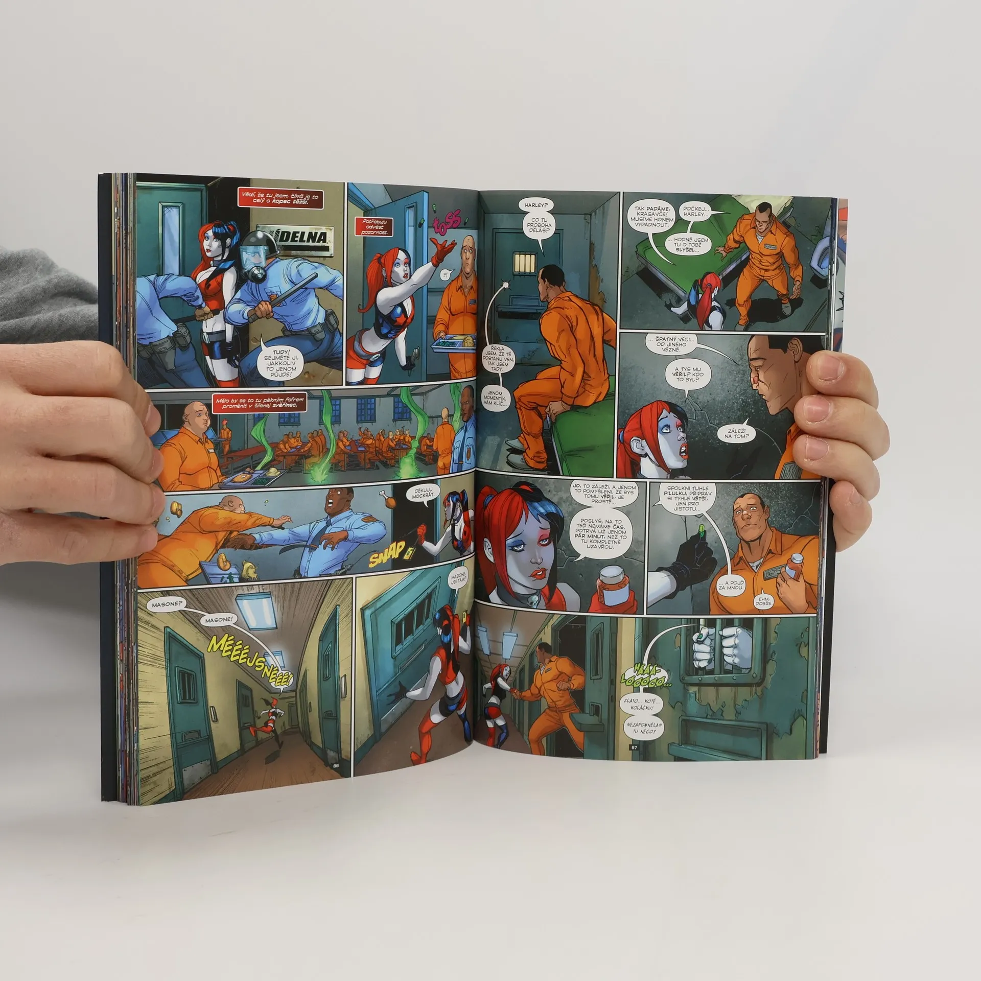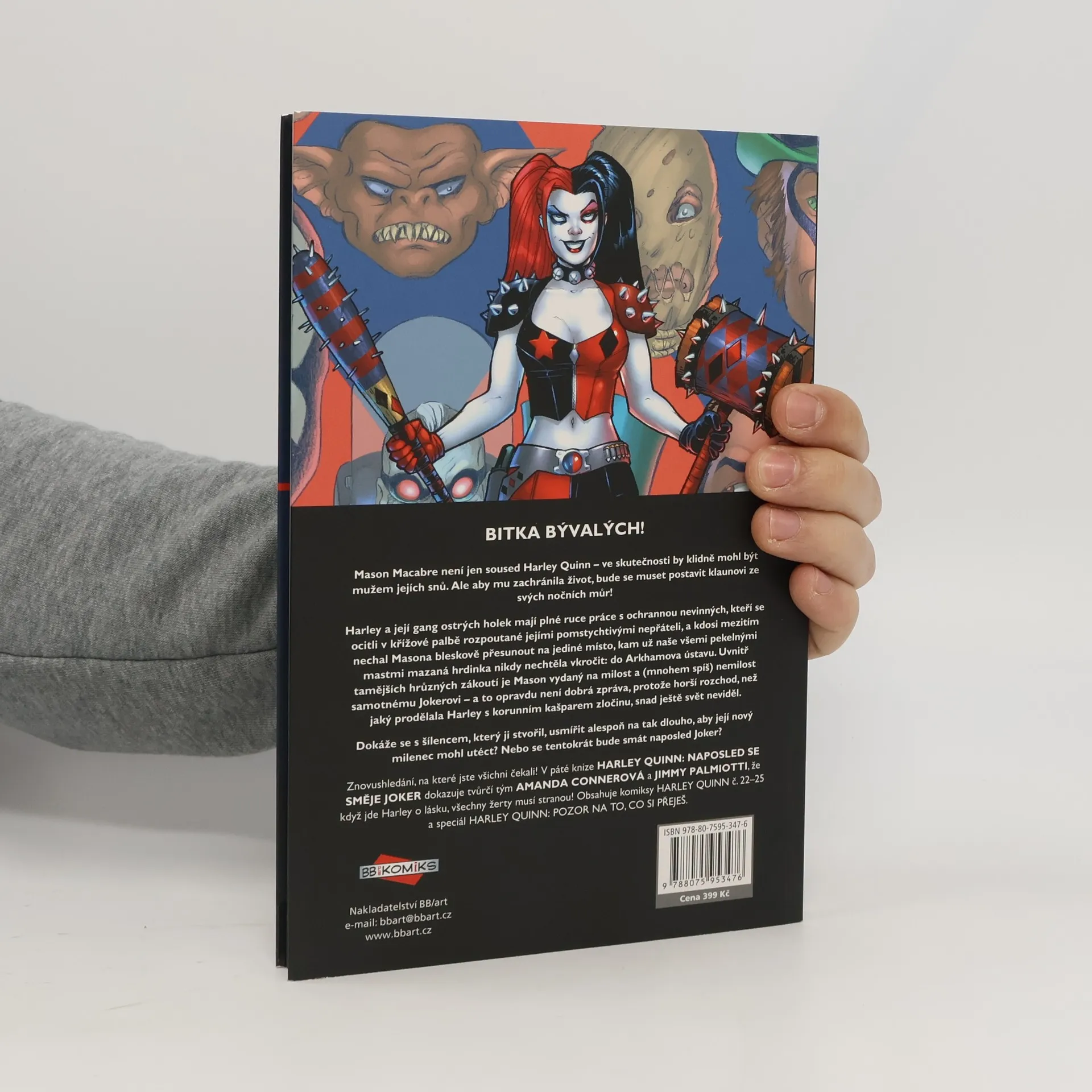 BITKA BÝVALÝCH! Mason Macabre není jen soused Harley Quinn – ve skutečnosti by klidně mohl být mužem jejích snů. Ale aby mu zachránila život, bude se muset postavit klaunovi ze svých nočních můr! Harley má se svým gangem ostrých holek plné ruce práce s ochrannou nevinných, kteří se ocitli v křížové palbě rozpoutané jejími pomstychtivými nepřáteli, a kdosi mezitím nechal Masona bleskově přesunout do toho jediného místa, kam už naše všemi pekelnými mastmi mazaná hrdinka nikdy nechtěla vkročit: do Arkhamova ústavu. Uvnitř tamějších hrůzných zákoutí je Mason vydaný na milost a (mnohem spíš) nemilost samotnému Jokerovi – a to opravdu není dobrá zpráva, protože horší rozchod, než měla Harley s korunním kašparem zločinu, snad ještě svět neviděl. Dokáže se s šílencem, který ji stvořil, usmířit alespoň na tak dlouho, aby její nový milenec dokázal utéct? Nebo se tentokrát bude smát naposled Joker? Znovushledání, na které jste všichni čekali! V páté knize HARLEY QUINN: NAPOSLED SE SMĚJE JOKER dokazuje tvůrčí tým AMANDA CONNEROVÁ a JIMMY PALMIOTTI, že když jde Harley o lásku, všechny žerty musí stranou! Obsahuje komiksy HARLEY QUINN č. 22–25 a speciál HARLEY QUINN: POZOR NA TO, CO SI PŘEJEŠ.