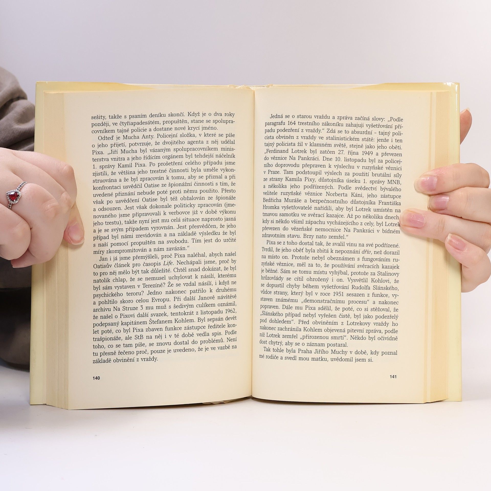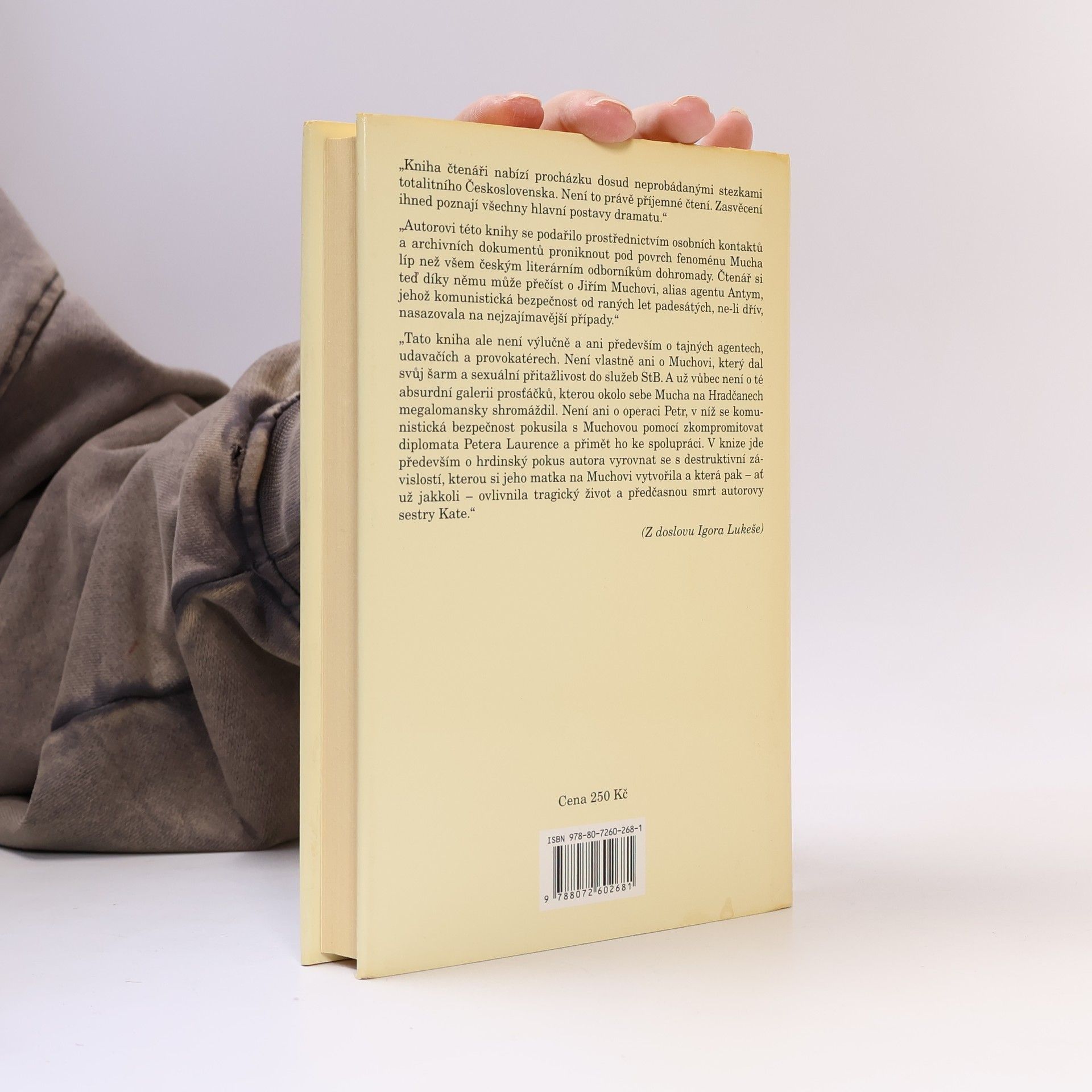 Autobiografická kniha novináře Charlese Laurence, jehož otec byl britským diplomatem, zachycuje příběh rodiny žijící v Praze v padesátých letech, což mělo na jejich životy zásadní dopad. Autor, jako malý chlapec, vnímal jen fragmenty událostí kolem sebe, což dodává knize kouzlo a hloubku. Po roce 1989 se Laurence vrací do Prahy, aby na základě rozhovorů a dokumentů odhalil důvody dočasného odvolání svého otce a jeho vliv na matku a sestru. Dva rozhovory s Geraldinou Muchovou, manželkou Jiřího Muchy, rámují celý příběh. Autor zjišťuje, že milostná aféra jeho matky s Jiřím Muchou byla součástí operace Státní bezpečnosti, v níž Mucha hrál roli "společenského agenta". Kniha se tak stává "klíčovým románem", v němž se objevují známé osobnosti české kultury a jejich role ve špionážní hře studené války. Laurence poskytuje nový pohled na Muchovu činnost za komunistického režimu a na mechanismy, jimiž Státní bezpečnost získávala informace a kontrolovala občany. Jiří Mucha, syn Alfonse Muchy, byl novinář, spisovatel, vězeň komunistického režimu a pozdější předseda československého PEN klubu. Kniha je přeložena z anglického originálu a obsahuje fotografii Jiřího Muchy.