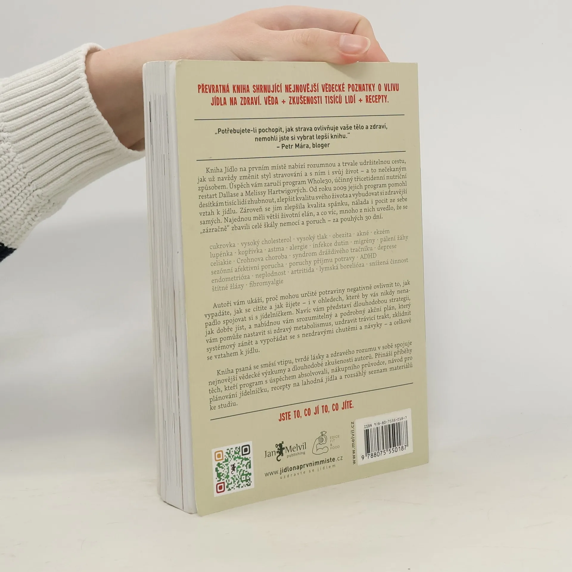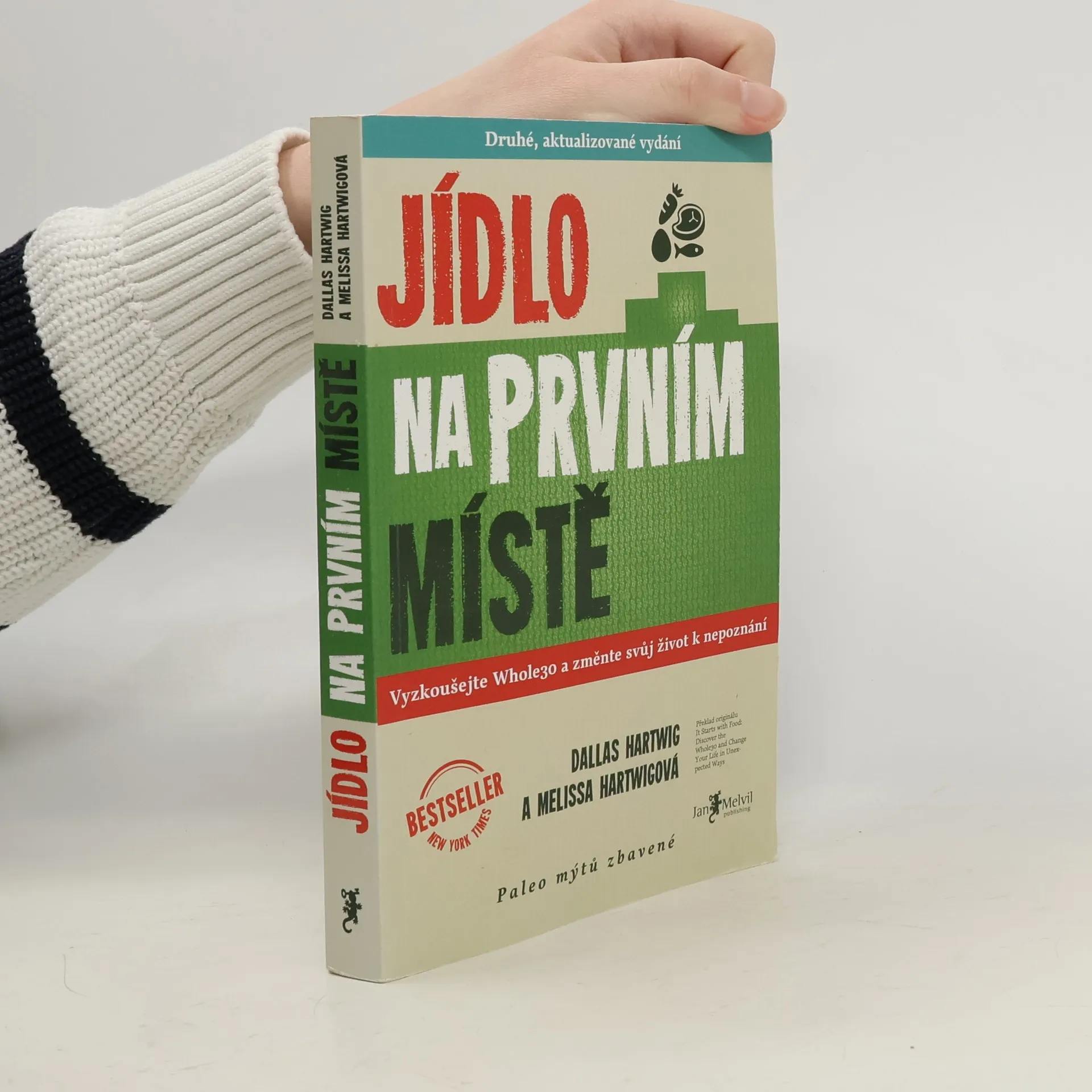 Jídlo na prvním místě není řadová kniha o paleodietě, tohle je Melvilem pečlivě zvolený vstupní titul nabízející skutečnou životní změnu. Že nemáte tušení, co to je paleodieta? Všichni víme, že jídlo ovlivňuje kvalitu našeho života – ale jak velkou moc vlastně má? Melissa a Dallas vás přesvědčí, že mimořádnou! Jídlo na prvním místě je přehledný, čtivý a srozumitelný návod, díky kterému konečně pochopíte vzájemné reakce inzulínu, leptinu, kortizolu a glukagonu. Autoři vám na podkladě vědeckých výzkumů vysvětlí fakt, proč sacharidy v naší stravě nejsou tím nejpříznivějším palivem a že paleodieta je nejlepší způsob, jak je nahradit. Autoři tvrdí, že už během 30 dnů po změně stravovacího plánu sestaveného podle jejich instrukcí dochází ke zlepšení stavu mnoha chronických, obtížně léčitelných onemocnění, jako jsou cukrovka, lupénka, Crohnova choroba, endometriáza, ekzémy a dalších. Množství receptů a tipů je doplněno vysvětlením, co jak na jednotlivá jídla reaguje naše tělo. Sympatičtí autoři vás postupně a s humorem převedou k zdravým návykům, díky nimž dochází ke zlepšení stavu celého těla, hormonální rovnováze, ústupu zažívacích obtíží a redukci zánětlivých procesů. Hartwigovi jsou tvrďáci. 30 dní jejich kůry je velmi náročný měsíc, ale jak sami říkají, je to pro vaše dobro: "Neodvažujte se namítat, že je to těžké. Skoncovat s heroinem je těžké. Porazit rakovinu je těžké. Pít kávu bez mléka NENÍ TĚŽKÉ!" 2. aktualizované vydání