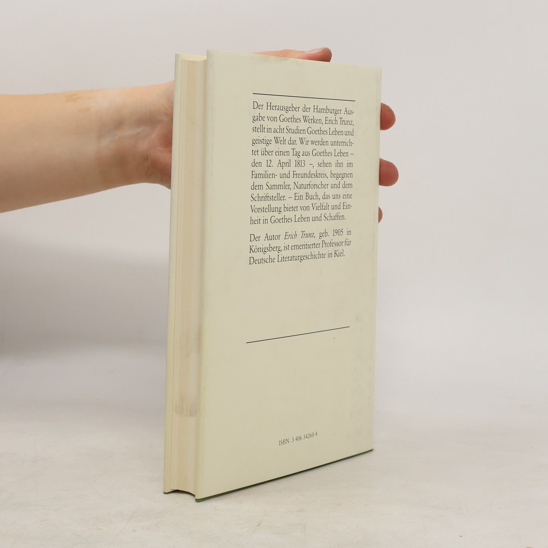 Dieses Buch will dem Fachmann wie dem Literaturliebhaber einen Zugang zu Goethes Leben und Werk eröffnen. In der ersten der hier versammelten acht Studien - die dem Band zugleich seinem Namen gab - erleben wir einen Tag aus Goethes Leben, alltägliche Verrichtungen und die Ereignisse des 12. April 1813. Der detailreiche Bericht liest wie eine Erzählung, er ist jedoch aus genauester Quellenkenntnis und einer lebenslangen Beschäftigung mit Goethe erwachsen. Die weiteren Studien zeigen ihn im Familien- und Freundeskreis, als Sammler, Schriftsteller und Naturforscher. Den Abschluß bildet ein Bericht des Verfassers aus der Werkstatt der Hamburger Goethe-Ausgabe. Das Buch bietet einen ungewöhnlichen Einblick in Vielfalt und Einheit von Goethes Leben und Schaffen. „Erich Trunz hat sich ein Leben lang mit Goethe beschäftigt, und das ist diesen Arbeiten in jeder Zeile anzumerken. Trunz beschaut und beschreibt Goethe mit dem Blick eines Freundes, doch niemals indiskret und niemals ohne eine taktvolle Distanz.“ Eckart Kleßmann, FAZ „Wer über Goethes Alltag Bescheid wissen will, liest von den vergnüglichsten wie wissenswertesten Dingen in dem 1990 erstmals gedruckten Buch Ein Tag aus Goethes Leben.“ Hajo Steinert, DeutschlandRadio Köln