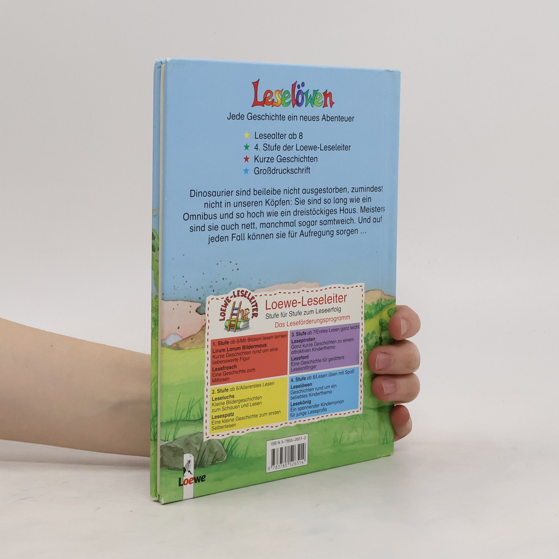 Lesealter ab 8 4. Stufe der Loewe-Leseleiter Kurze Geschichten Großdruckschrift Dinosaurier sind beileibe nicht ausgestorben, zumindest nicht in unseren Köpfen: Sie sind so lang wie ein Omnibus und so hoch wie ein dreistöckiges Haus. Meistens sind sie ja auch nett, manchmal sogar samtweich. Und auf jeden Fall können sie für Aufregung sorgen.