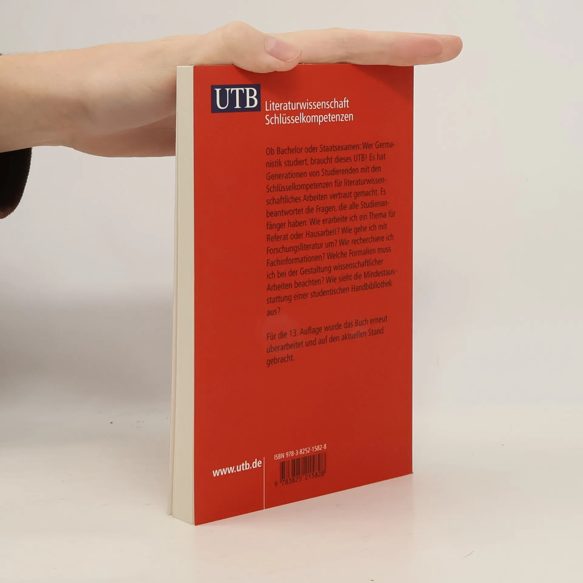 Ob Bachelor oder Staatsexamen: Wer Germanistik studiert, braucht dieses UTB! Es hat Generationen von Studierenden mit den Schlüsselkompetenzen für literaturwissenschaftliches Arbeiten vertraut gemacht. Es beantwortet die Fragen, die alle Studienanfänger haben: Wie erarbeite ich ein Thema für Referat oder Hausarbeit? Wie gehe ich mit Forschungsliteratur um? Wie recherchiere ich Fachinformationen? Welche Formalien muss ich bei der Gestaltung wissenschaftlicher Arbeiten beachten? Wie sieht die Mindestausstattung einer studentischen Handbibliothek aus?