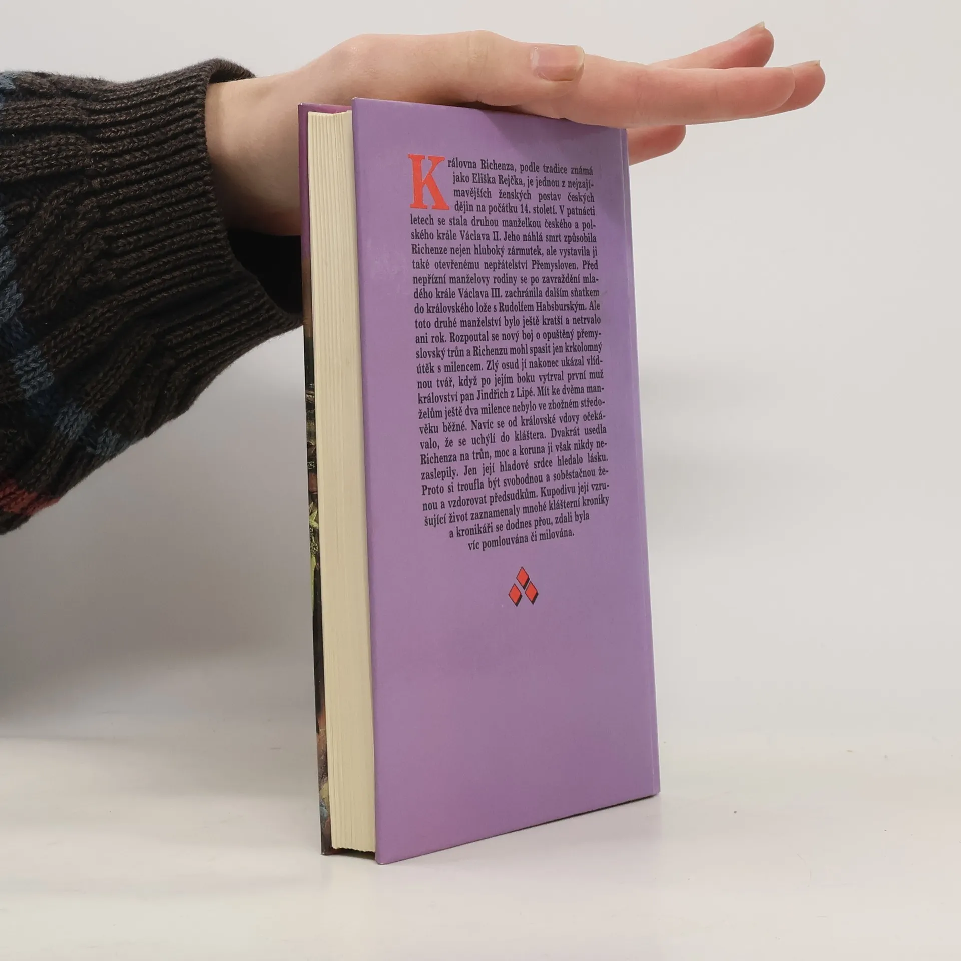 Královna Richenza. Hlavní postavou románu je královna Richenza, jedna z nejzajímavějších ženských postav českých dějin na počátku 14. století. Dvakrát usedla Richenza na trůn, moc a koruna ji však nikdy nezaslepily. Jen její hladové srdce hledalo lásku. Proto si troufla být svobodnou ženou a vzdorovat předsudkům, kterým může být vystavena i královna, jež nepřestala milovat kdysi prvního muže království, pana Jindřicha z Lipé.... celý text