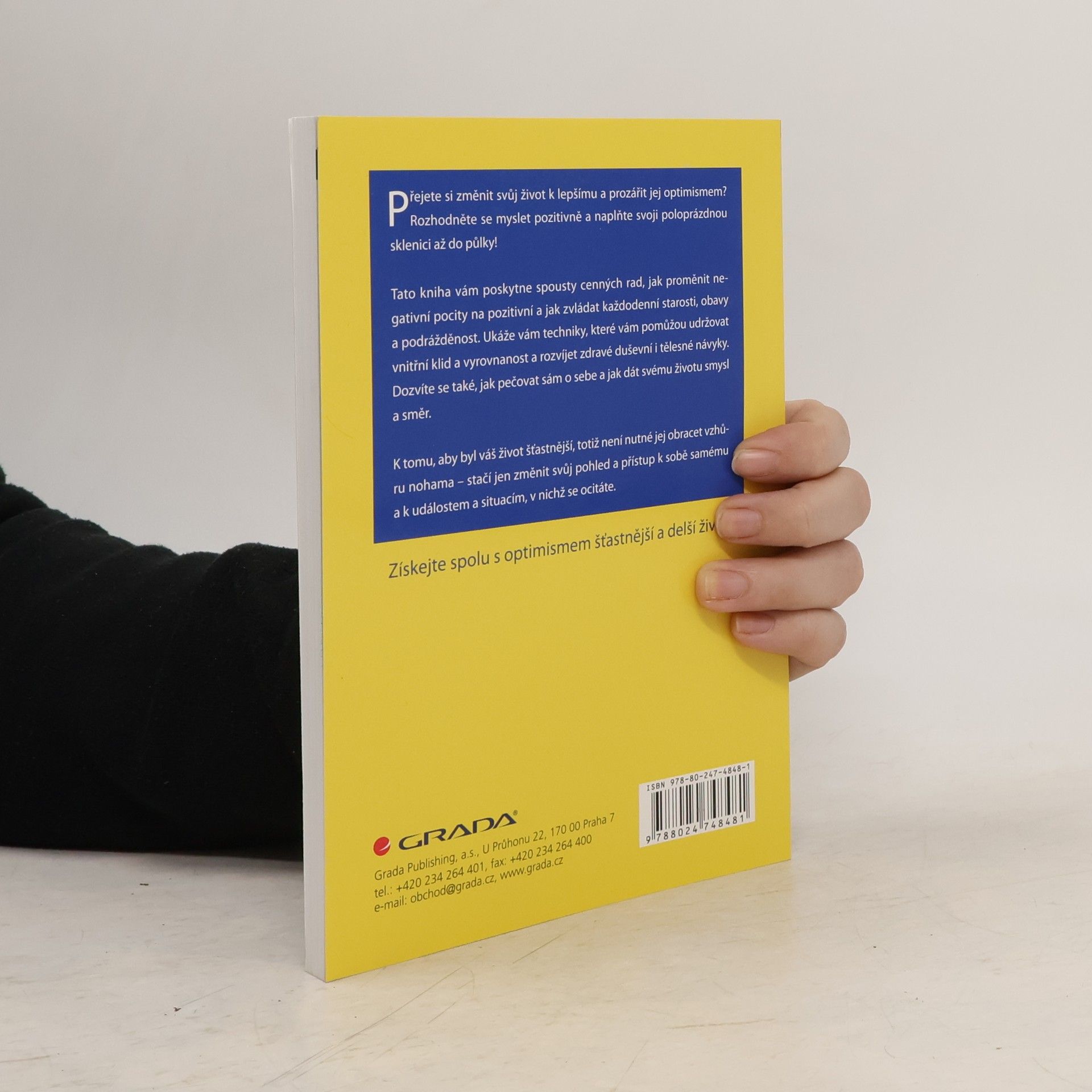 Jak myslet pozitivně a vyhnout se negativnímu myšlení, které vás svazuje? Jaké techniky vám pomůžou rozvinout zdravé duševní návyky? Pomocí jakých jednoduchých kroků změníte své negativní pocity na pozitivní? Jak čelit obavám a úzkosti? Jak zvládnout hněv a podráždění? Jak se vypořádat s negativně uvažujícími lidmi a omezit jejich vliv na sebe? Pozitivně myslet neznamená radovat se z prohry či bolesti, ani ignorovat a přehlížet problémy, je to schopnost akceptovat veškeré vzestupy a pády života, cítit vděk za to, co máme, a dívat se do budoucnosti s optimismem a nadějí. Díky této knížce se pro vás pozitivní myšlení stane vlastním a více si užijete života se všemi jeho stránkami. (jak změnit svůj přístup a dívat se na život optimisticky)